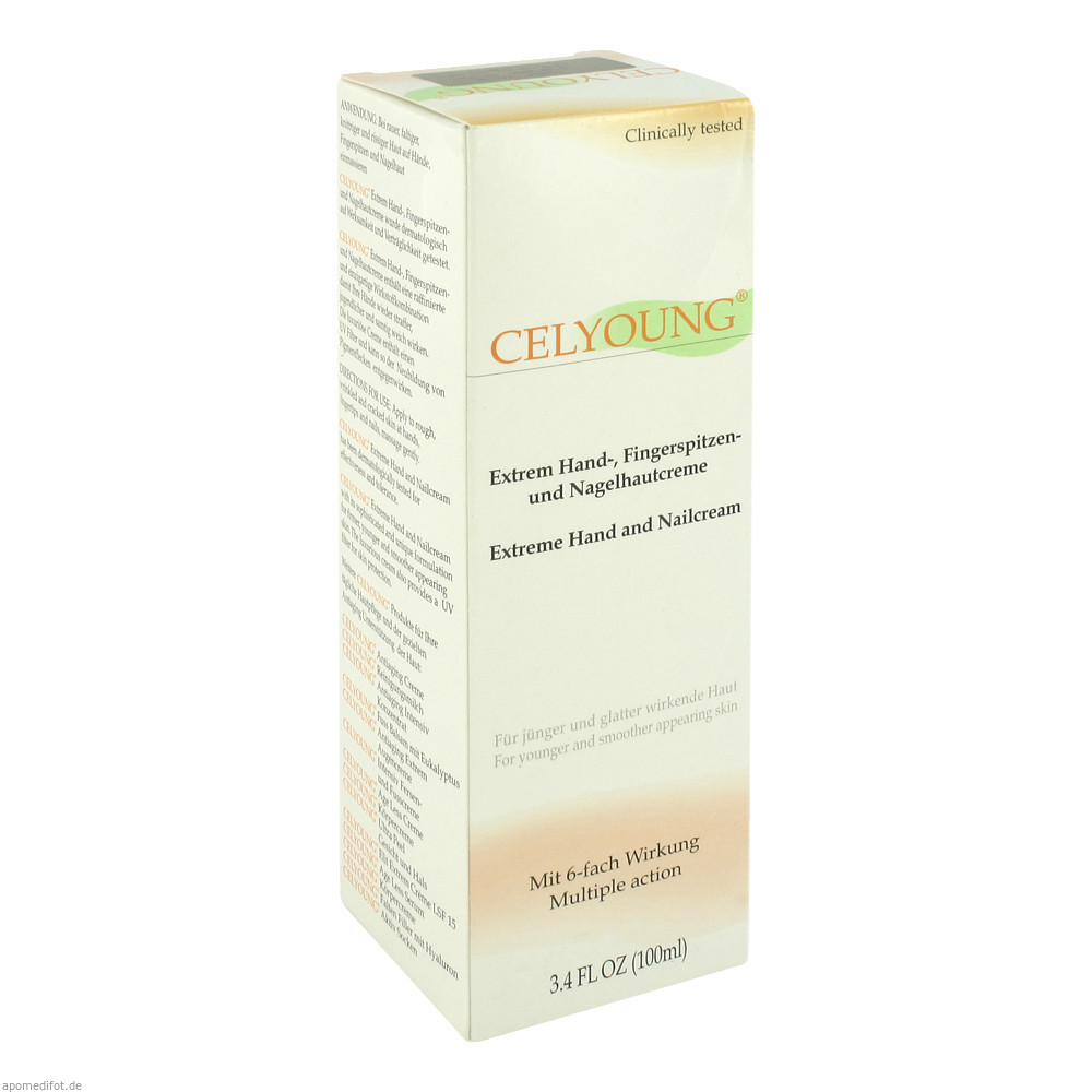 Die Celyoung Extrem Hand,-Fingerspitzen und Nagelhautcreme ist keine gewöhnliche Pflege oder Feuchtigkeitscreme. Die raffinierte Wirkstoffformel von Dr. Med. Peter Jackisch entwickelt (Antiaging Mediziner) ist die neueste Generation von intensiver Handpflegebehandlung gegen die sichtbaren Zeichen der Zeit (Hautalterung). Die neueste Entwicklung aus den Celyoung Laboratorien vermindert nicht nur die Falten sondern lässt die Haut an den Händen jünger, straffer, glatter und sichtbar gepflegter aussehen! Die Haut wirkt dicker und voller. Papierartige, älter wirkende Haut wirkt wieder vitaler und jünger. Ausserdem wurde ein UV Filter zum Sonnenschutz eingebaut der Neubildungen von Pigmentflecken entgegen wirken kann.