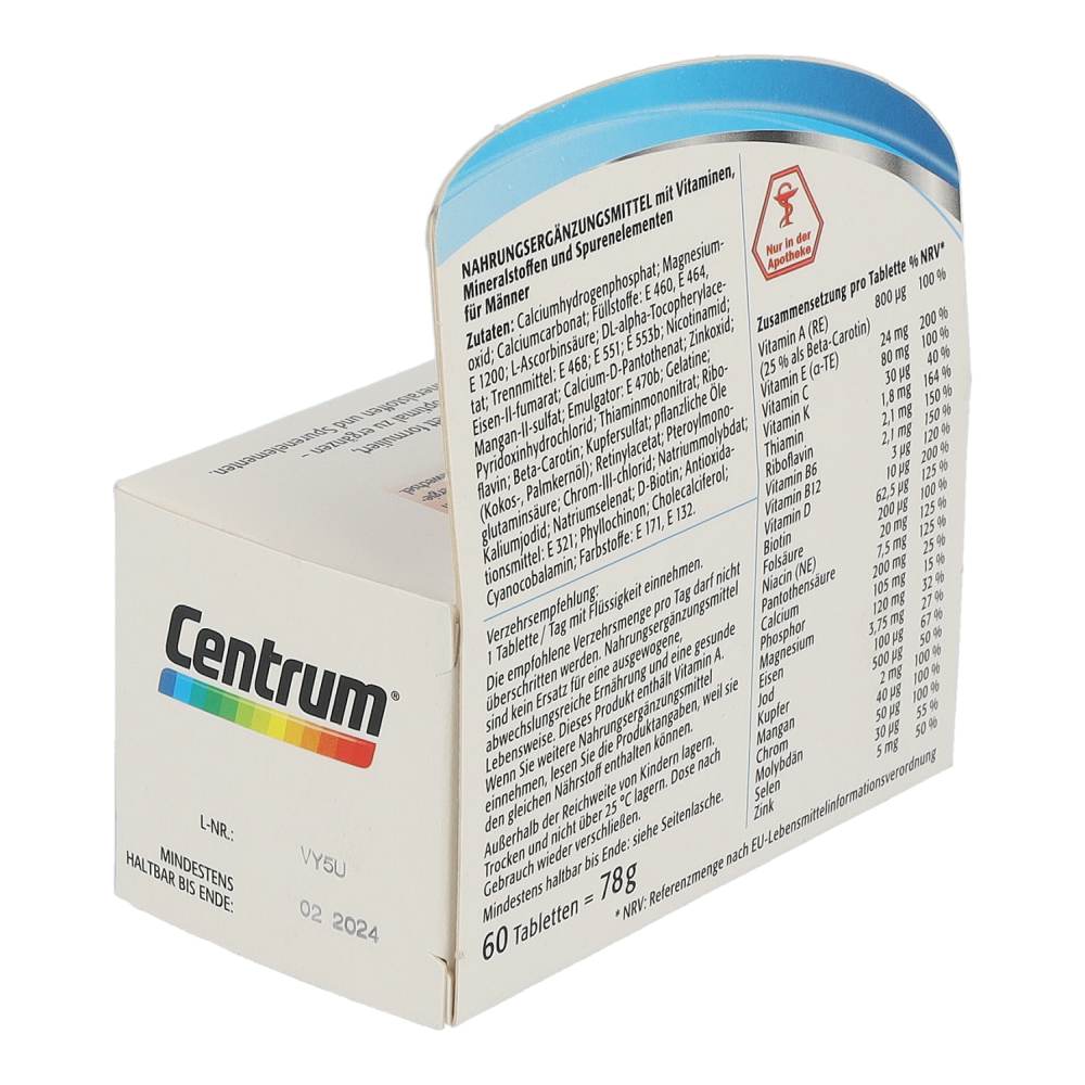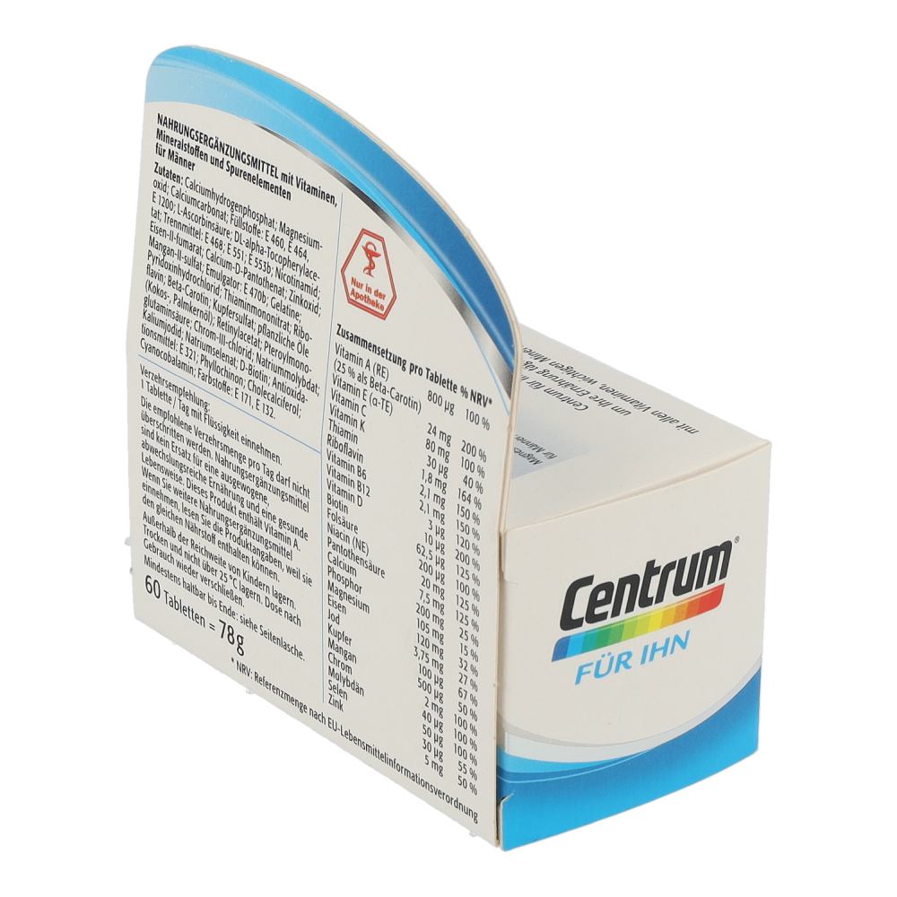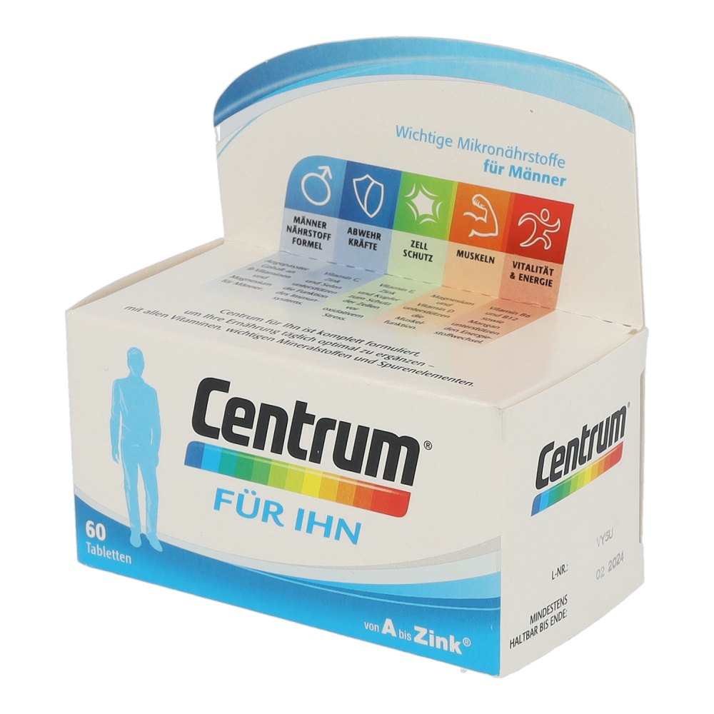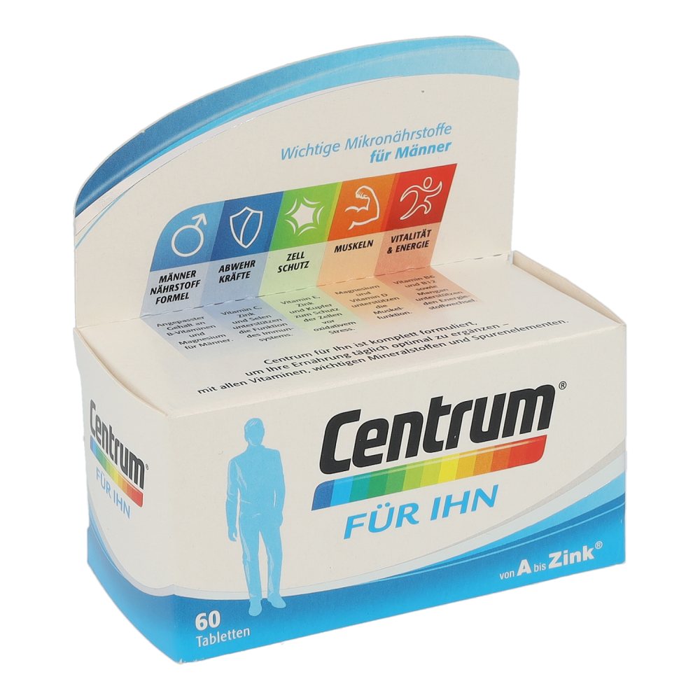 Centrum Für Ihn 50+ wurde an die Nährstoffbedürfnisse von Männern über 50 angepasst. Es leistet einen wertvollen Beitrag an wichtigen Vitaminen, Mineralstoffen und Spurenelementen, um ihre Ernährung optimal zu ergänzen. Besonders die B-Vitamine und Magnesium sind wichtig für die Erhaltung der Körperfunktionen von Männern.