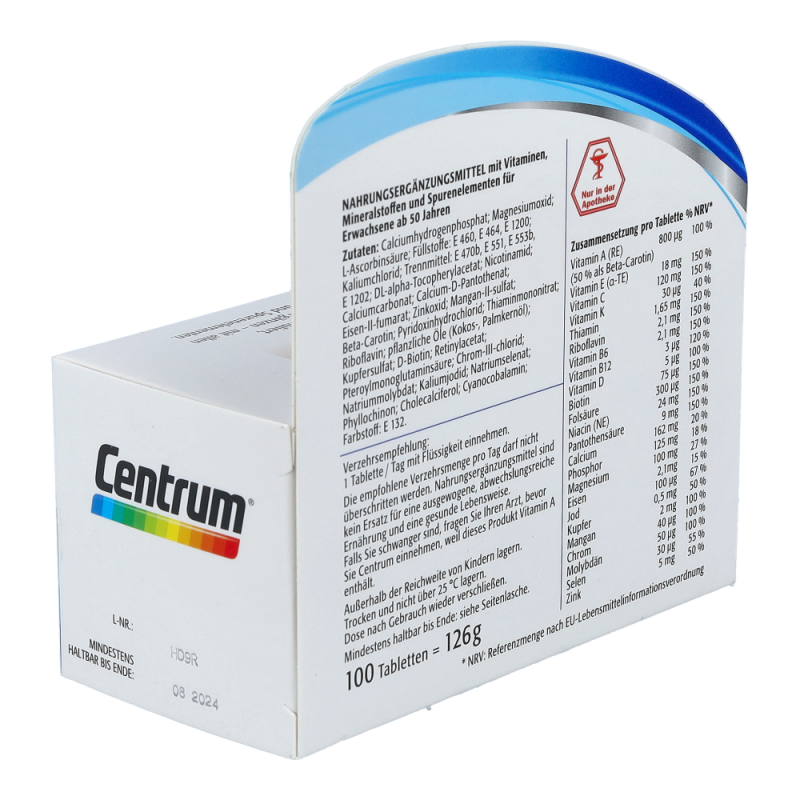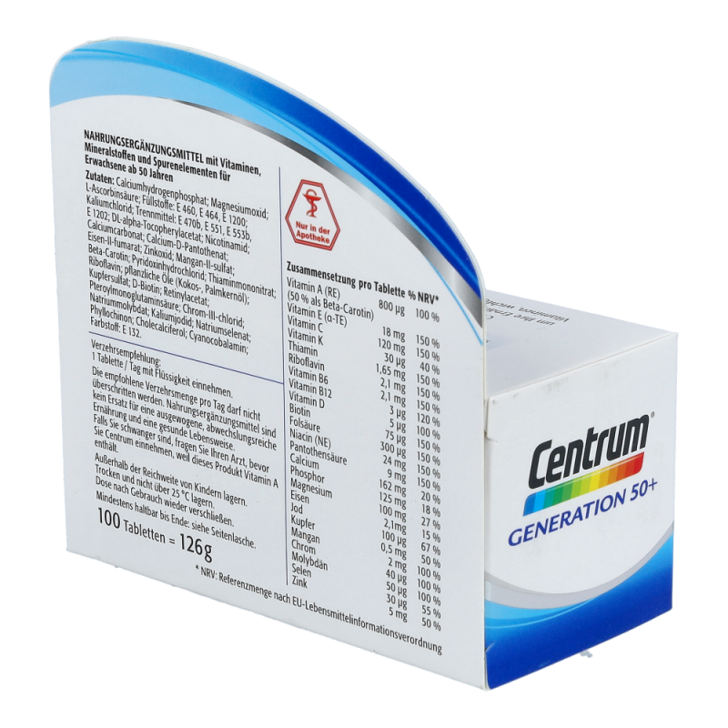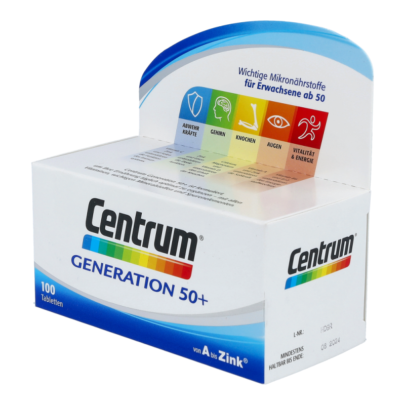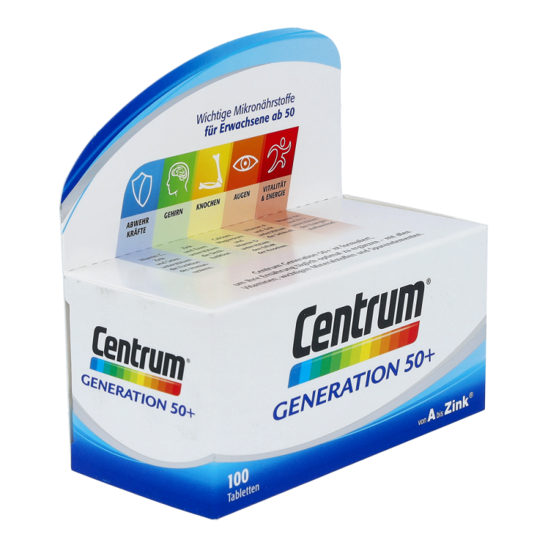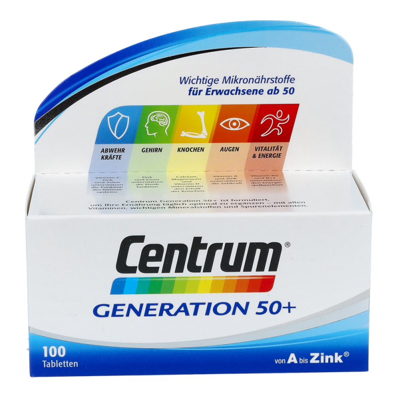 Centrum Capletten Generation 50+ sind für den Erhalt des Wohlbefindens und der Leistungsfähigkeit besonders wichtig. Nur eine Caplette trägt zur Deckung des Tagesbedarfs an allen wichtigen Vitaminen, Mineralstoffen und Spurenelementen bei.