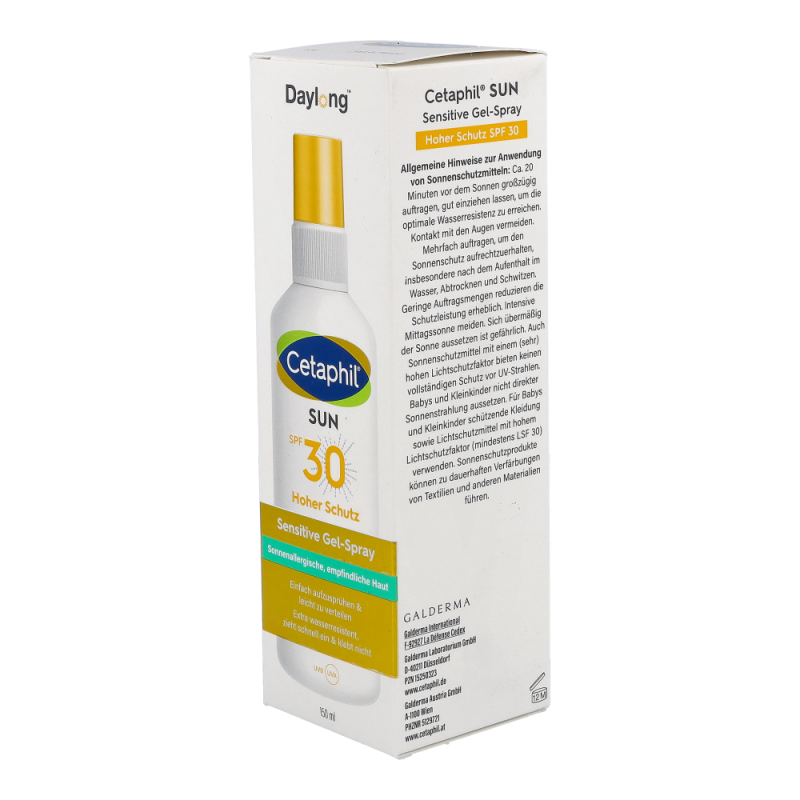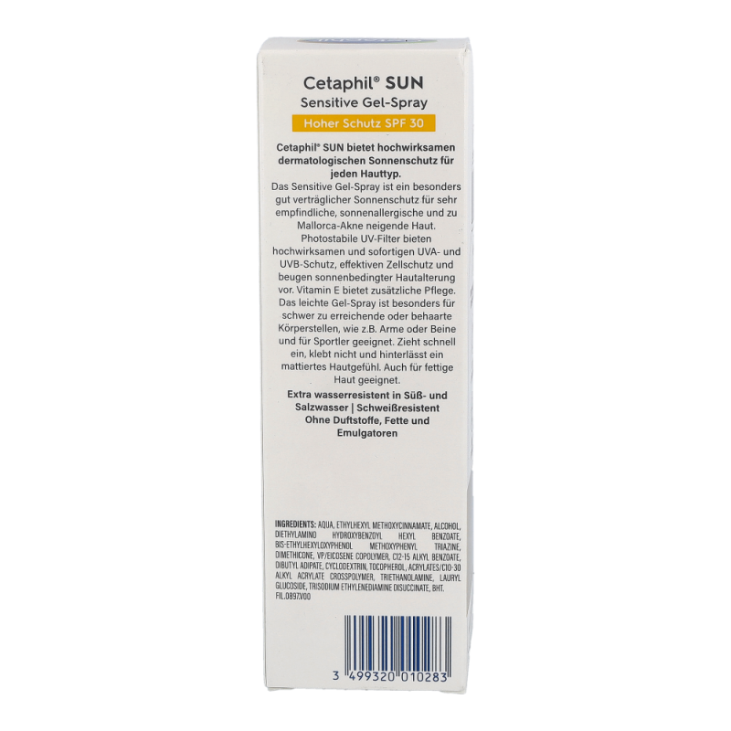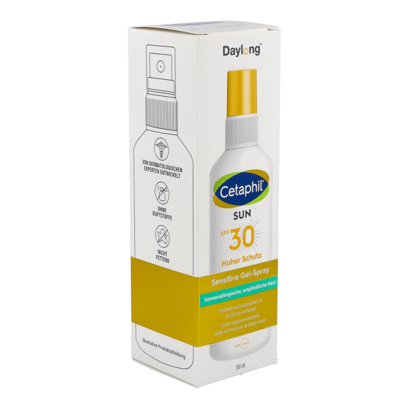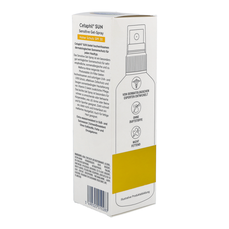 Cetaphil Sun Sensitive Gel-Spray SPF 30 ist besonders geeignet für zu Sonnenallergie neigende sowie fettige Haut. Es enthält weder Emulgatoren noch Fette, die in Kombination mit UVA-Strahlung die häufigsten Auslöser von Mallorca-Akne sind.