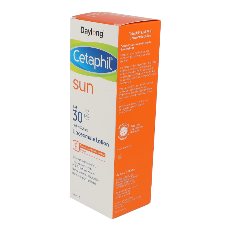 Cetaphil® Sun Daylong™ SPF 30 Liposomale Lotion eignet sich als Sonnencreme besonders für empfindliche oder trockene Haut. Die liposomale Lotion lässt sich leicht verteilen, zieht schnell ein, klebt und fettet nicht. Für ein angenehmes Hautgefühl. Zudem pflegt die liposomale Lotion die Haut mit Aloe Vera und Vitamin E und spendet wertvolle Feuchtigkeit. Photostabile UV-Filter bieten hochwirksamen und sofortigen UVA- und UVB-Schutz, effektiven Zellschutz1 und beugen sonnenbedingter Hautalterung1 vor.