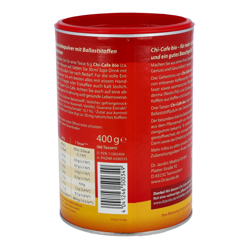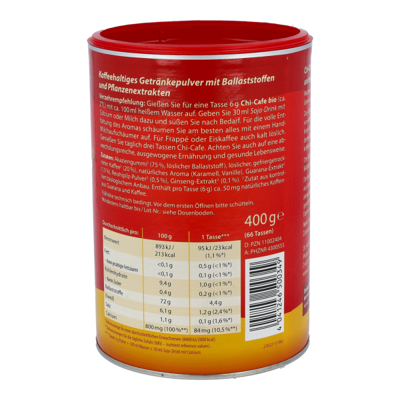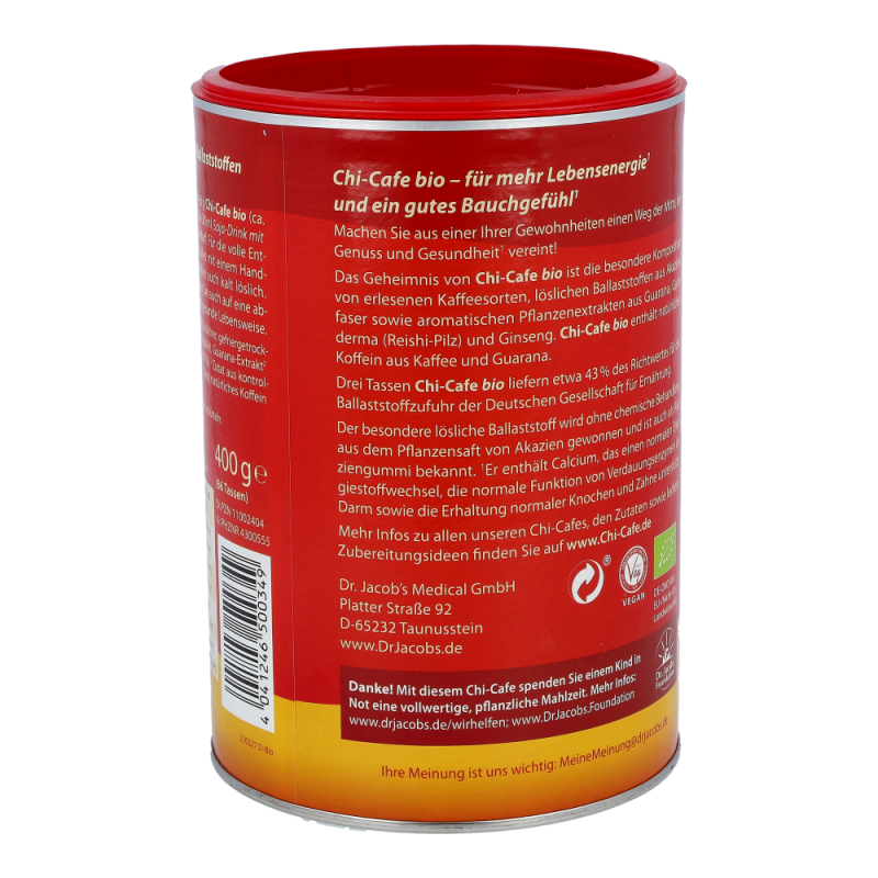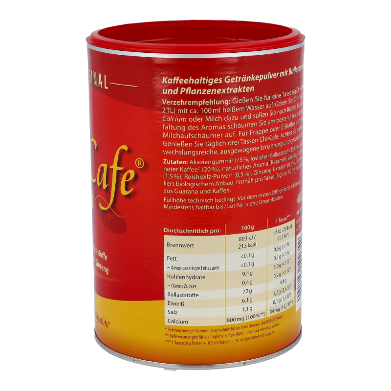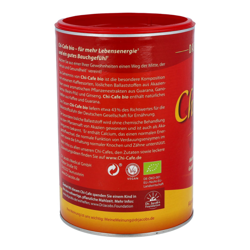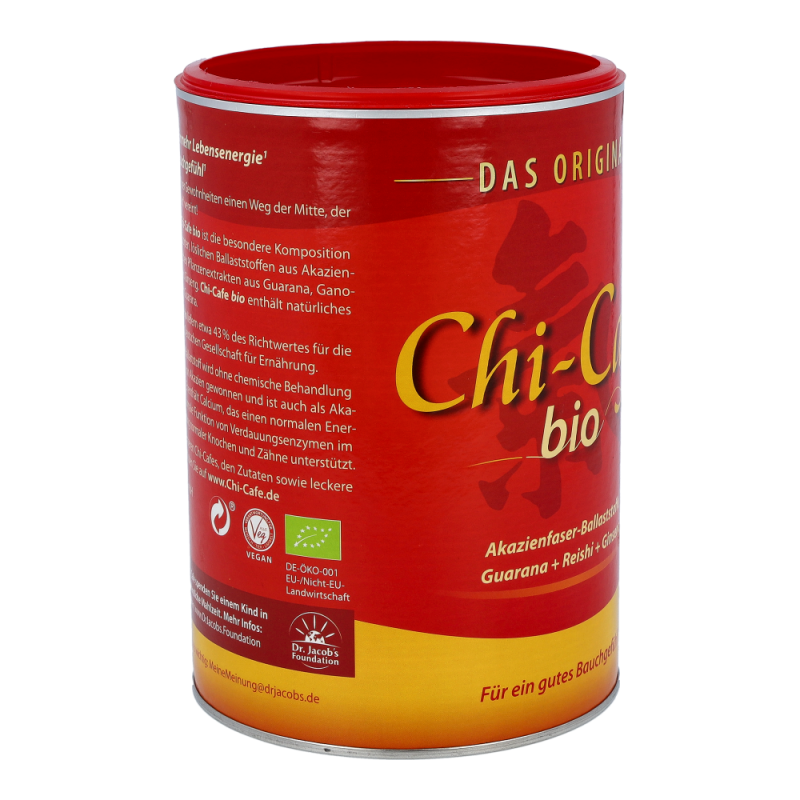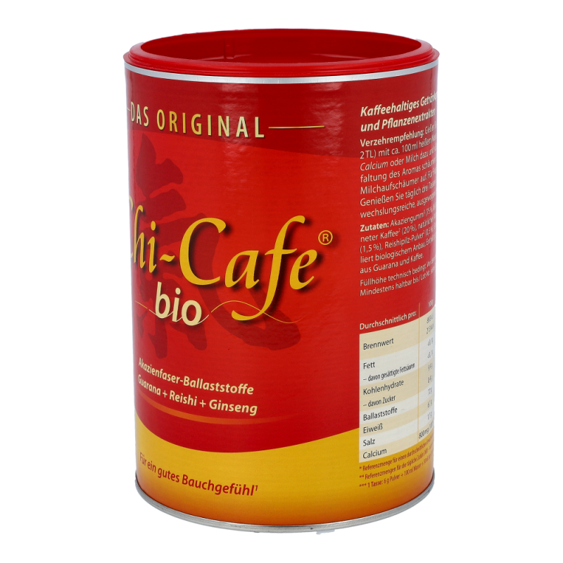 Chi-Cafe bio ist die besondere Komposition von löslichen Ballaststoffen aus der Akazienfaser, erlesenen Kaffeesorten sowie aromatischen Pflanzenextrakten aus Ganoderma (Reishi-Pilz), Guarana und Ginseng.