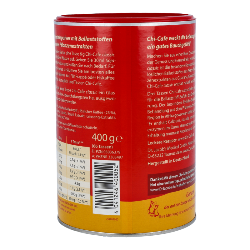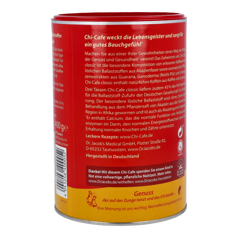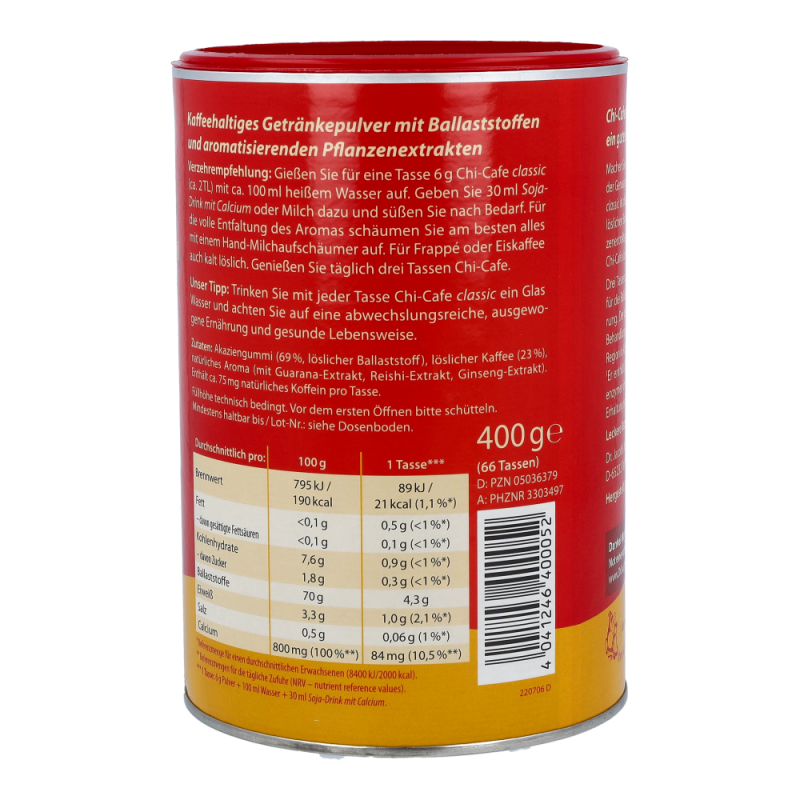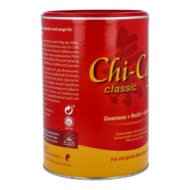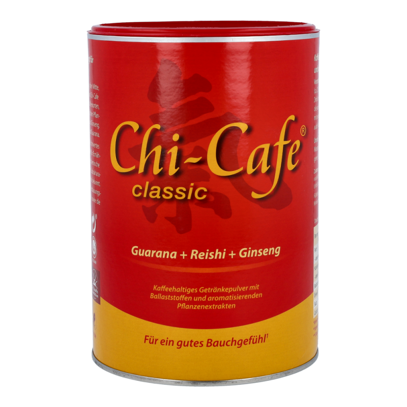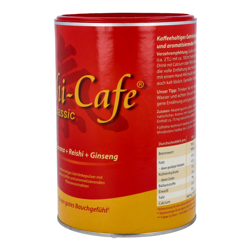 Chi-Cafe classic weckt das „Chi“, die Lebensenergie, und beflügelt Geist und Gemüt.(siehe 1,2)Das erste ballaststoffreiche Kaffeegetränk mit aromatischen Pflanzenextrakten sorgt für puren Genuss. Chi-Cafe classic ist eine Kombination von erlesenen Kaffeesorten, ergänzt mit besonderen Pflanzenextrakten aus Ginseng, Guarana und Reishi-Pilz, die für einen einmalig aromatischen Geschmack sorgen.1) Calcium unterstützt die Erhaltung normaler Knochen und Zähne, einen normalen Energie-Stoffwechsel und die normale Funktion von Verdauungsenzymen im Darm. Chi-Cafe classic ist gut für Darm und Verdauung.2) Pro Tasse Chi-Cafe classic sind etwa 75 mg Koffein enthalten, das die Aufmerksamkeit erhöht und die Konzentration verbessert.
