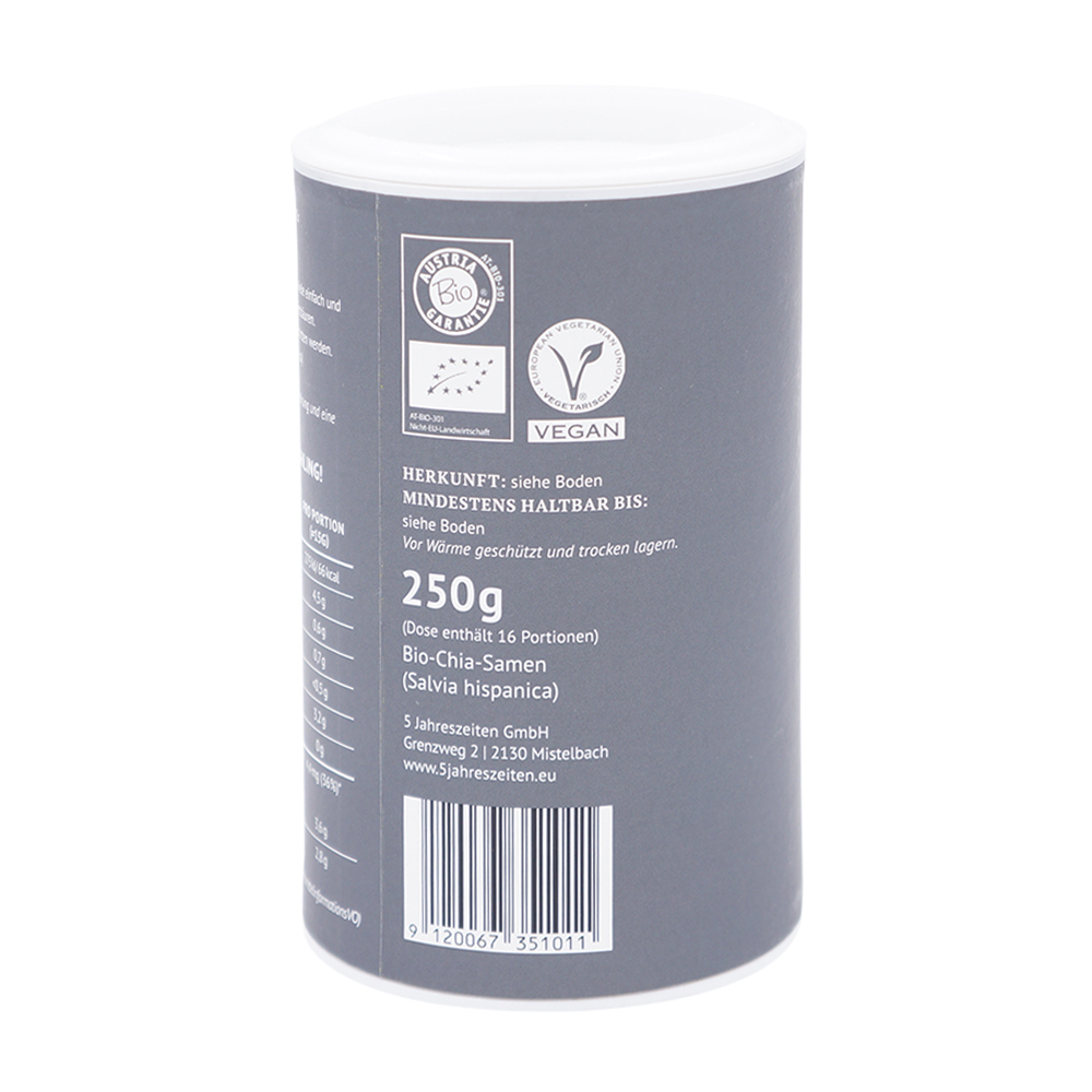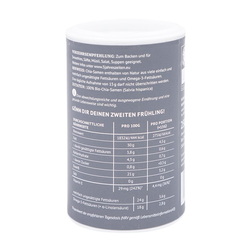 Chiasamen Bio 5 Jahreszeiten ist eine der wertvollsten Quellen von gesunden Fetten. Das reichliche Vorkommen an den gesunden Fettsäuren hilft bei der Erhaltung eines normalen Cholesterinspiegels und in Folge dessen kann sich das Risiko von Gefäßerkrankungen und Herz-Kreislauf-Krankheiten reduzieren. Zudem tragen Omega-3-Fettsäuren zur Erhaltung einer normalen Gehirnfunktion und Sehkraft bei.