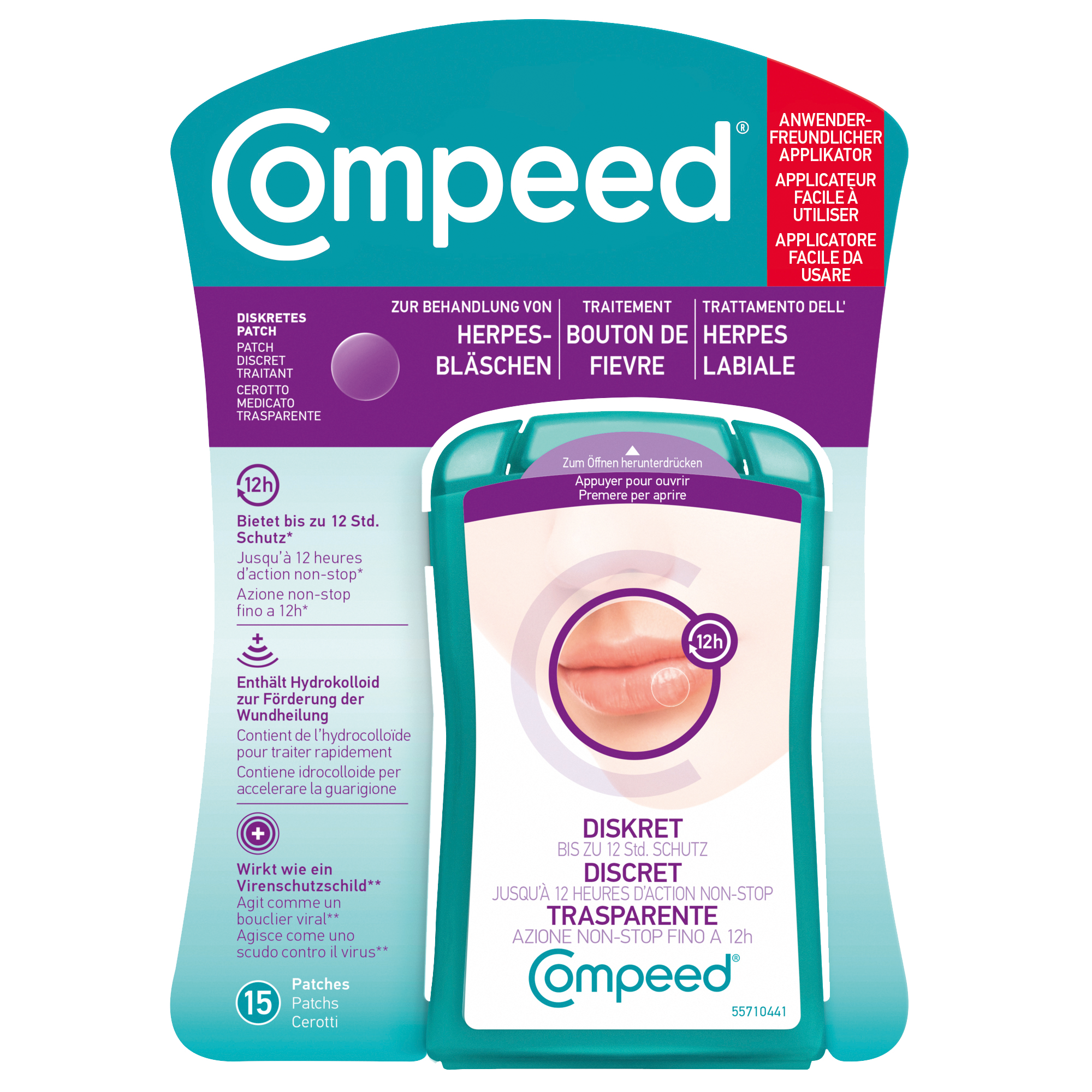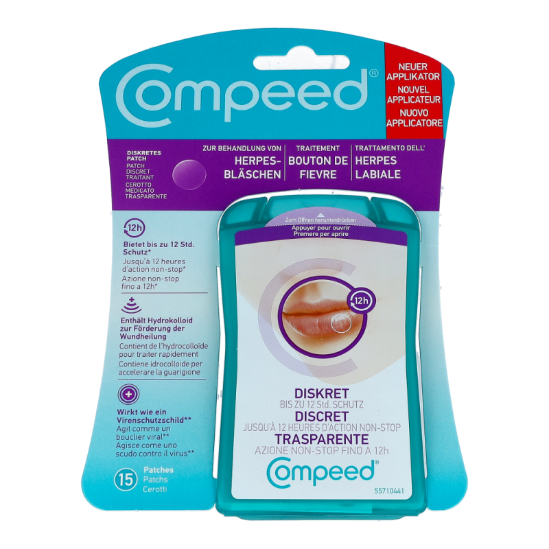 Das Compeed® Herpesbläschen Patch wirkt, indem es den natürlichen Heilungsprozess des Körpers beschleunigt. Seine Hydrokolloid-Technologie mit Aktiv-Gel stellt eine optimale und keimfreie Wundheilungsumgebung bereit und verhindert die Schorfbildung. Das diskrete Herpesbläschen Patch legt sich wie ein Schutzschild auf und um die betroffene Stelle und verhindert die Ausbreitung des Virus.