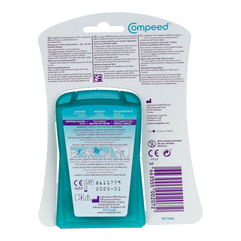 Für ein optimales Ergebnis sollte das Compeed® Herpesbläschen Patch schon bei den ersten Anzeichen angewendet und das Herpesbläschen rund um die Uhr abgedeckt werden, bis die Stelle völlig verheilt ist.