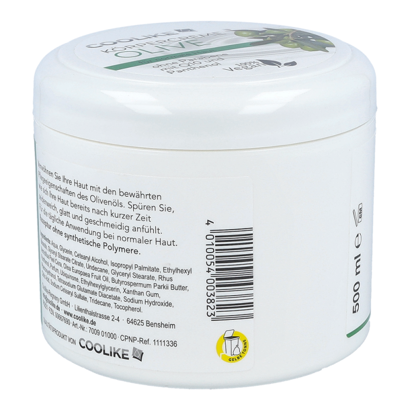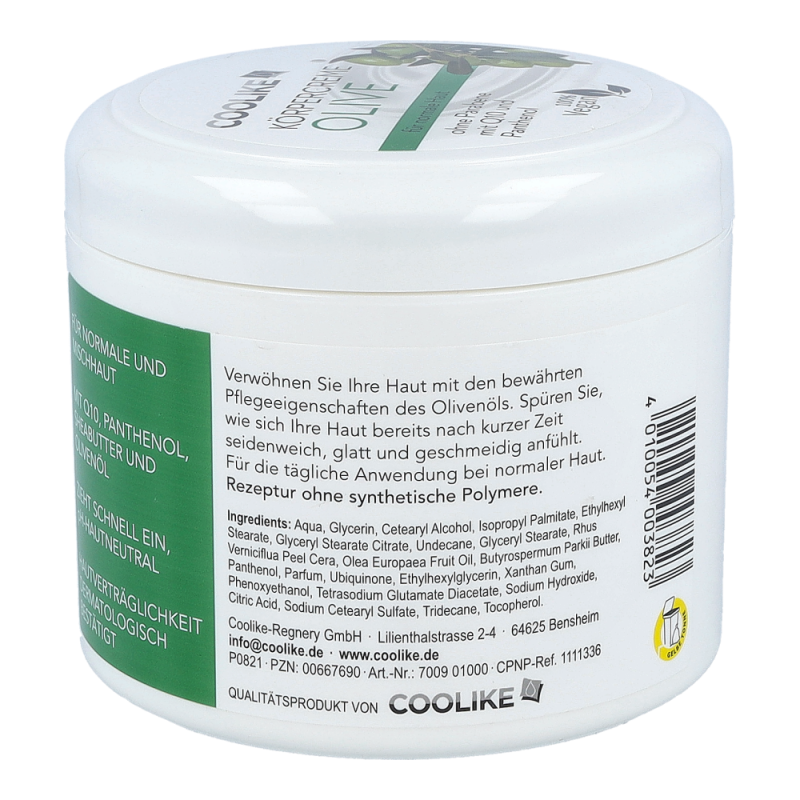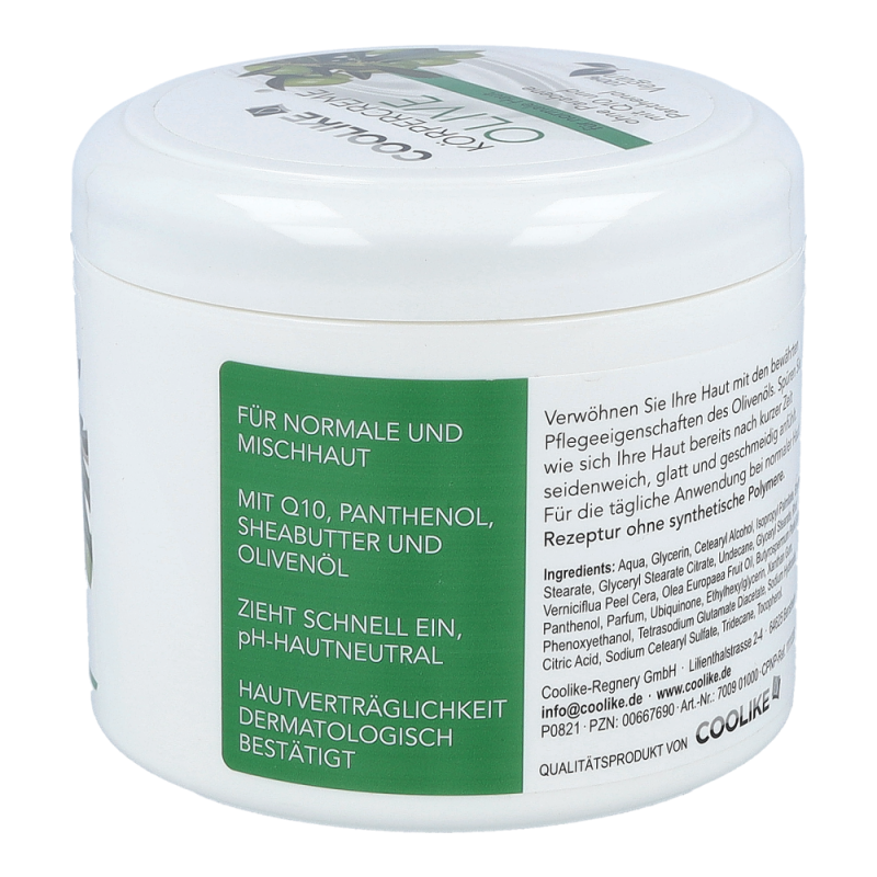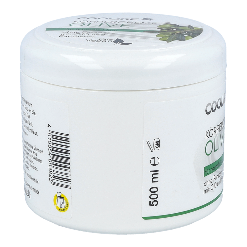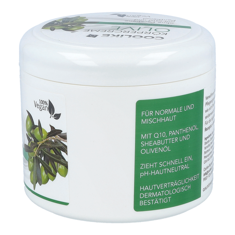 Coolike Körpercreme enthält Panthenol und Q10, welche der Haut intensive Feuchtigkeit spenden und ihre natürliche Regeneration fördern. Sie verleihen ein zartes Hautgefühl. Für die tägliche Anwendung geeignet.Dieses Produkt erhalten Sie in den Varianten Aloe Vera, Avocado, Olive und Mandel.