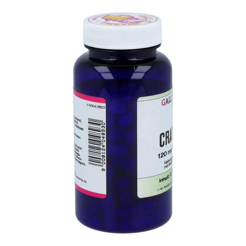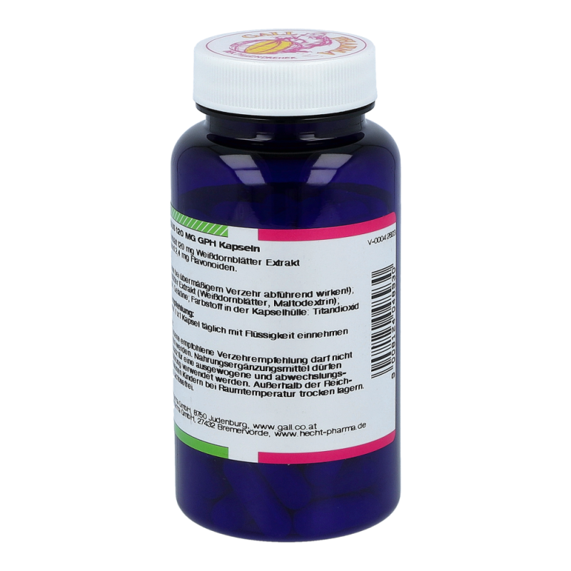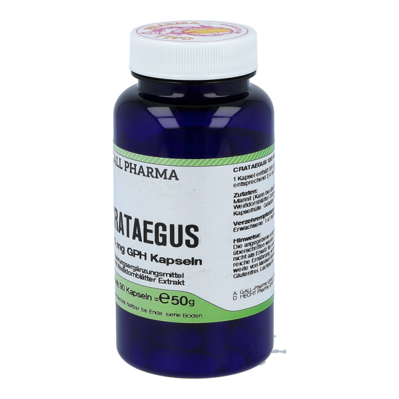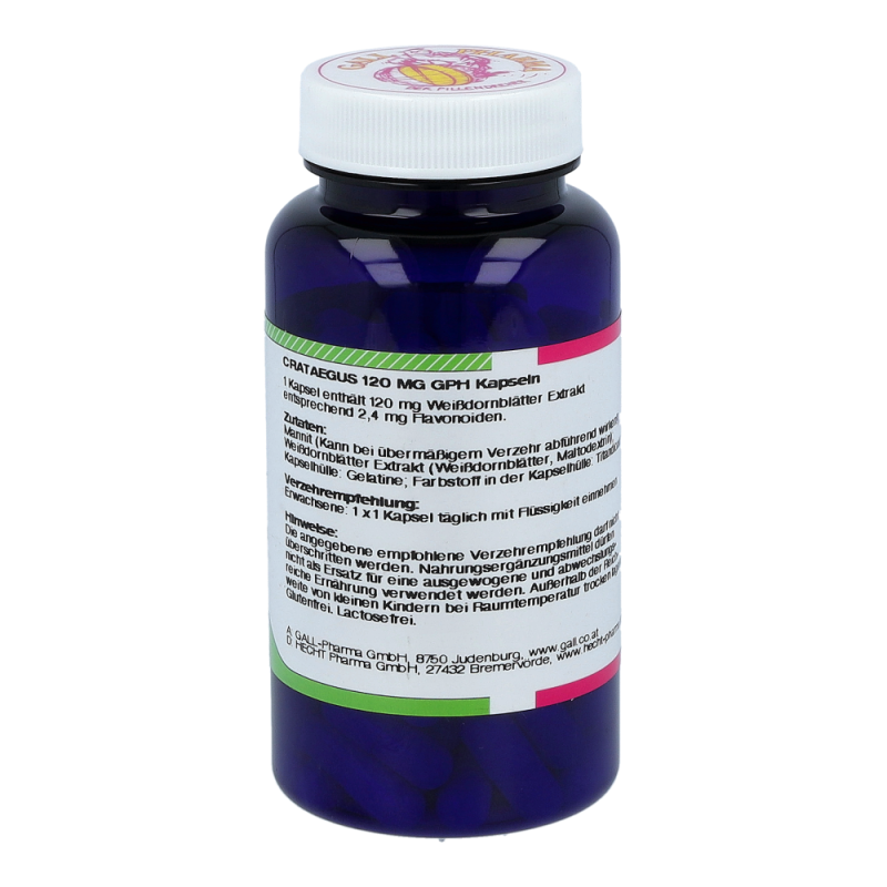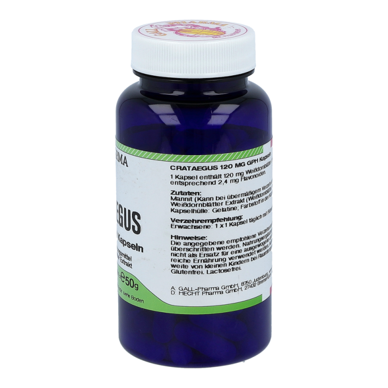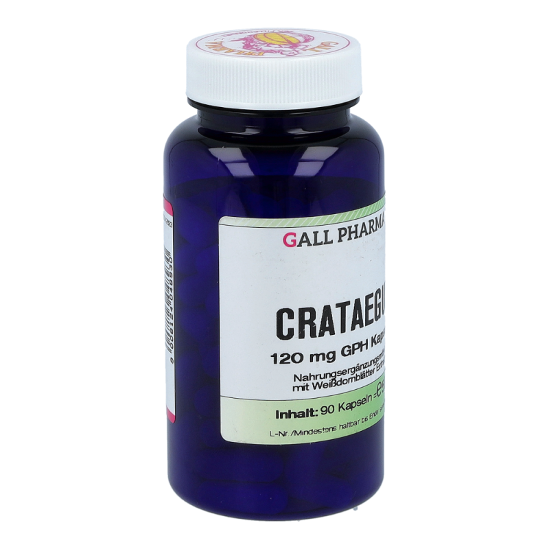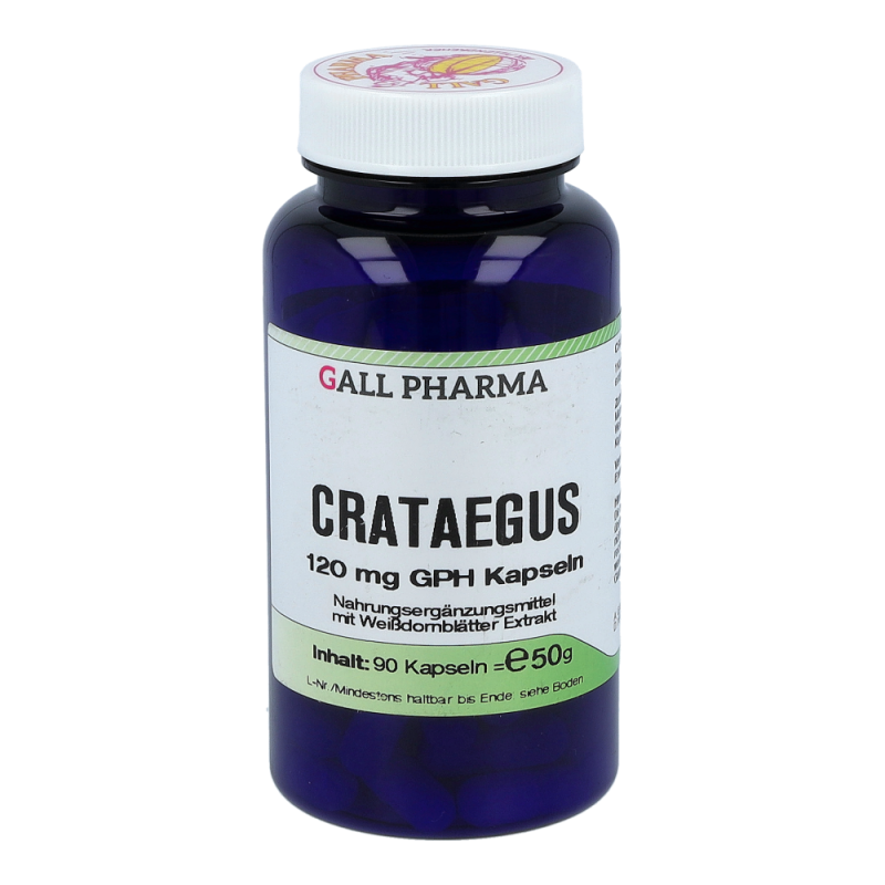 Gall Pharma Crataegus 120 mg Kapseln 90 Stk. enthalten 120 mg Weißdornextrakt aus Blättern und Blüten mit 2,3 mg Flavonoiden sowie 265 mg Olivenblätterextrakt in einer Hartgelatinekapsel. Abgeschlagenheit, Leistungsschwäche, Müdigkeit und Kreislaufbeschwerden können Anzeichen einer Schwäche des Herz-Kreislaufsystems sein. Gerade in Zeiten erhöhter Belastung kann es sinnvoll sein, Herz und Gefäßsystem über die Ernährung mit Weißdorn und Olivenblätter zu unterstützen.