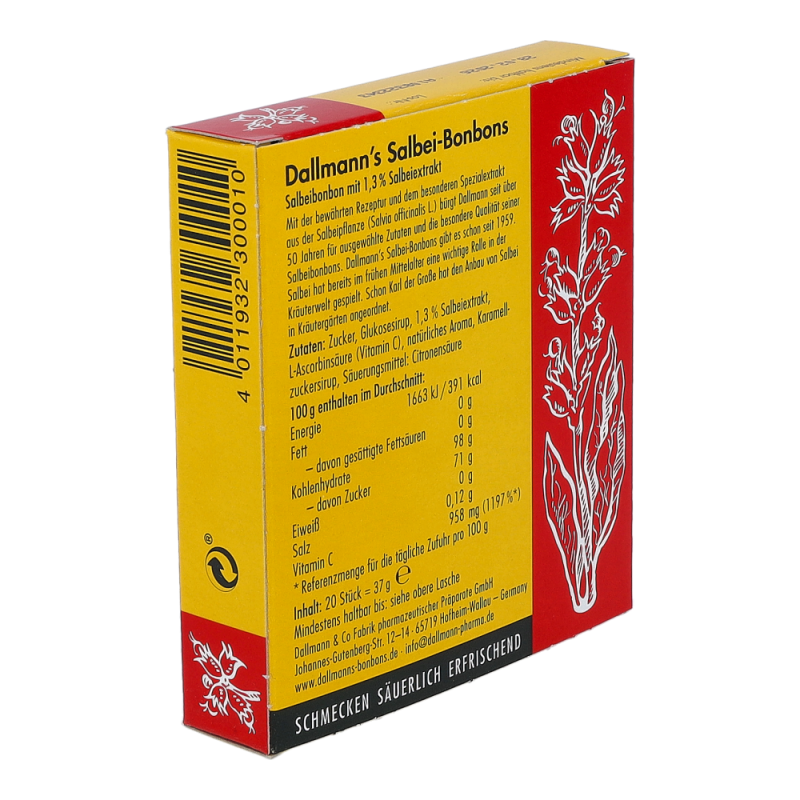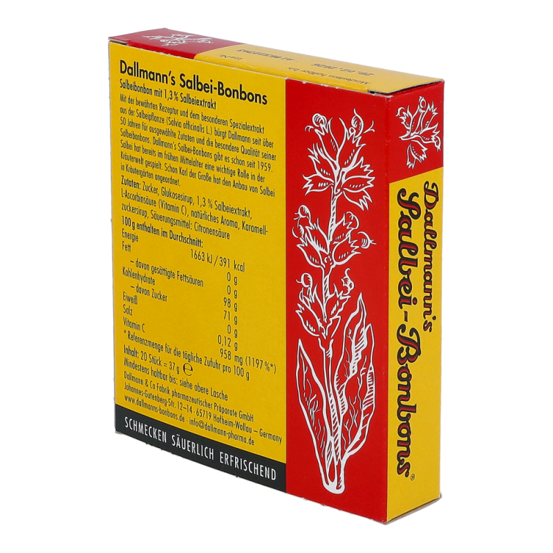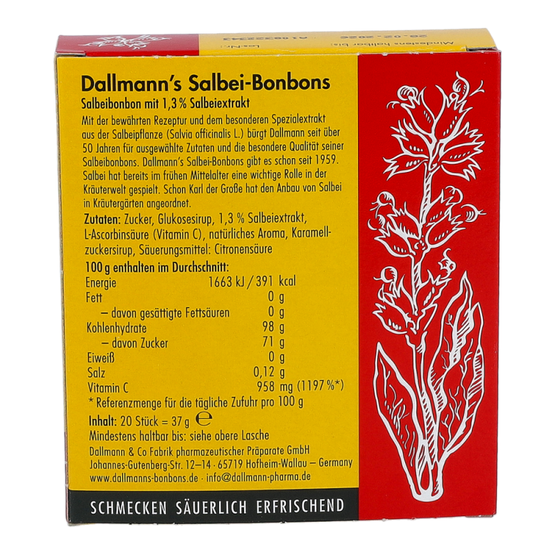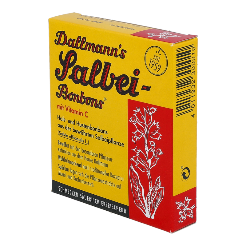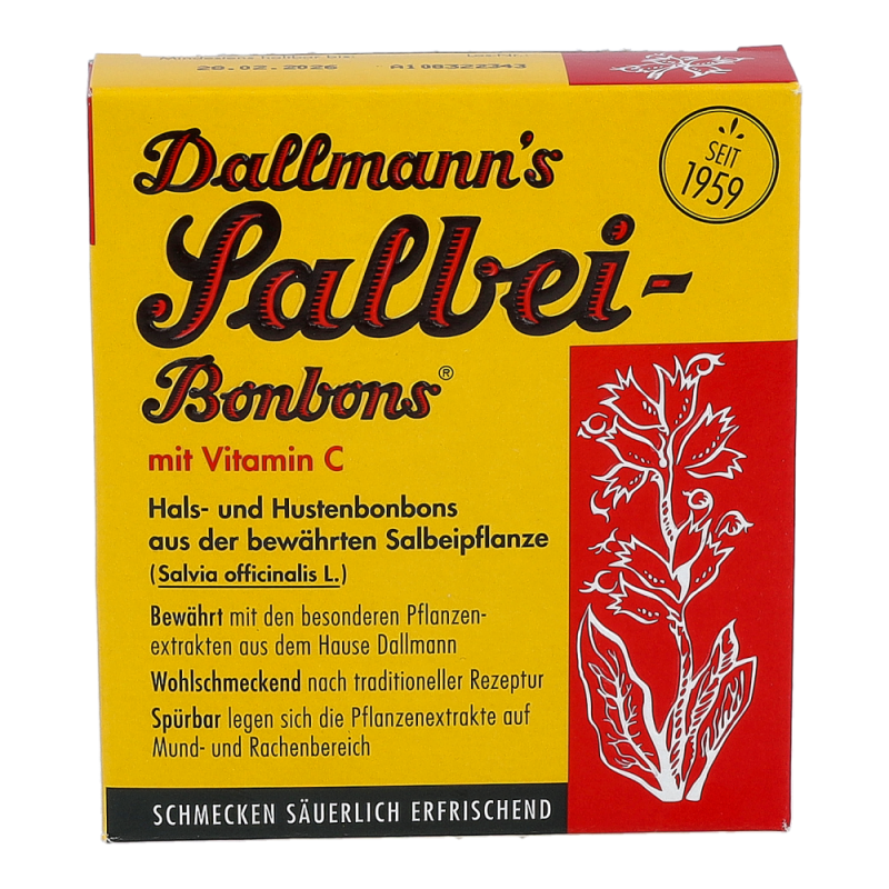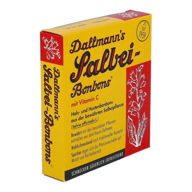 Dallmann’s Hustenbonbons Salbei verwöhnen auf sanfte, säuerlich erfrischende Art. Der Salbei ist eine sehr vielseitige Pflanze und seit dem frühen Altertum als solche bekannt. Angereichert mit Vitamin C und mit dem Extrakt des Salbei sind die diese Bonbons das Mittel erster Wahl bei Husten -.