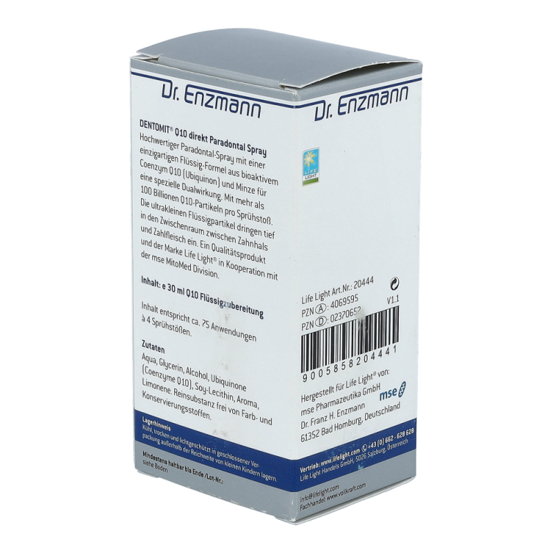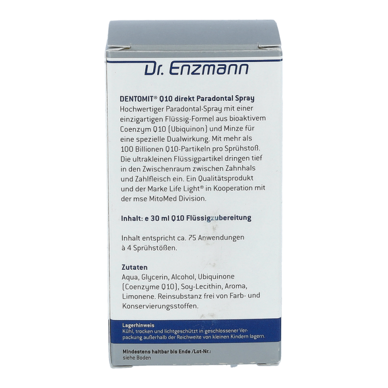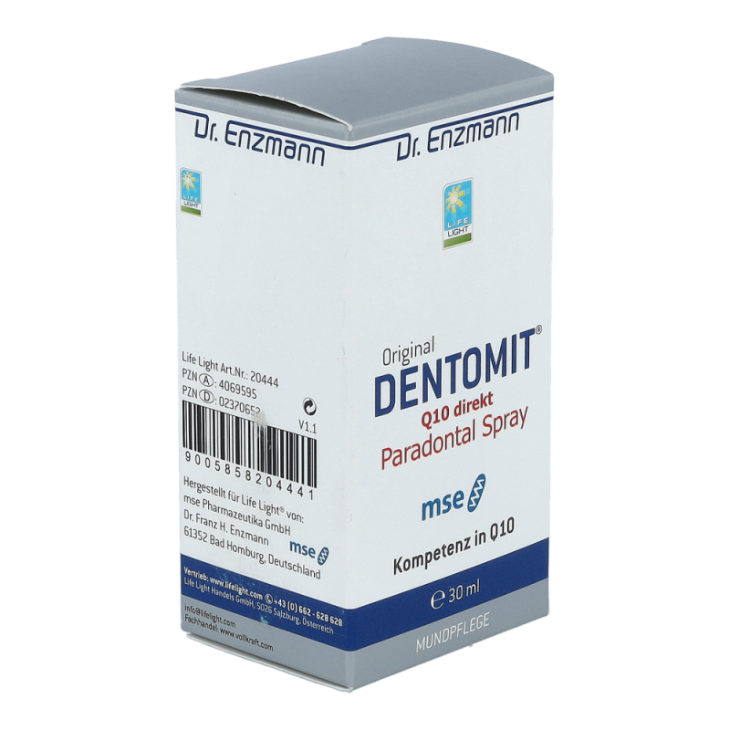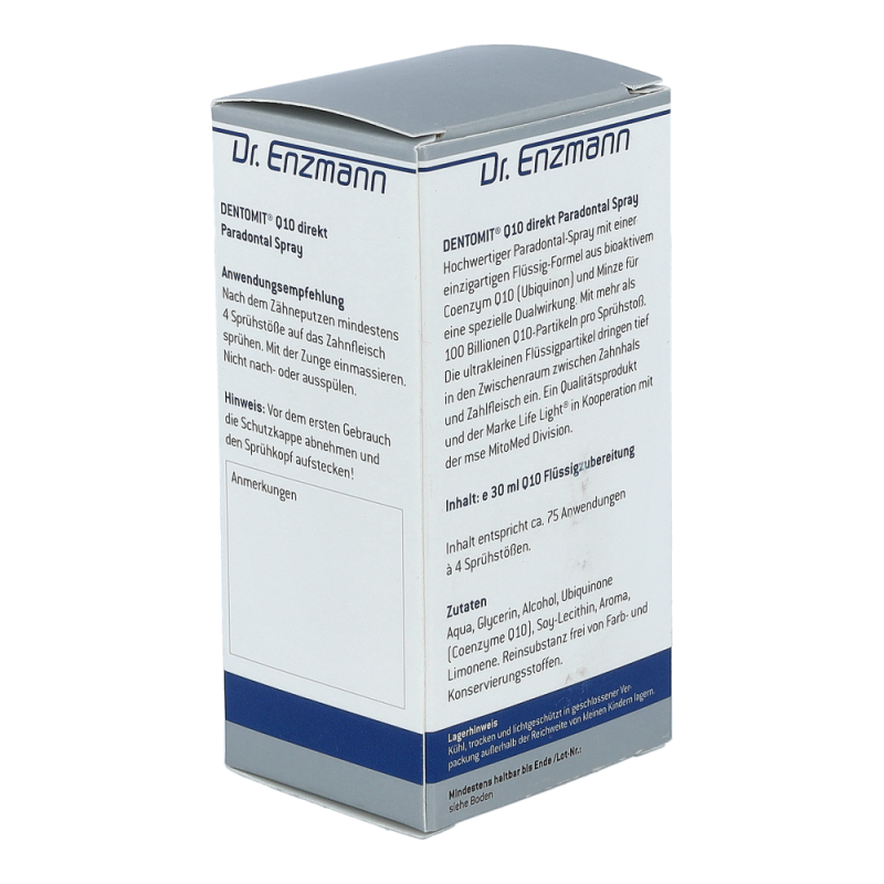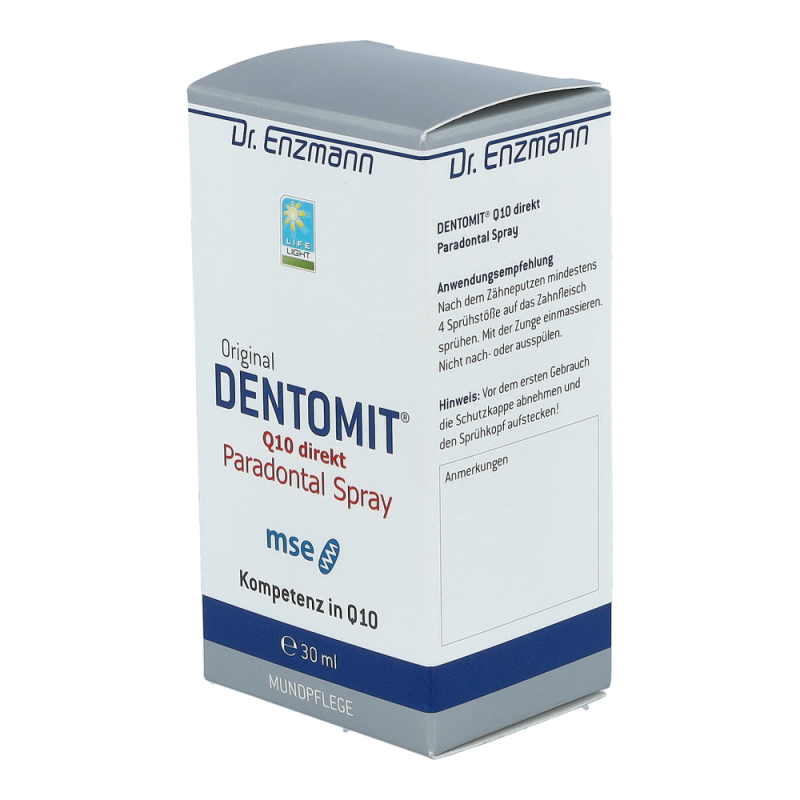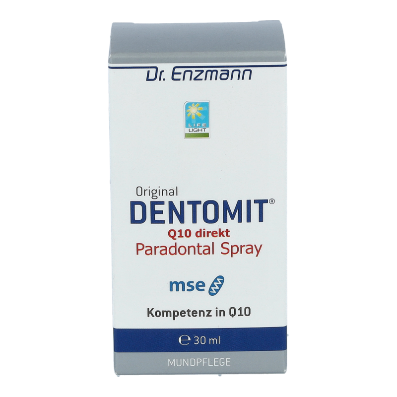 Dentomit Parodontal-Spray Life Long ist ein klinisch getestetes Mundspray mit Coenzym Q10 und Minzöl zur täglichen Pflege von Mundhöhle und Zahnfleisch. Das Produkt ist besonders geeignet bei kleinen Blutungen im Mundraum sowie Aphthen und darüber hinaus sehr empfehlenswert bei Parodontitis oder bei Neigung zu ausgedehnter Plaquebildung.
