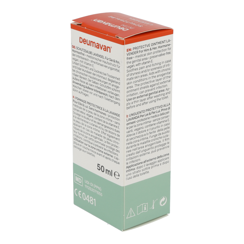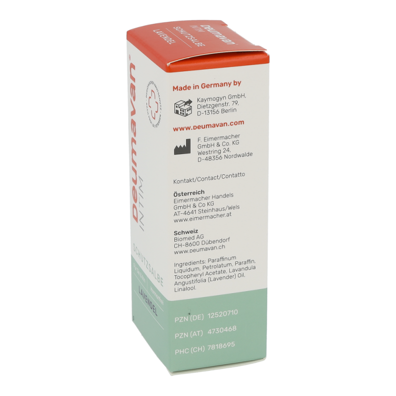 Deumavan Schutzsalbe schützt, regeneriert und pflegt die sensible Intimhaut. Sie mindert Schmerzen, Brennen, Juckreiz und andere Intimbeschwerden und unterstützt die Intimhaut, wenn sie trocken, rau, geschädigt oder infolge einer Erkrankung besonders empfindlich ist. Die Rezeptur enthält kein Wasser (Aqua), weshalb sie ohne Konservierungsmittel (z. B. Parabene) und ohne Emulgatoren auskommt. Zudem enthält sie keinen Alkohol. Daher verursacht Deumavan Schutzsalbe kein Brennen auf der zarten Intimhaut und trocknet diese bei täglicher Anwendung nicht aus. Deumavan Schutzsalbe enthält Vitamin E, ist frei von Hormonen und vegan. Alle Bestandteile der fettreichen Deumavan-Rezeptur sind hochgereinigt und entsprechen pharmazeutischen Qualitätsstandards.