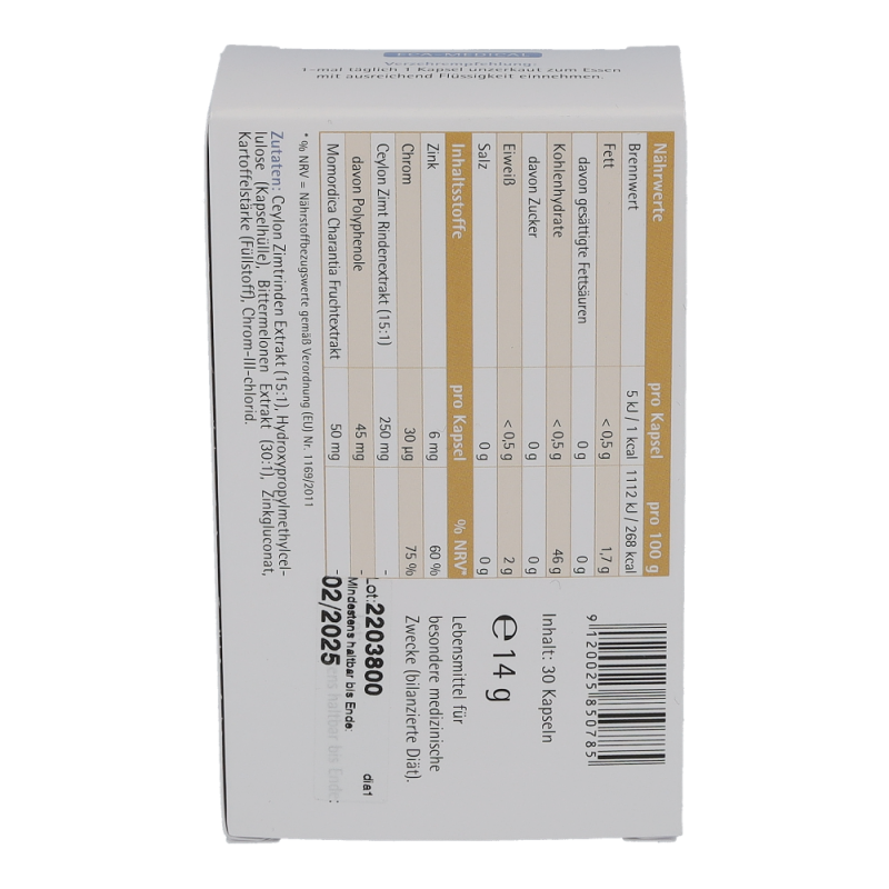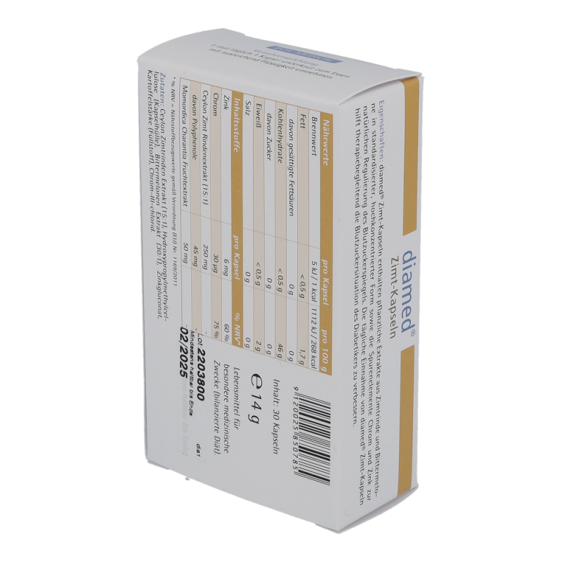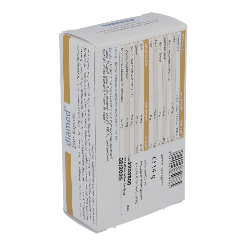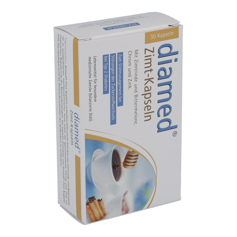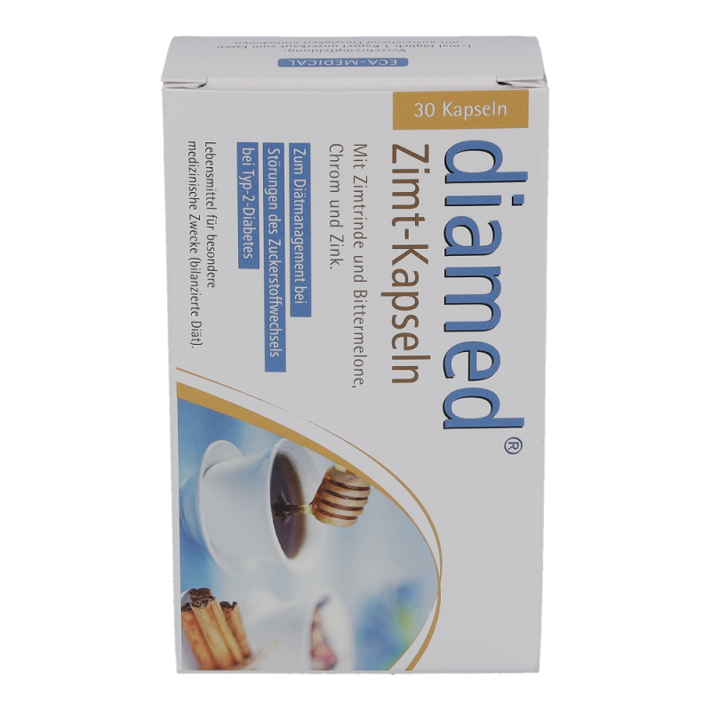 Diamed Zimtkapseln wirken sich positiv bei einer Störung des Zuckerstoffwechsels aus und wirken zudem unterstützend als Behandlung im Rahmen eines Diätplanes bei Diabetes mellitus. Die spezielle Zusammensetzung trägt dazu bei, den Blutzuckerspiegel zu senken.