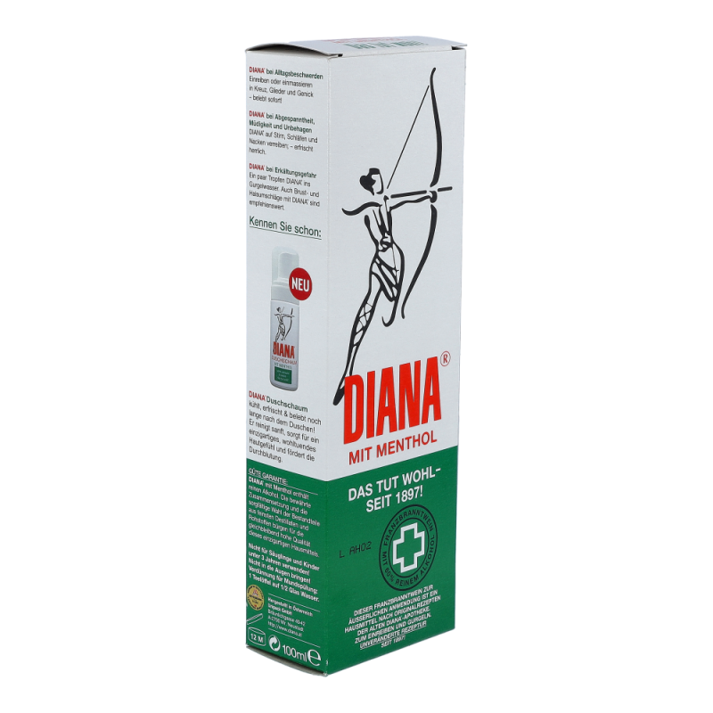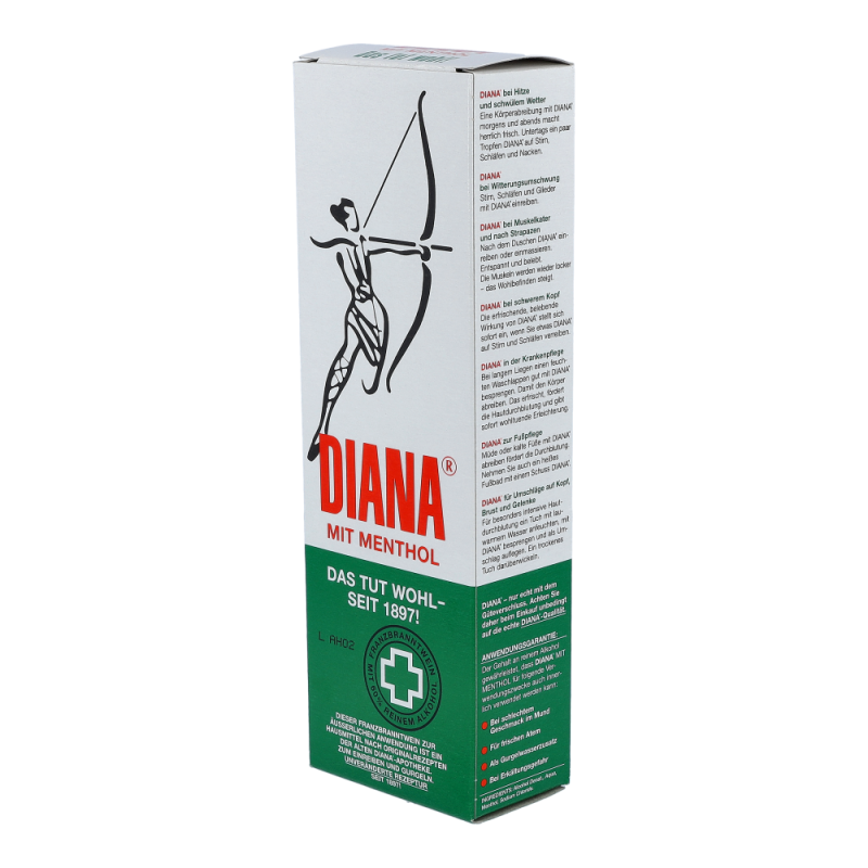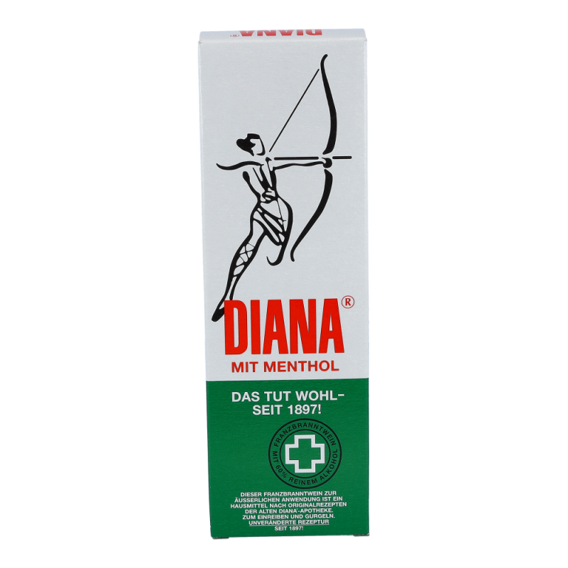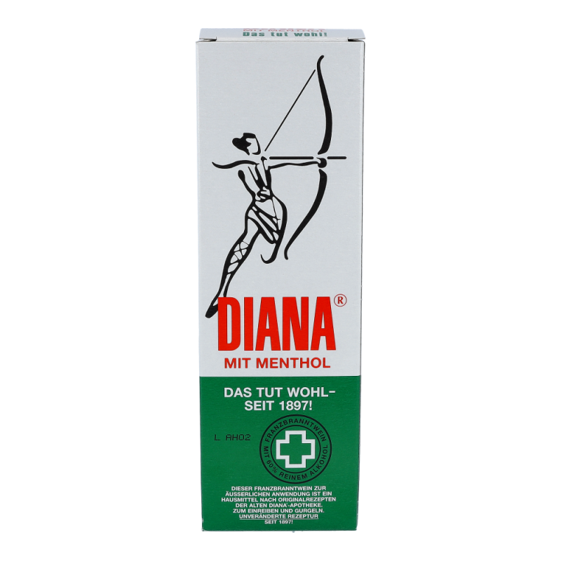 DianaFranzbranntwein kühlt mit erfrischendem Menthol bei Hitze und schwülem Wetter,bei Witterungsumschwung und schwerem Kopf. Diana mit Menthol enthält reinenAlkohol.