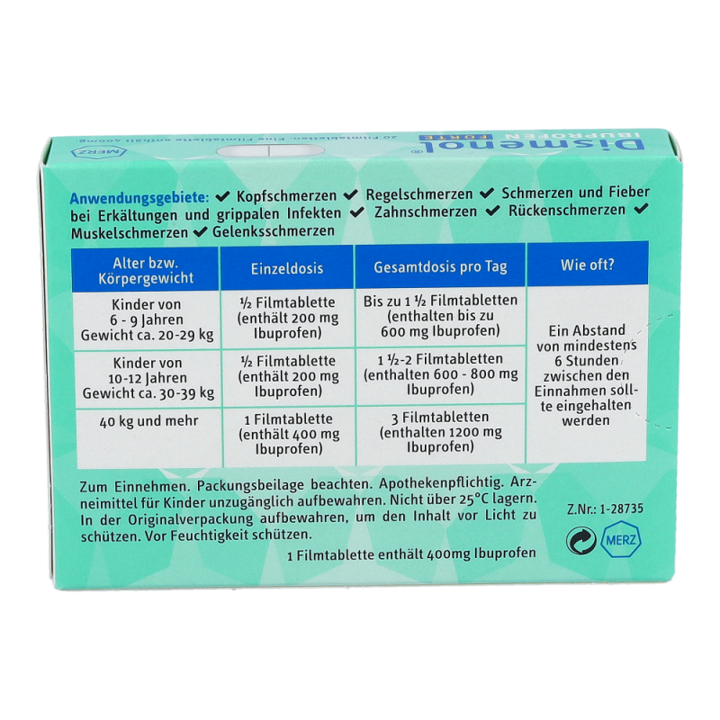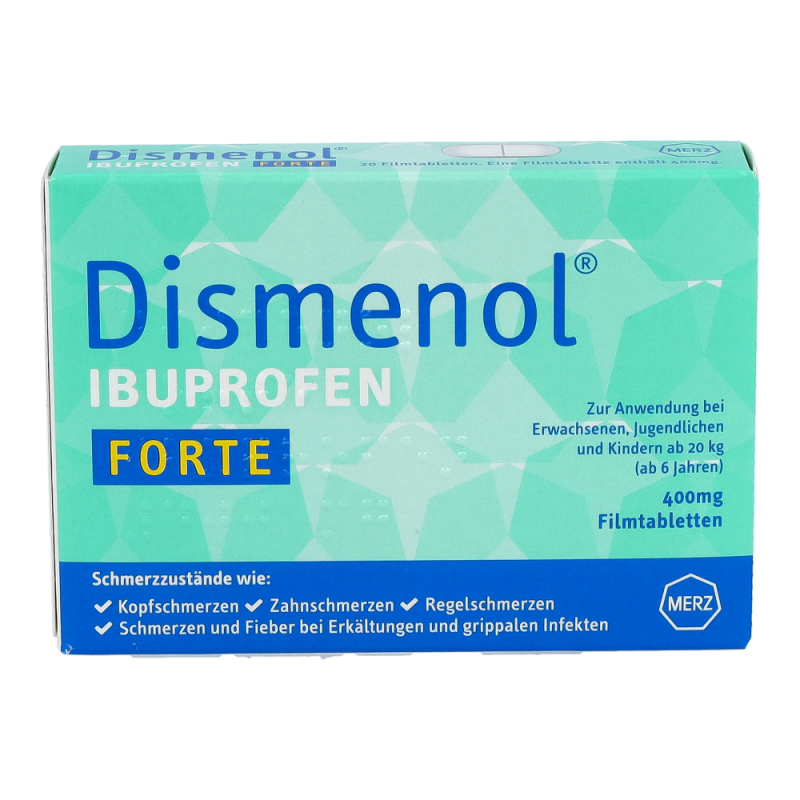 Dismenol Ibuprofen Forte 400 mg Tabletten haben einen rasch einsetzenden, schmerzstillenden Effekt. Vor allem bei Frauen mit Menstruationsbeschwerden, aber auch bei zum Beispiel Zahn-, Kopf- und Gelenkschmerzen können sie schnell Abhilfe leisten.