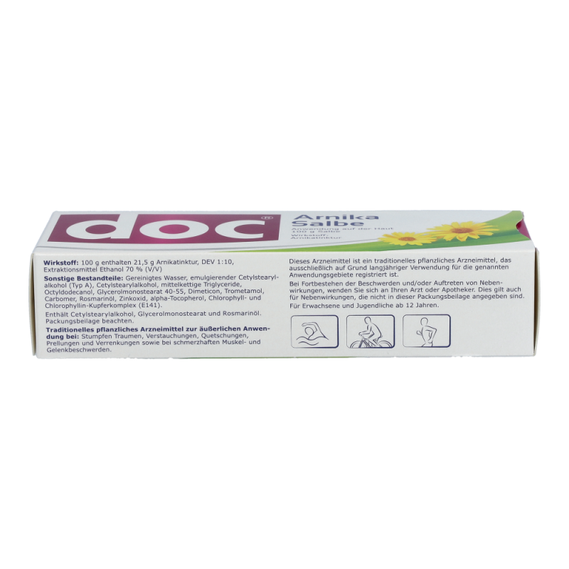 Doc Arnika Creme kann bei stumpfen Verletzungen im Alltag und beim Sport (z.B. Verstauchungen, Prellungen, Zerrungen) rasche Linderung bringen. Sie wirkt auf ganz natürliche Weise abschwellend, entzündungshemmend und schmerzlindernd.
