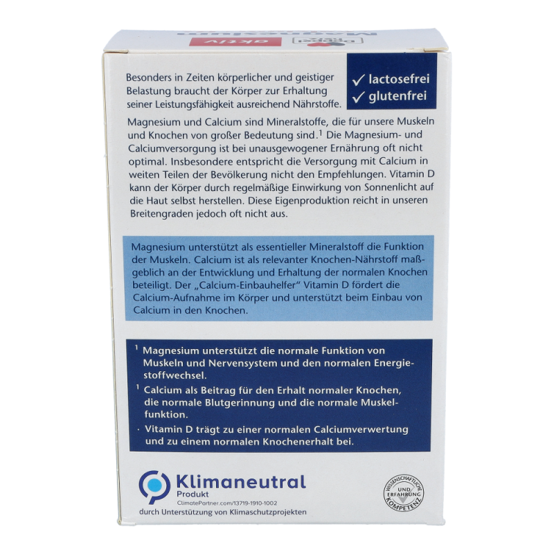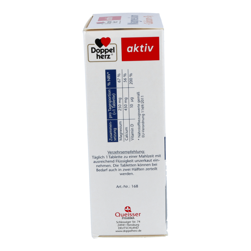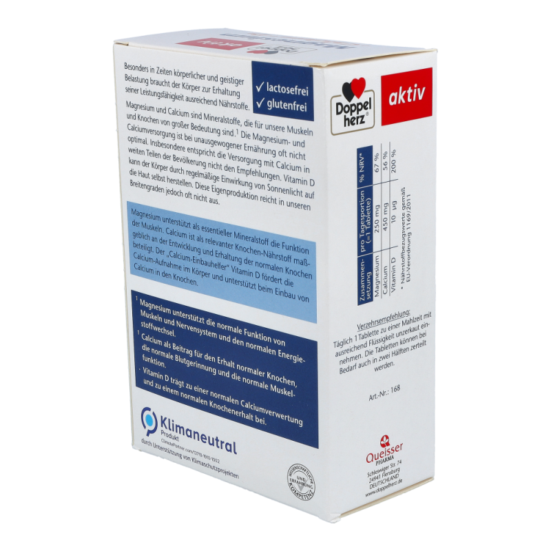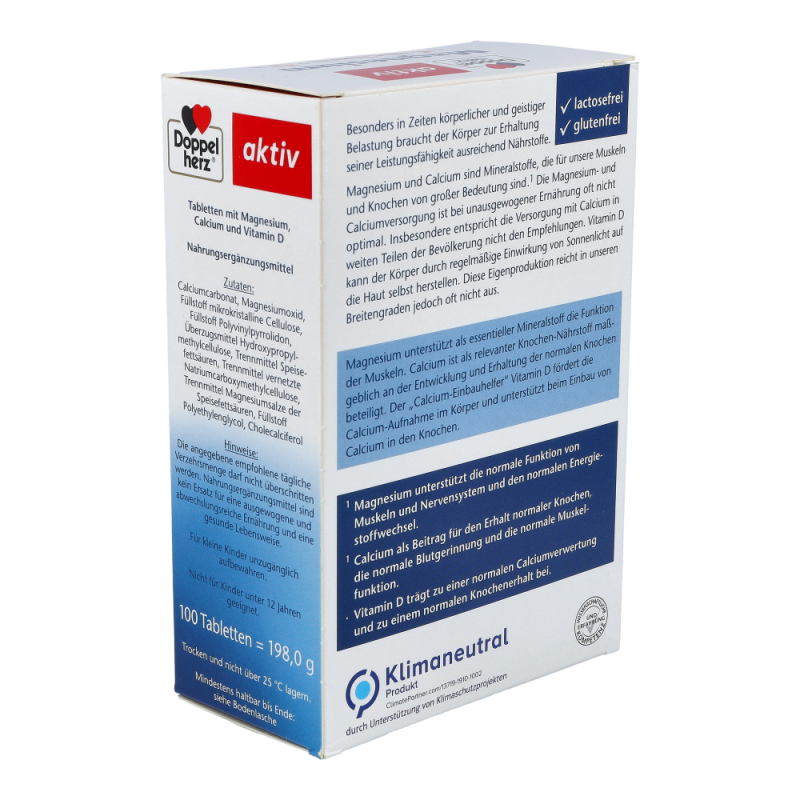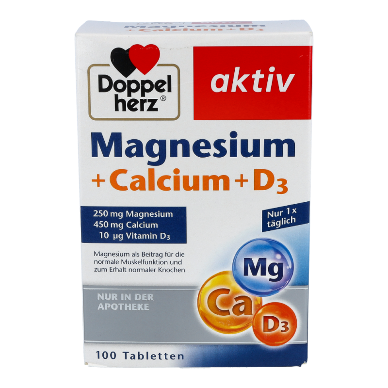 Ein guter und ausgewogener Nährstoff- und Vitaminhaushalt ist für den Körper lebensnotwendig. Magnesium gehört zu den wichtigen Mineralstoffen für unseren Organismus. Die Speicherung von Magnesium ist allerdings nur begrenzt möglich. Bei Sport, nach starker körperlicher Belastung oder bei einer unausgewogenen Ernährung ist es wichtig, den Körper reichlich zu versorgen. Das Nahrungsergänzungsmittel von Doppelherz mit Magnesium eignet sich zur Unterstützung der Nährstoffversorgung. Neben Magnesium, das einen Beitrag zur normalen Muskelfunktion leistet, enthalten die Tabletten zusätzlich Calcium und Vitamin D für den normalen Knochenerhalt. Täglich kann eine Tablette zu einer Mahlzeit unzerkaut und mit ausreichend Flüssigkeit eingenommen werden.