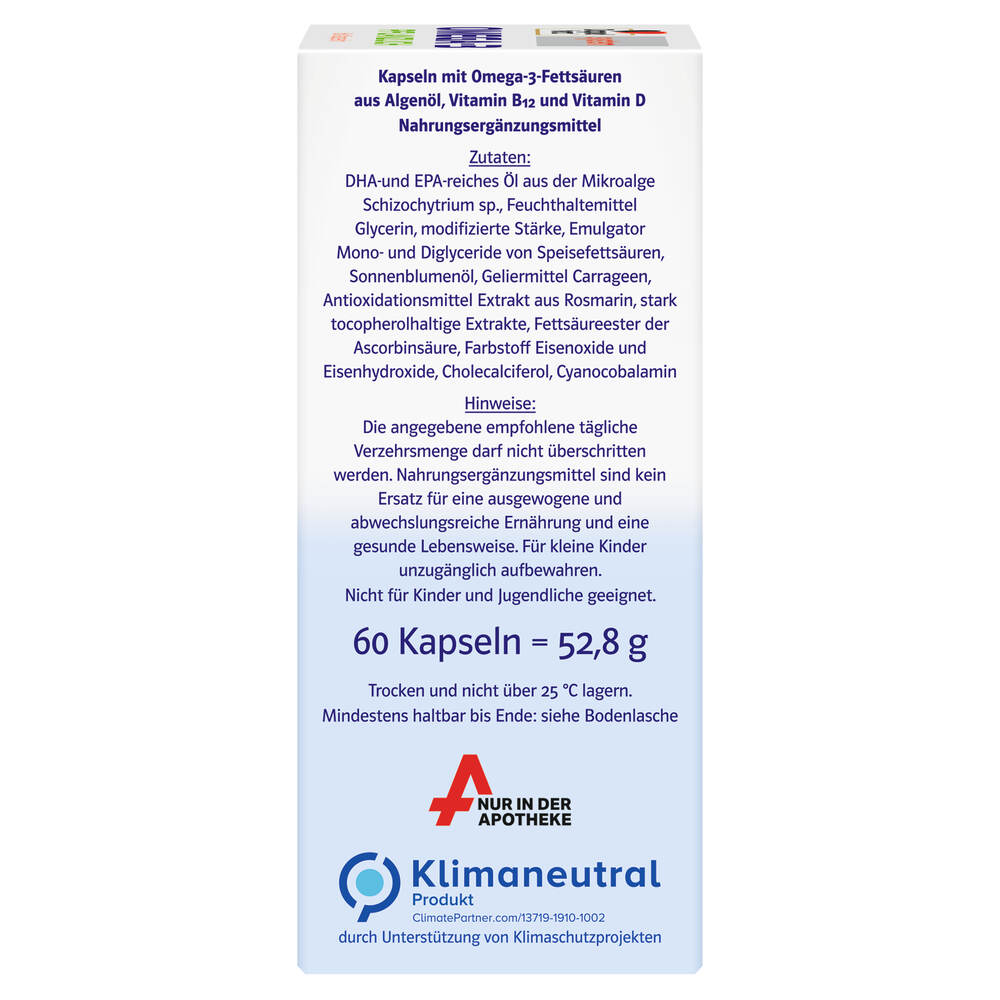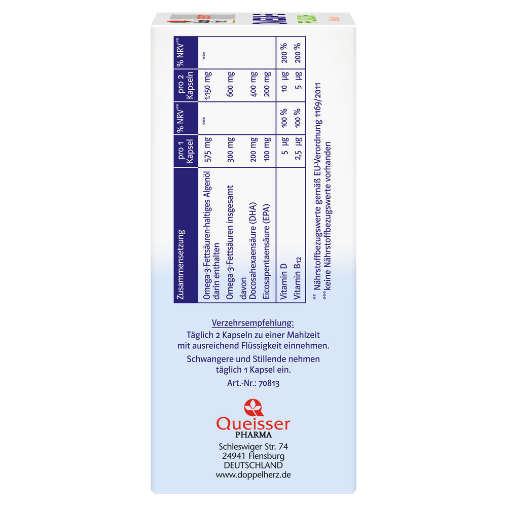 Doppelherz system OMEGA-3 PFLANZLICH liefert Omega-3-Fettsäuren auf nicht-tierischer bzw. veganer Basis und ist damit ideal für alle, die auf tierische Produkte verzichten wollen. Die wertvollen Omega-3-Fettsäuren DHA (Docosahexaensäure) und EPA (Eicosapentaensäure) werden aus dem Öl einer speziellen Mikroalge (Schizochytrium sp.) gewonnen. Das hochwertige Algenöl zeichnet sich durch einen hohen Gehalt der wertvollen Omega-3-Fettsäuren DHA und EPA aus. Die Omega-3-Fettsäuren EPA/DHA tragen bei einer täglichen Aufnahme von 250 mg zur normalen Herzfunktion bei. DHA leistet bei einer Aufnahme von 250 mg täglich zudem auch einen Beitrag zum Erhalt einer normalen Gehirnfunktion sowie zum Erhalt der normalen Sehkraft. 2 Kapseln täglich liefern 600 mg der Omega-3-Fettsäuren EPA und DHA aus Algenöl in Kombination mit 10 µg Vitamin D3 pflanzlicher Herkunft. Vitamin D, das Multitalent für die Gesundheit, trägt zum Erhalt normaler Knochen, der normalen Muskelfunktion sowie zu einer normalen Funktion des Immunsystems bei.