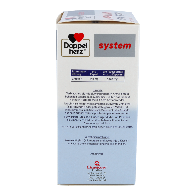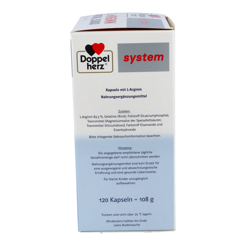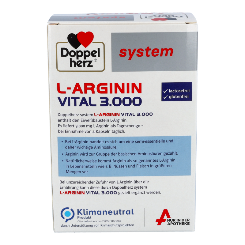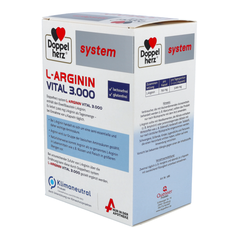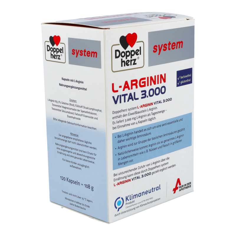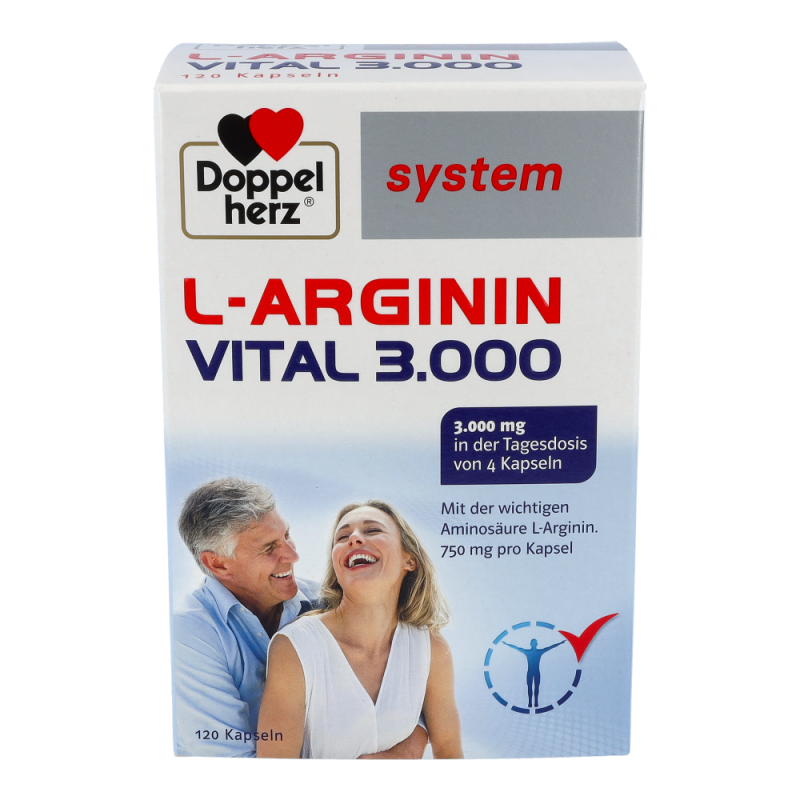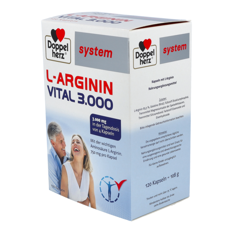 Doppelherz system L-ARGININ VITAL 3.000 enthält den Eiweißbaustein L-Arginin. Es liefert 3.000 mg L-Arginin als Tagesmenge – bei Einnahme von 4 Kapseln täglich. Bei L-Arginin handelt es sich um eine semi-essentielle und daher wichtige Aminosäure. Arginin wird zur Gruppe der basischen Aminosäuren gezählt. Natürlicherweise kommt Arginin als so genanntes L-Arginin in Lebensmitteln wie z. B. Nüssen und Fleisch in größeren Mengen vor. Bei unzureichender Zufuhr von L-Arginin über die Ernährung kann diese durch Doppelherz system L-ARGININ VITAL 3.000 gezielt ergänzt werden.