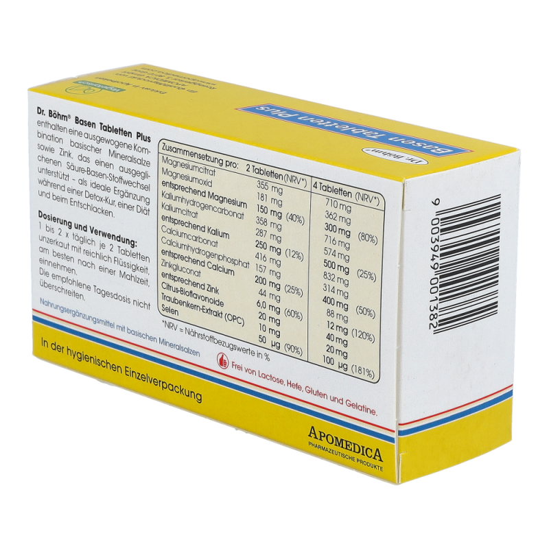 Dr. Böhm Basen Tabletten Plus wirken Übersäuerung entgegen und tragen zu einem normalen Säure-Basen-Stoffwechsel bei. Ideal während einer Diät zur Gewichtsreduktion und beim Entschlacken.