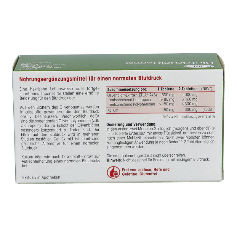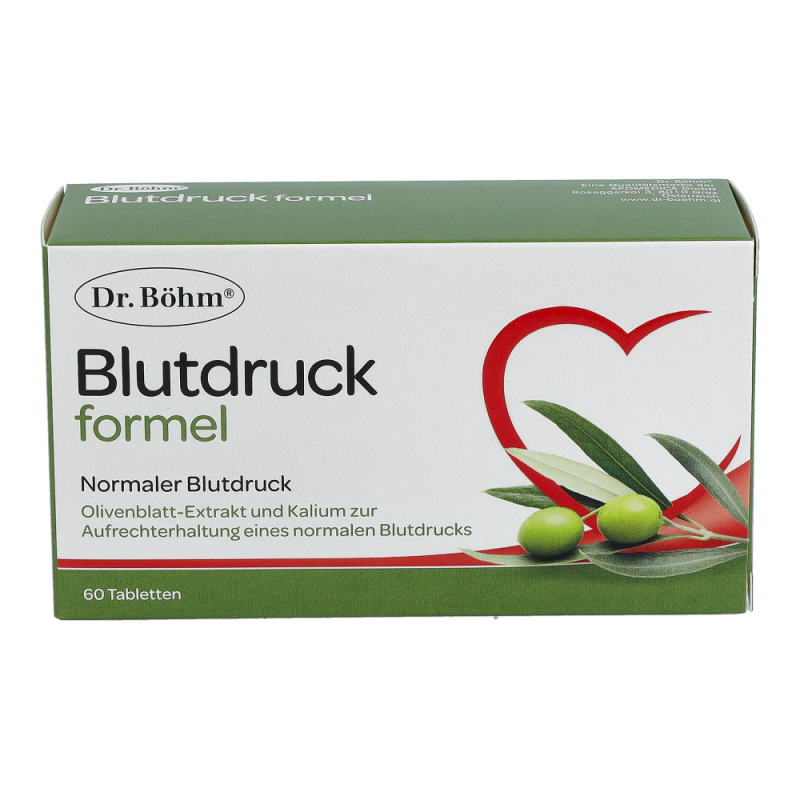 Dr. Böhm® Blutdruckformel Tabletten 60 Stk. ist ein pflanzliches Mittel für einen normalen Blutdruck. kombiniert Olivenblatt-Extrakt und Kalium, die zur Aufrechterhaltung eines normalen Blutdrucks beitragen. Eine hektische Lebensweise oder fortgeschrittenes Lebensalter stellen eine erhöhte Belastung für den Blutdruck dar. Die Blätter des Olivenbaumes enthalten Substanzen, die den Blutdruck positiv beeinflussen. Verantwortlich dafür sind die sogenanntenOlivenpolyphenole (z.B. Oleuropein), die im Extrakt der Olivenblätter besonders konzentriert zu finden sind. Der Effekt auf den Blutdruck wird in mehreren Studien bestätigt. Der Extrakt ist somit eine pflanzliche Alternative für einen normalen Blutdruck. Nicht geeignet bei niedrigem Blutdruck.