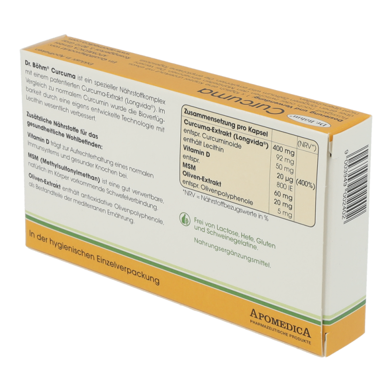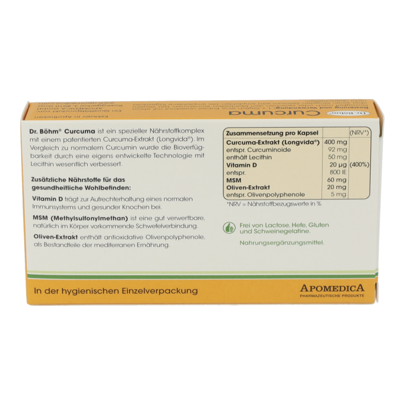 Dr. Böhm Curcuma Kapseln enthalten 400 mg von dem patentierten Curcuma-Extrakt Longvida, um die Aufnahme des Curcumins zu verbessern. Bei dieser Technologie werden die Curcumin-Moleküle in einen gut verträglichen Lecithin-Mantel eingebettet und können so im Darm auf natürliche Weise aufgenommen werden.