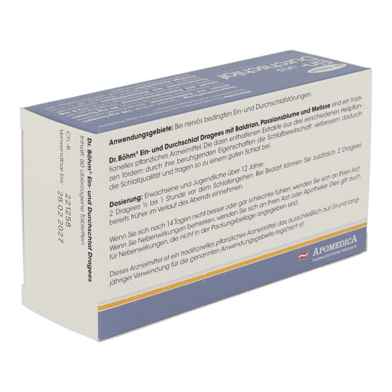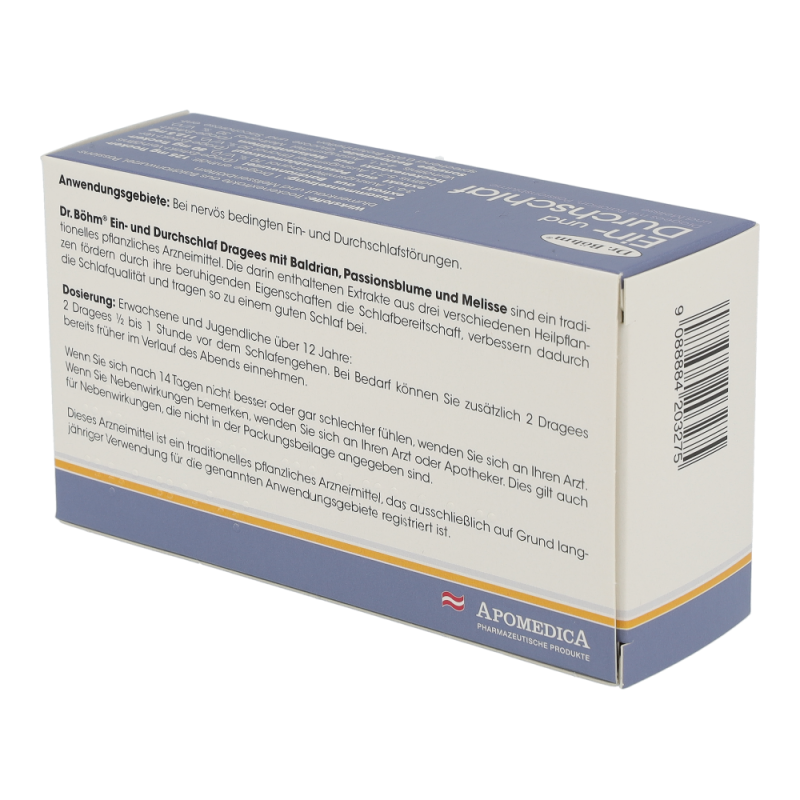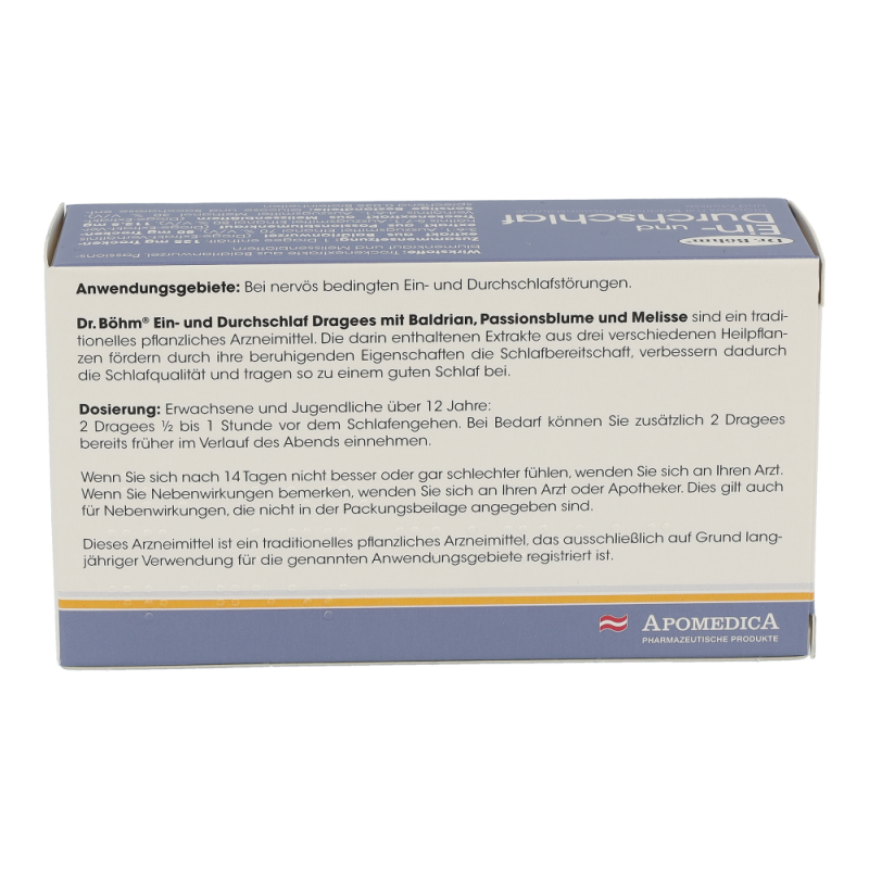 Dr. Böhm Ein- und Durchschlaf Dragees helfen bei nervös bedingten Ein- und Durchschlafstörungen. Des Weiteren fördern Sie die Schlafbereitschaft und verbessern die Schlafqualität sowie die Schlaftiefe.