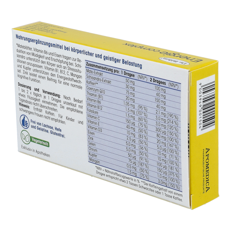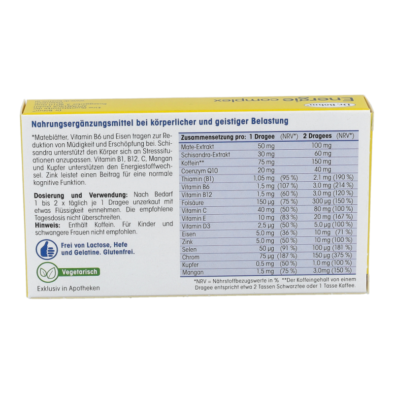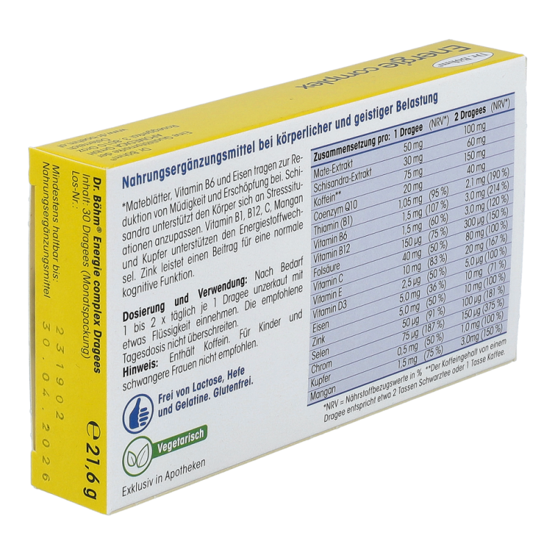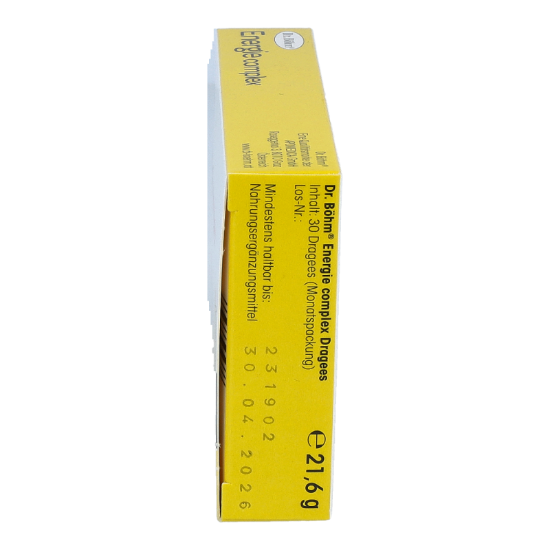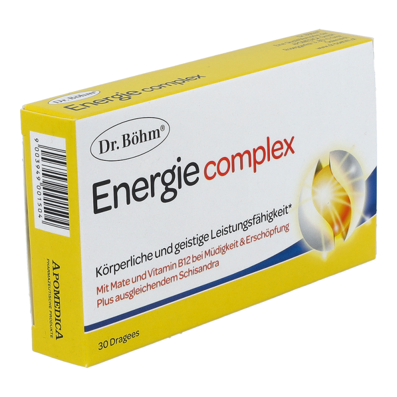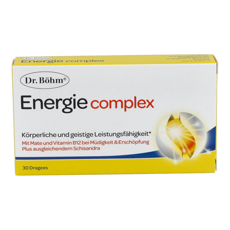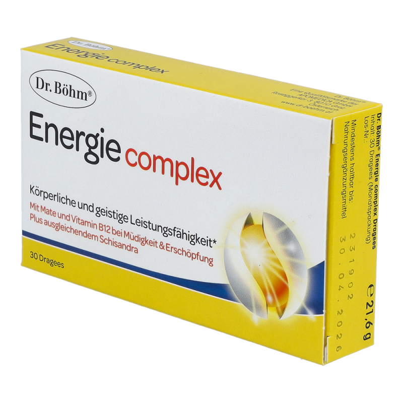 Dr. Böhm Energie complex Dragees wurden speziell für Menschen entwickelt, die ihre inneren Energiequellen mobilisieren und durch wichtige Vitalstoffe zu körperlichem und geistigem Wohlbefinden beitragen wollen. Dr. Böhm Energie complex Dragees leisten einen Beitrag zur Verminderung von Müdigkeit und Erschöpfung. Der innovative Mate-Koffein-Komplex hilft, die Konzentration zu fördern und die Aufmerksamkeit zu erhöhen.