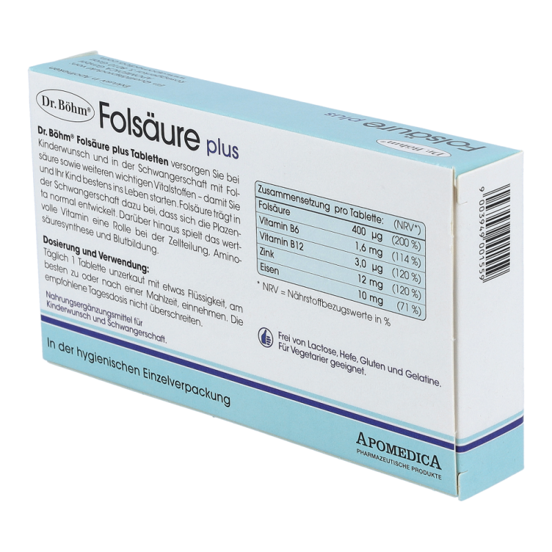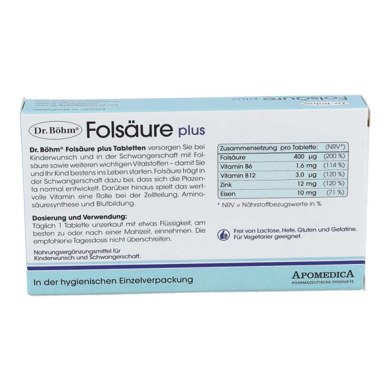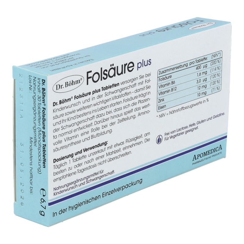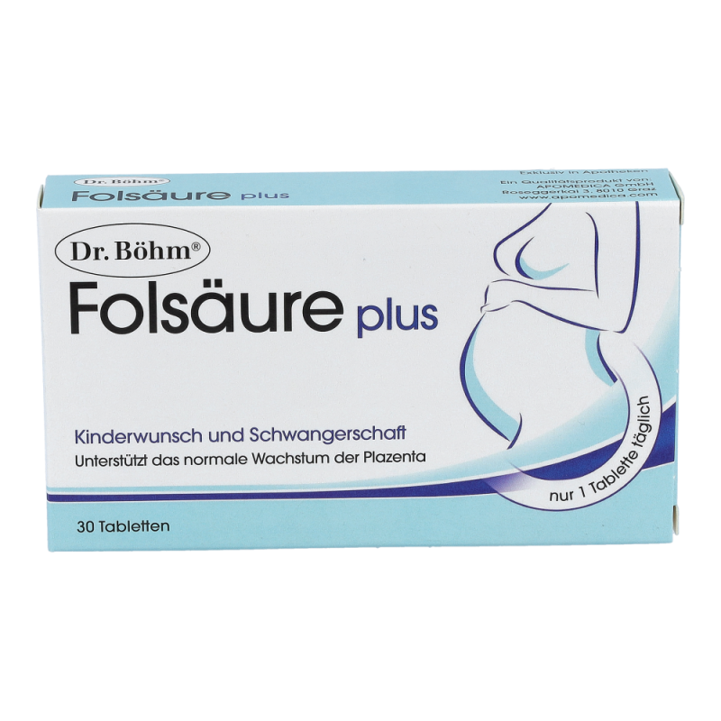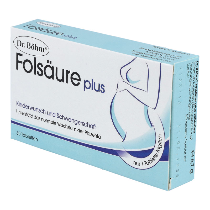 Dr. Böhm Folsäure Plus Dragees wurde speziell für Schwangere oder Frauen mit Kinderwunsch entwickelt. Die Tabletten unterstützen die Zellteilung und Blutbildung, sowie das Wachstum des mütterlichen Gewebes während der Schwangerschaft.