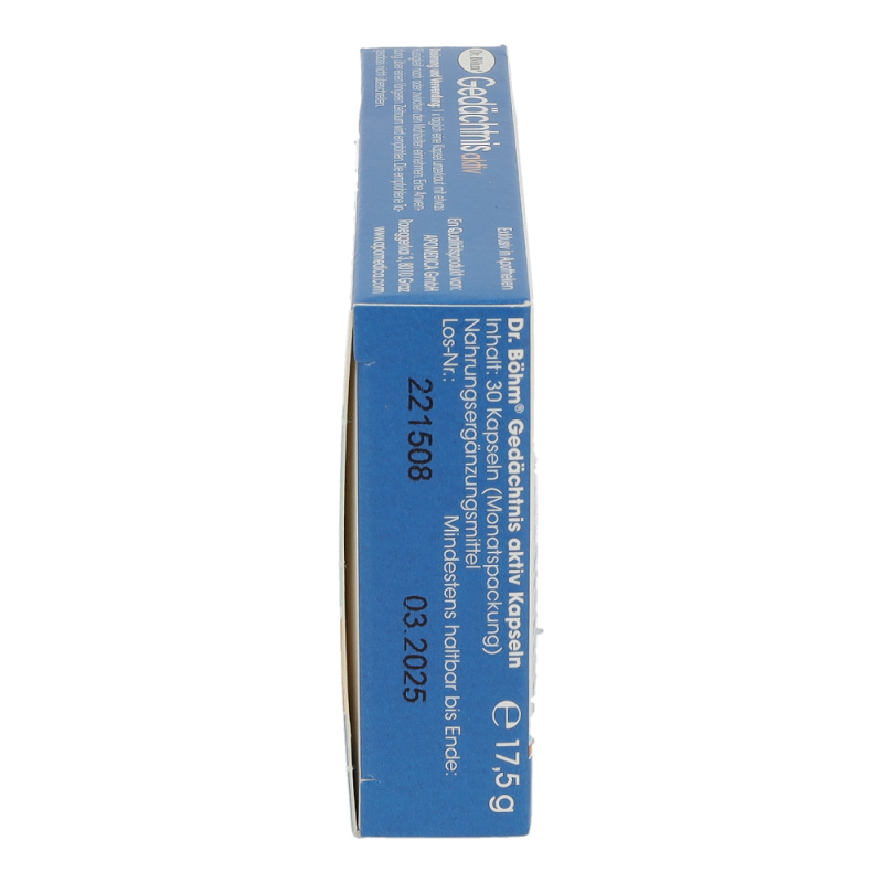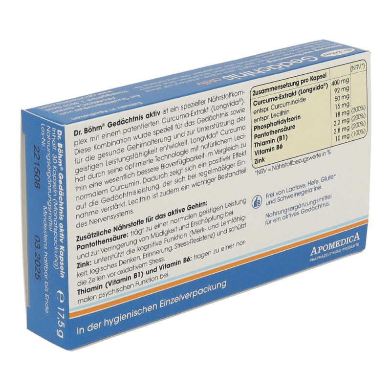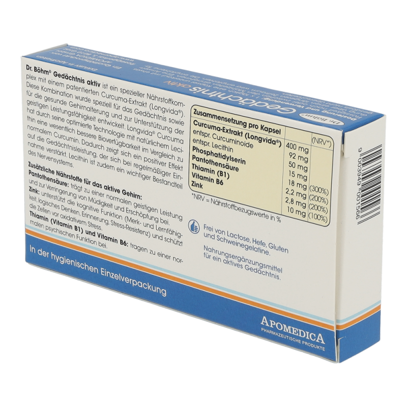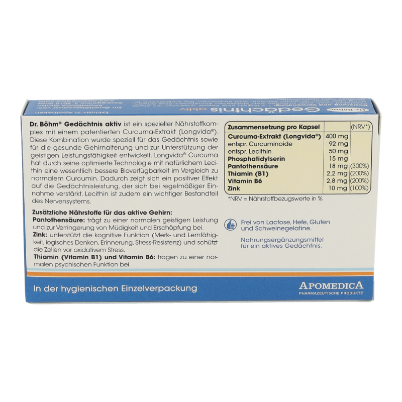 Geistige Fitness ist genauso wie körperliche Leistungsfähigkeit eine Frage des Trainings und der optimalen Versorgung des Körpers mit den richtigen Nährstoffen – und zwar in jedem Alter. Wer geistig aktiv bleiben sowie Gedächtnis und Konzentration aufrecht erhalten möchte, sollte das Gehirn also nicht nur regelmäßig mit Denkaufgaben „füttern“, sondern auch auf eine optimale Nährstoffzufuhr achten. Genau dafür wurde Dr. Böhm®Gedächtnis aktiv entwickelt – ein spezieller Nährstoffkomplex mit dem patentierten Curcuma-Extrakt Longvida®. Die innovative Kombination wurde speziell für das Gedächtnis sowie für die gesunde Gehirnalterung und zur Unterstützung der geistigen Leistungsfähigkeit entwickelt.