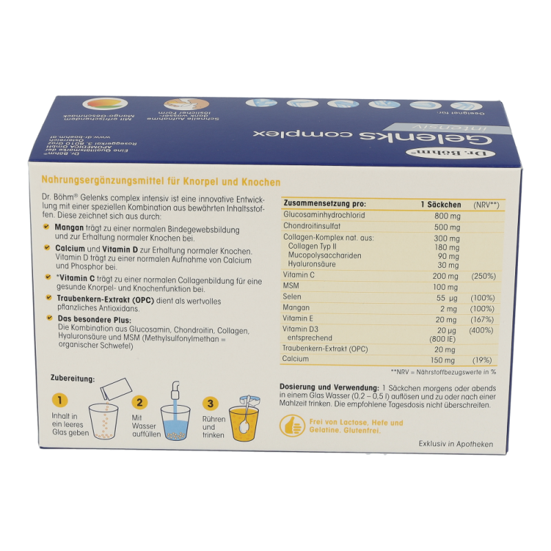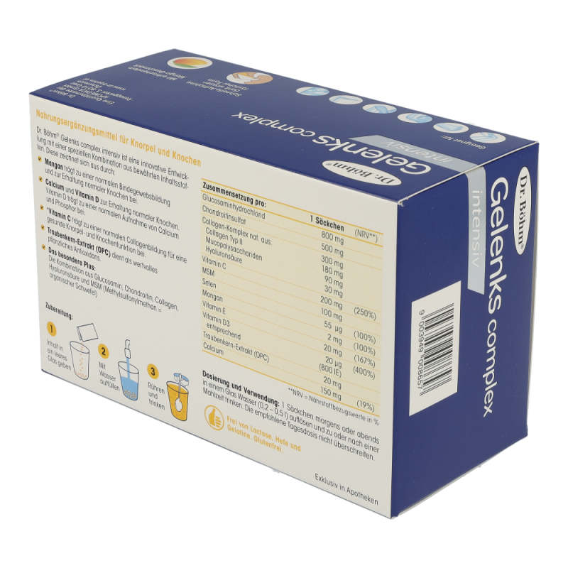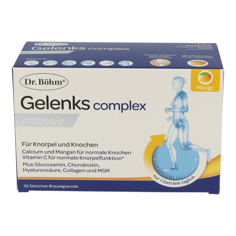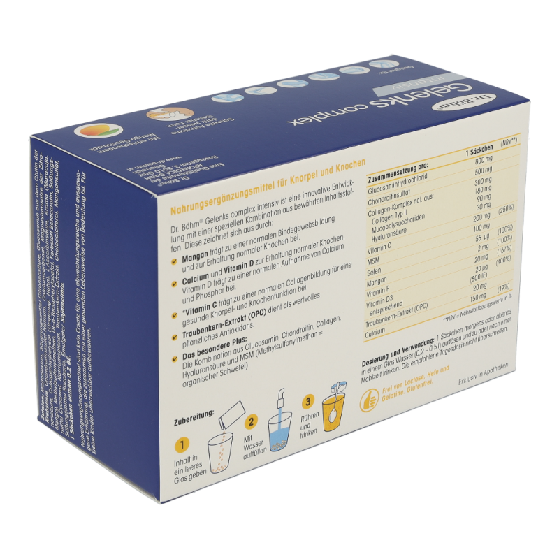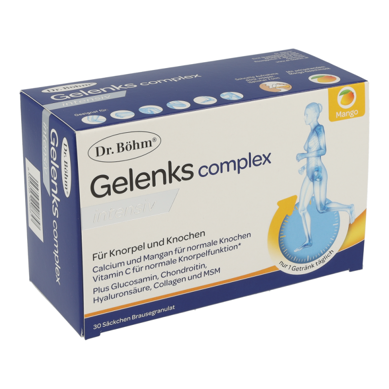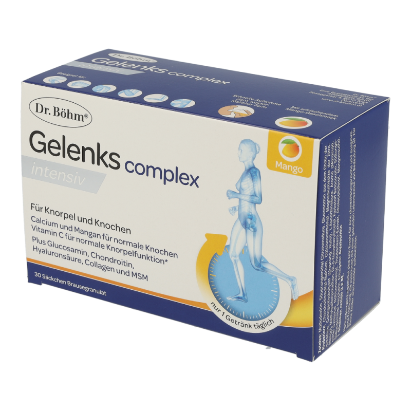 Mit Dr. Böhm® Gelenks complex intensiv unterstützen Sie Knorpel, Knochen und Bandscheiben mit gelenkspezifischen Vitaminen und Spurenelementen sowie den fünf wichtigsten Gelenkbestandteilen Glucosamin, Chondroitin, Collagen, Hyaluronsäure und MSM plus Calcium.