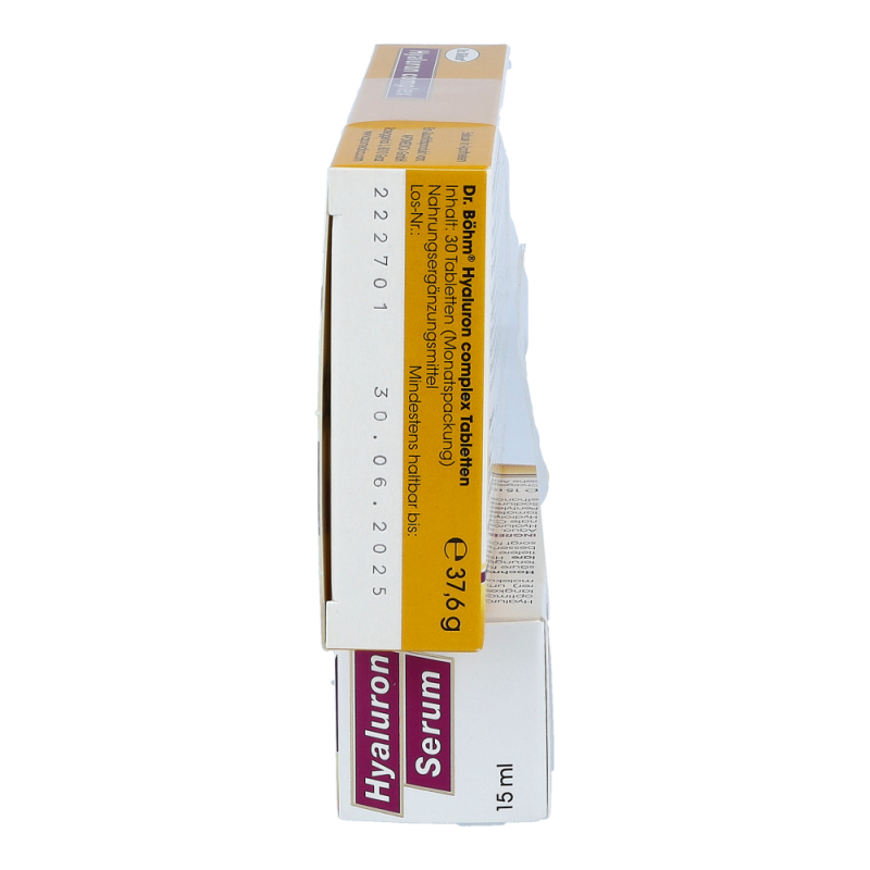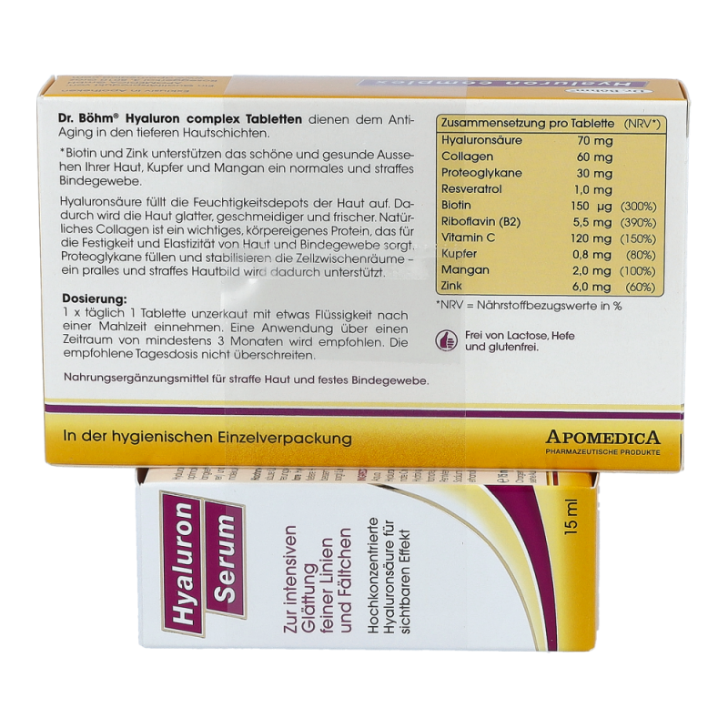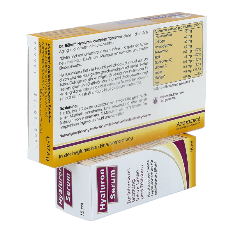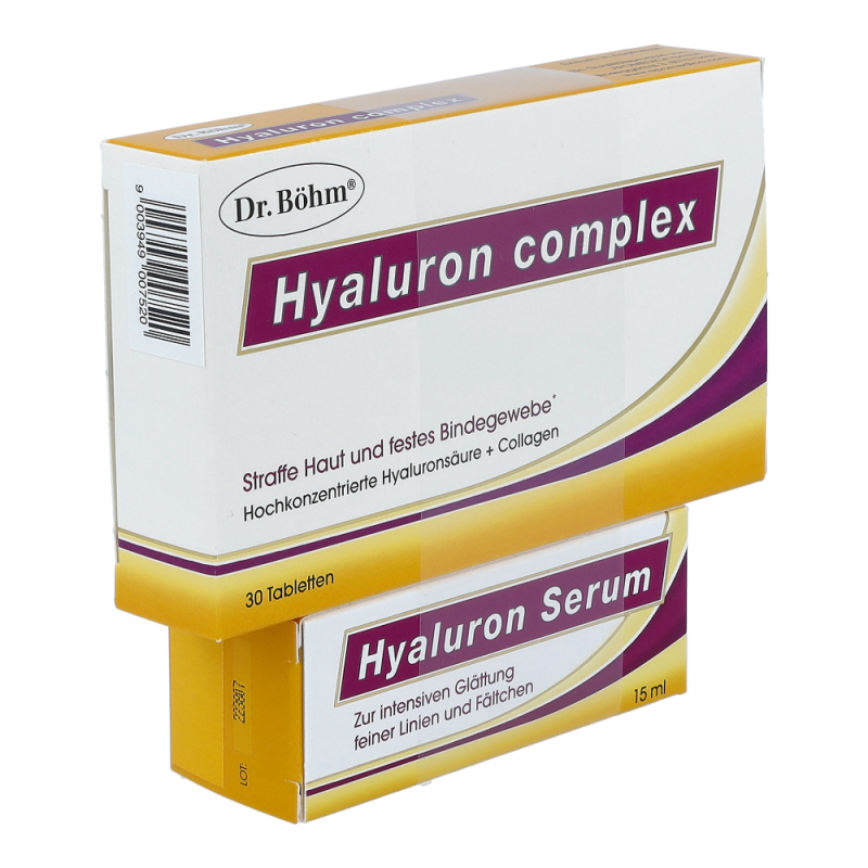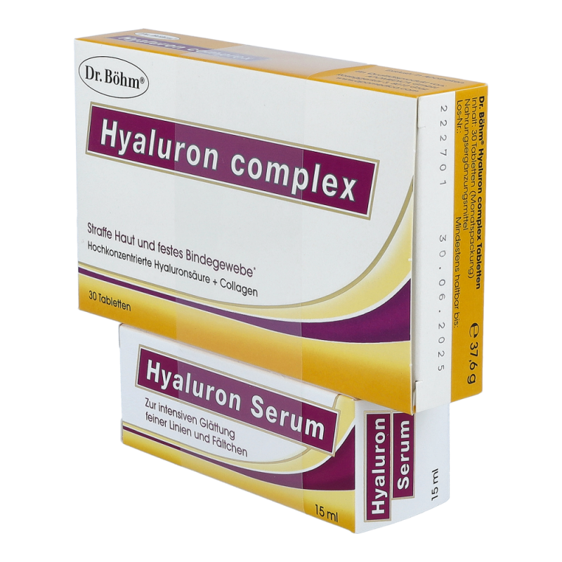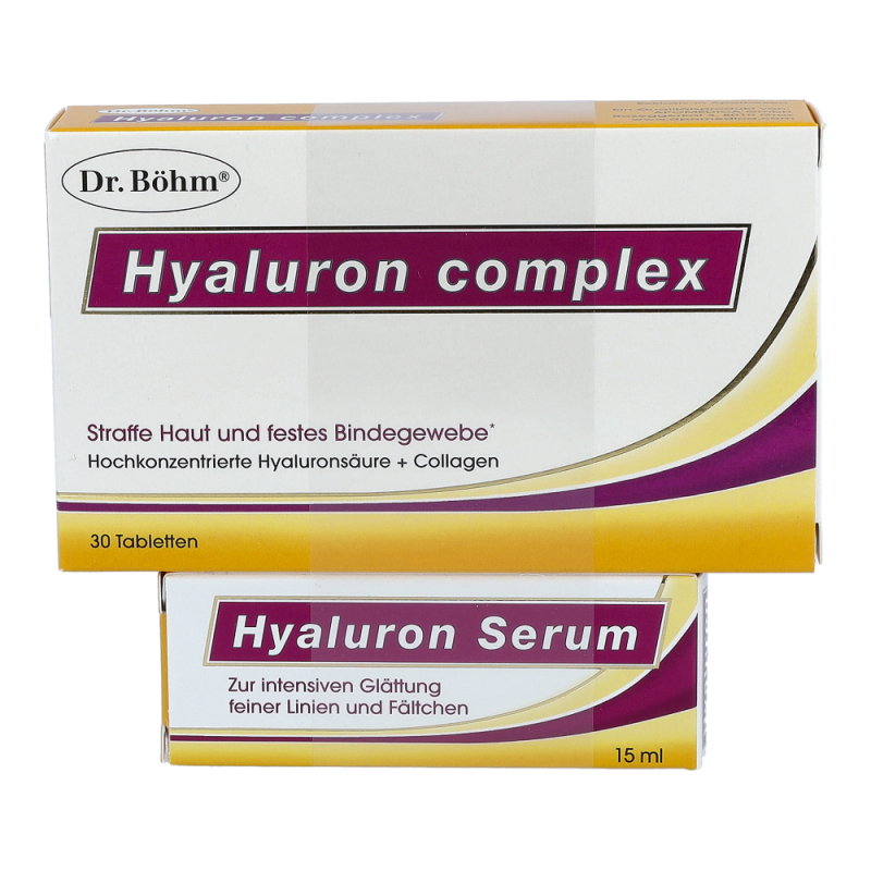Dr. Böhm Hyaluron Complex Tabletten + Hyaluron Serum zur Erhaltung einer straffen, schönen Haut und eines festen Bindegewebes. Die Tabletten enthalten die 3 wichtigsten Strukturelemente der Haut: hochdosierte Hyaluronäure für glatte Haut, Collagen für die Spannkraft und Proteoglykanen für ein festes Bindegewebe. Das Serum sorgt für eine sofortige Glättung feiner Linien und Fältchen und legt sich wie ein Feuchtigkeitsfilm auf die Hautoberfläche, die Haut sieht sofort frischer und glatter aus..