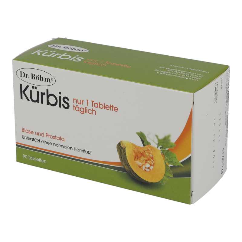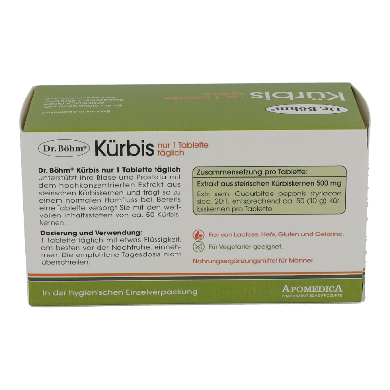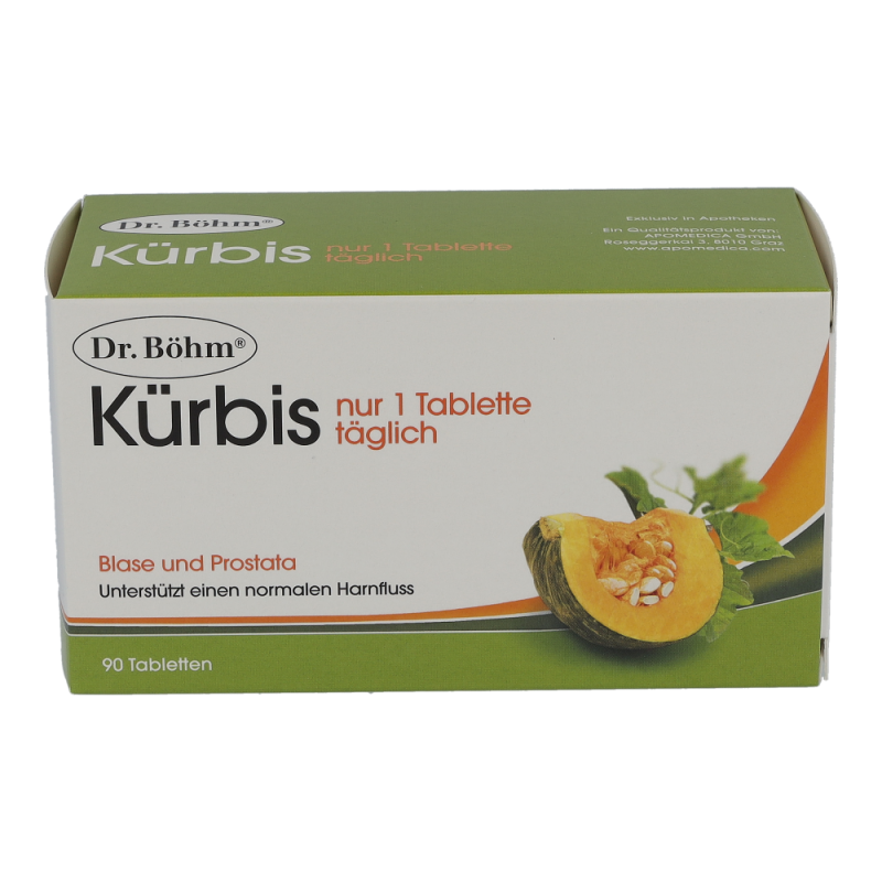 Dr. Böhm® Kürbis nur 1 Tablette täglich leistet einen natürlichen Beitrag zur Gesunderhaltung von Blase und Prostata.