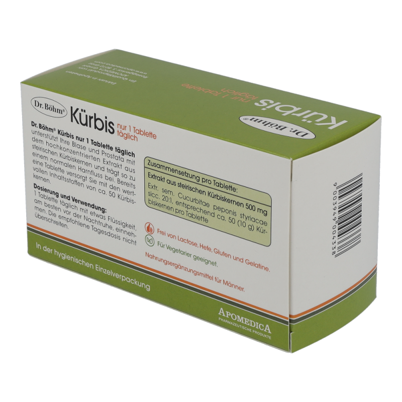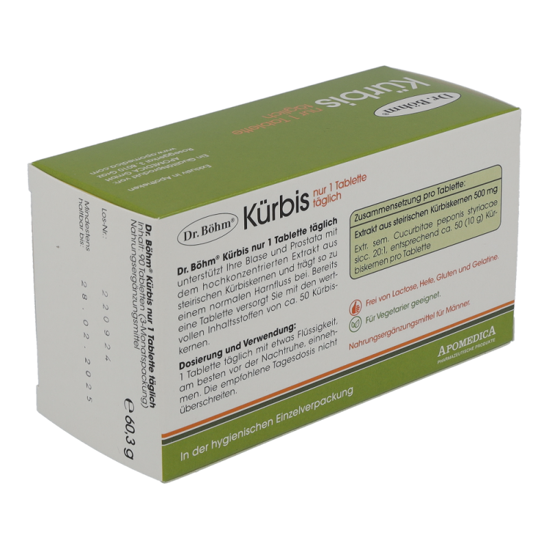 Dr. Böhm® Kürbis nur 1 Tablette täglich enthalten einen speziellen Extrakt aus steirischen Kürbiskernen in höchster Konzentration. Schon 1 Tablette entspricht der von Experten empfohlenen Menge von 10 g Kürbiskernen täglich. Behutsame und ausgewählte Extraktionsmethoden sowie eine Standardisierung auf aktive Wirkstoffe vervollständigen das Produkt. Trotz der hohen Konzentration an Inhaltsstoffen sind die Tabletten klein und leicht zu schlucken.