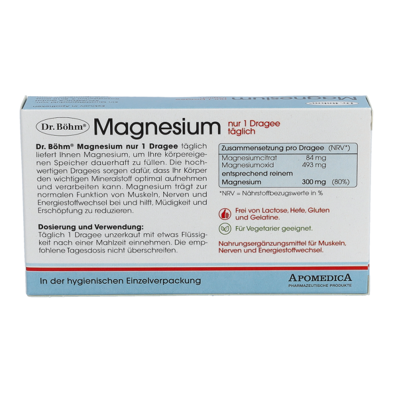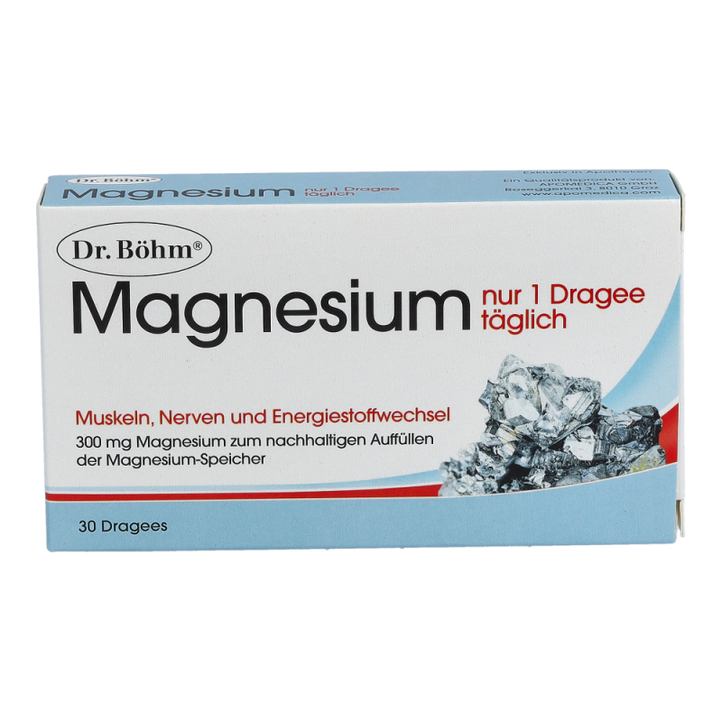 Dr. Böhm Magnesium Dragees leisten einen Teil für den langfristigen Aufbau eines idealen Magnesiumspiegels und sind zudem sehr leicht verträglich. Magnesium trägt zur normalen Funktion von Muskeln, Nerven und Energiestoffwechsel bei. Zusätzlich unterstützt es gesunde Knochen und Zähne und leistet einen wichtigen Beitrag zur Reduktion von Müdigkeit und Erschöpfung.