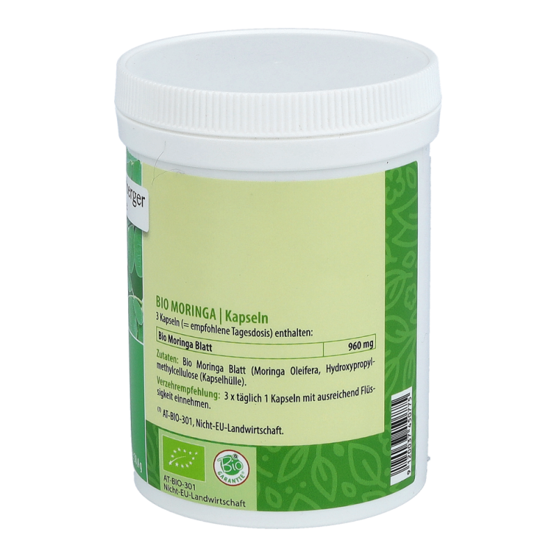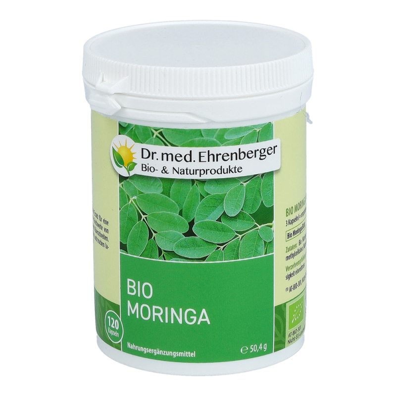 Dr. Ehrenberger Moringa Kapseln BIO ist ein Superfood, welches sich bereits in unzähligen Lebensmitteln enthalten ist. Mit über 90 Nährstoffen gilt die Pflanze als wahres Nährstoffwunder. Zusammen mit Spirulina gilt Moringa als ein Lebensmittel, welches Hunger und Mangelernährung in der Welt schon durch kleine Mengen reduzieren können. Das Produkt ist 100% biologischen Ursprungs.