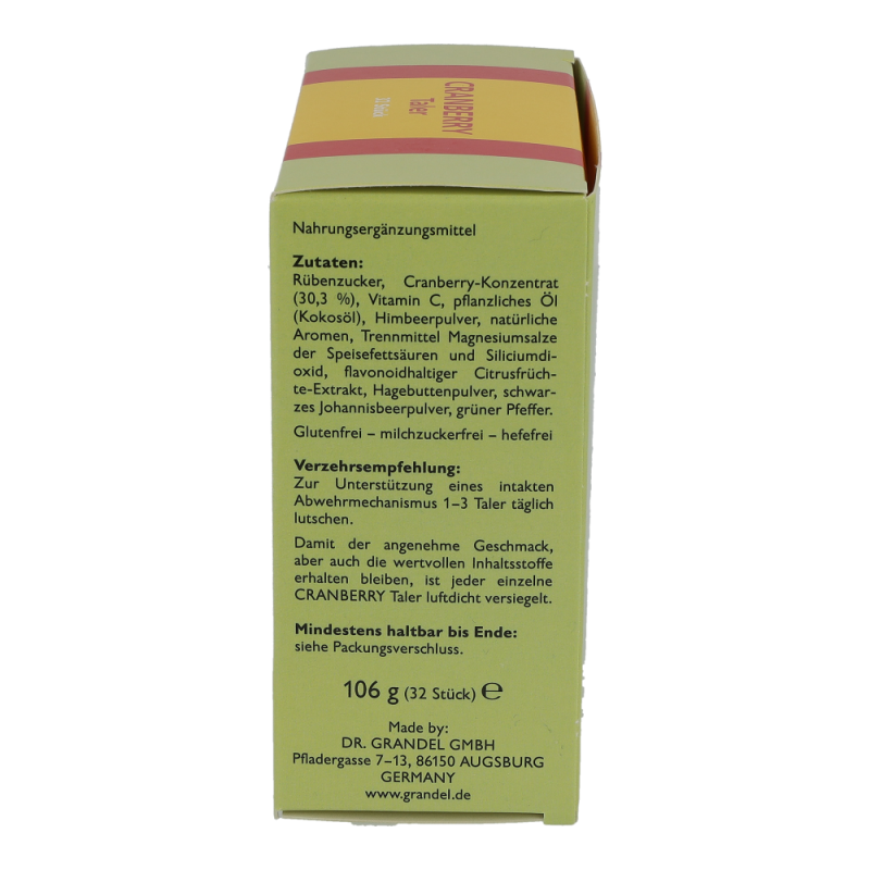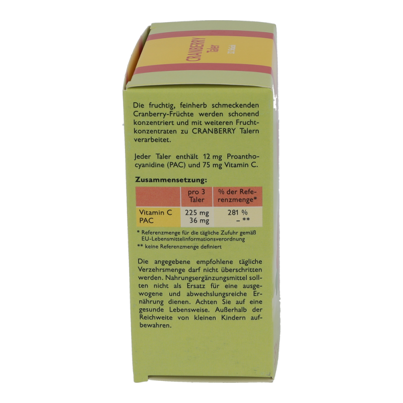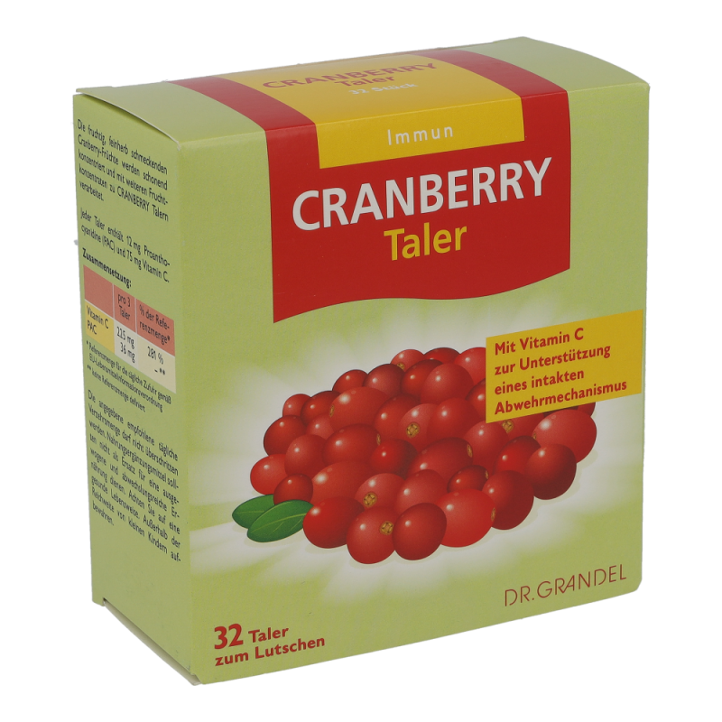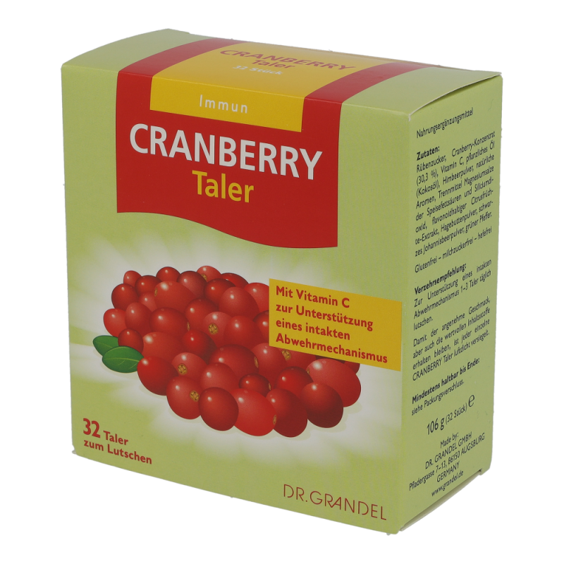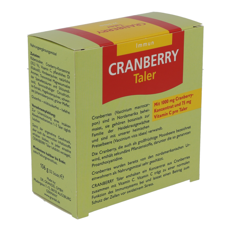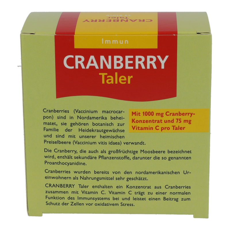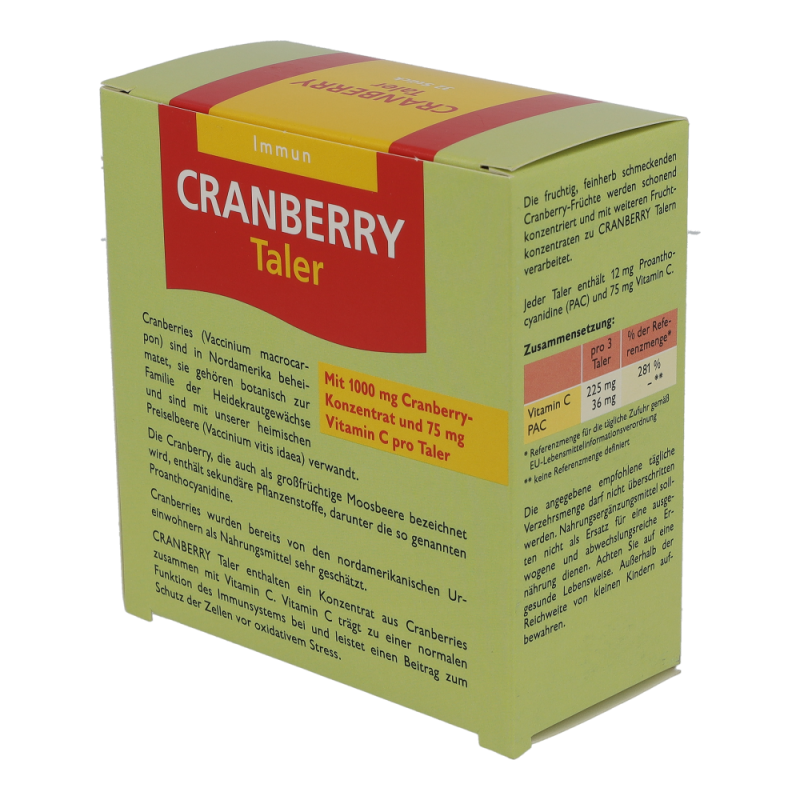 Cranberry Taler enthalten ein Konzentrat aus Cranberries zusammen mit Vitamin C. Vitamin C trägt zu einer normalen Funktion des Immunsystems bei und leistet einen Beitrag zum Schutz der Zellen vor oxidativem Stress.