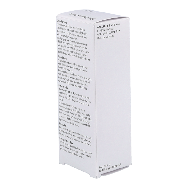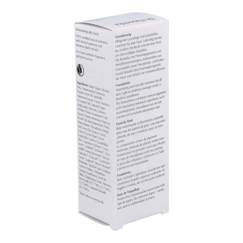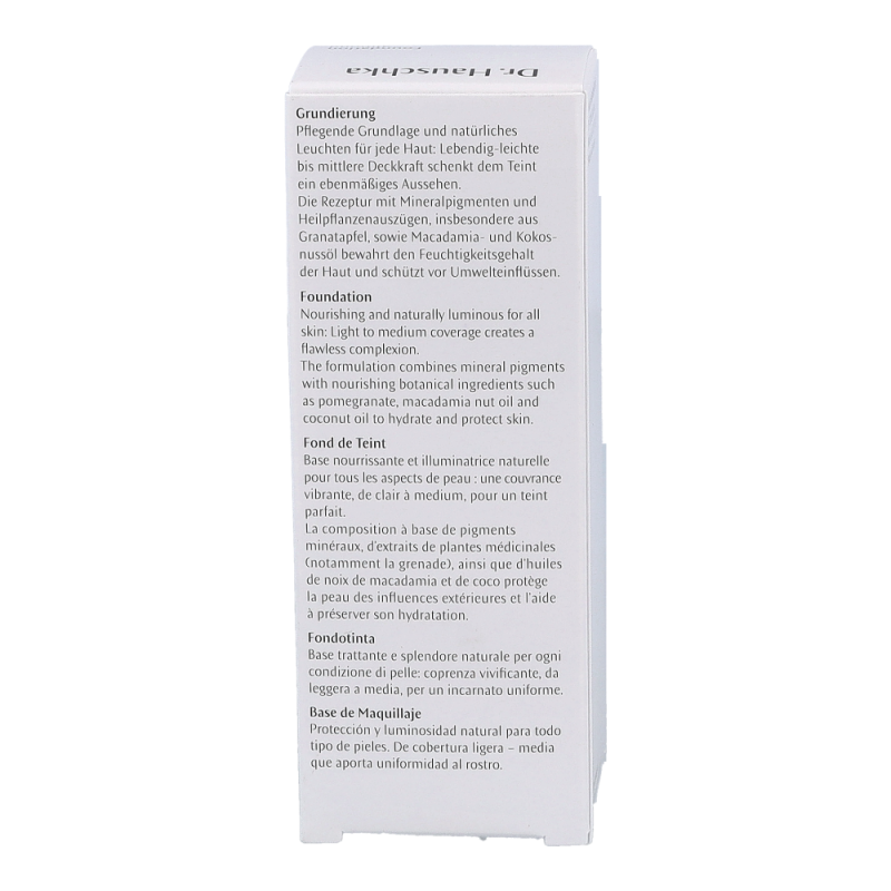 Dr. Hauschka Foundation ist die ideale pflegende Grundlage für jede Haut. Der Teint erhält durch die lebendig-leichte bis mittlere Deckkraft ein ebenmäßiges Aussehen. Die Rezeptur mit Mineralpigmenten und Heilpflanzenauszügen, insbesondere aus Granatapfel sowie Macadamia- und Kokosnussöl, bewahrt den Feuchtigkeitsgehalt der Haut und schützt vor Umwelteinflüssen.