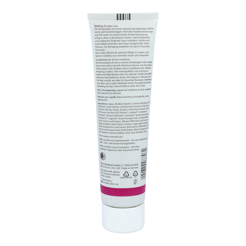 Dr. Hauschka Haarpflege Spülung 150 ml verleiht Glanz und Geschmeidigkeit, ohne zu beschweren. Nach dem Waschen ist Ihr Haar bereit für pflegende Substanzen, die es stärken und schützen. Die Dr. Hauschka Haarpflege Spülung kombiniert hochwertige pflanzliche Öle mit natürlichen Proteinen und regenerierenden Heilpflanzenauszügen. Hinzu kommt Apfelessig, um Kalkreste zu lösen und die Haaroberfläche zu glätten und damit für Glanz zu sorgen. Die Haapfelgespülung von Dr. Hauschka ist ohne Silikone und eignet sich für jedes Haar, besonders für langes, strapaziertes, trockenes oder glanzloses Haar und bei Haarspliss. Kämm- und Frisierbarkeit wird verbessert, fliegende Haare verhindert. Vanille und weiße Blüten schenken dem Haar cremigen Duft.