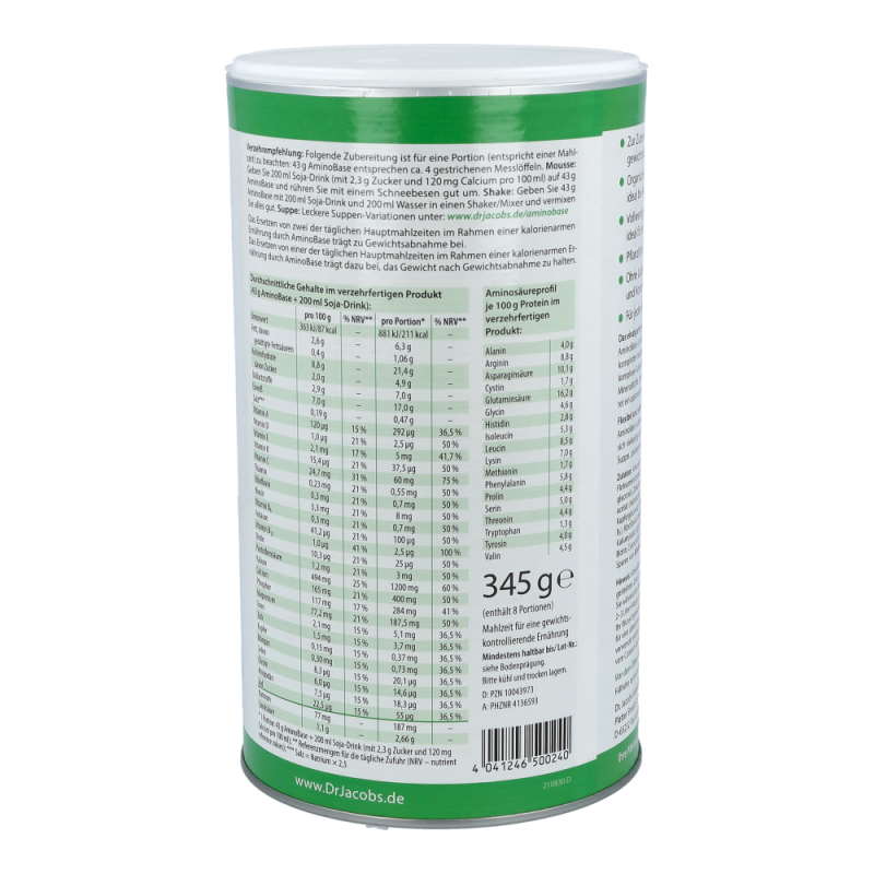 43 g AminoBase (entspricht 4-5 Messlöffeln) mit 200 ml Soja-Drink (mit 2,3 g Zucker und 120 mg Calcium pro 100 ml) anrühren. Nach Geschmack mit SteviaBase süßen.