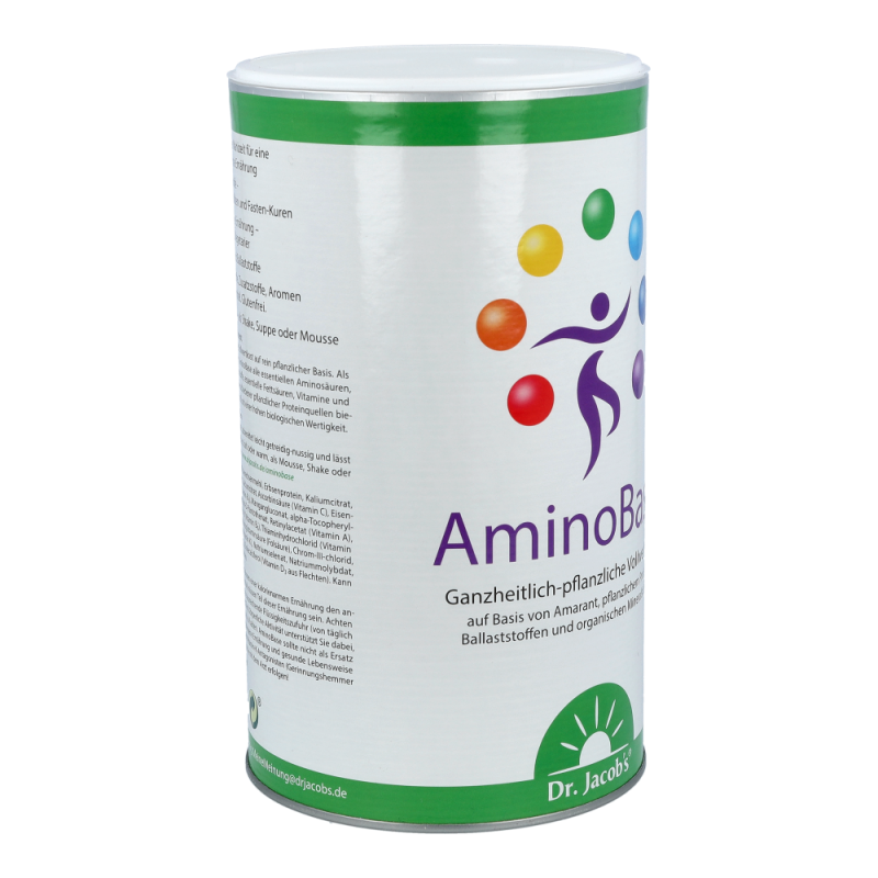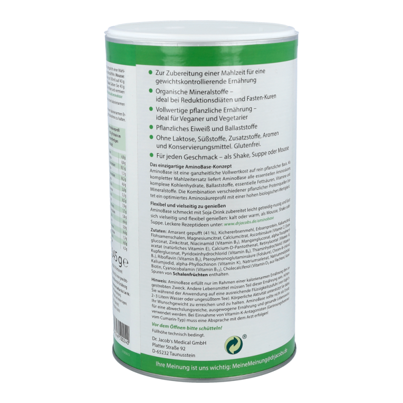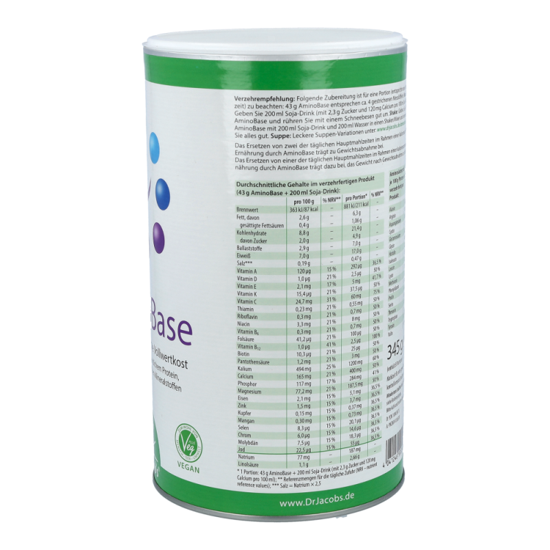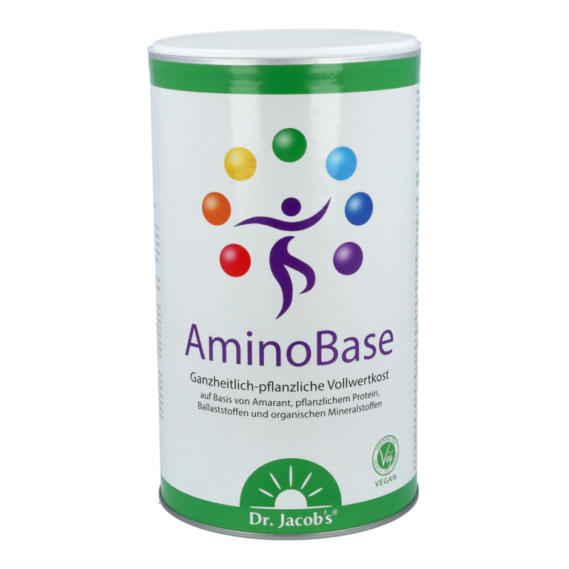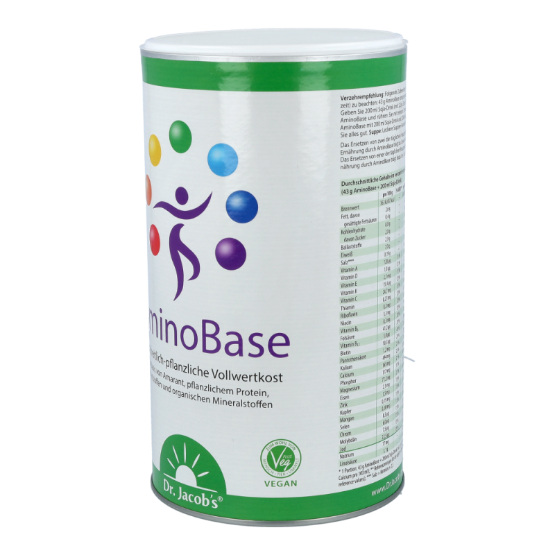 AminoBase liefert einen vollwertigen Mahlzeitersatz ohne Laktose und Gluten auf rein pflanzlicher Basis. Mit allen wichtigen Nährstoffen in einem natürlichen Verhältnis bietet es dem Körper eine rundum gesunde Grundversorgung. AminoBase enthält alle essentiellen Aminosäuren, essentielle Fettsäuren, komplexe Kohlenhydrate, Ballaststoffe, Mineralstoffe und Vitamine. Es ist reich an Zink, das den normalen Säure-Basen-Stoffwechsel unterstützt.