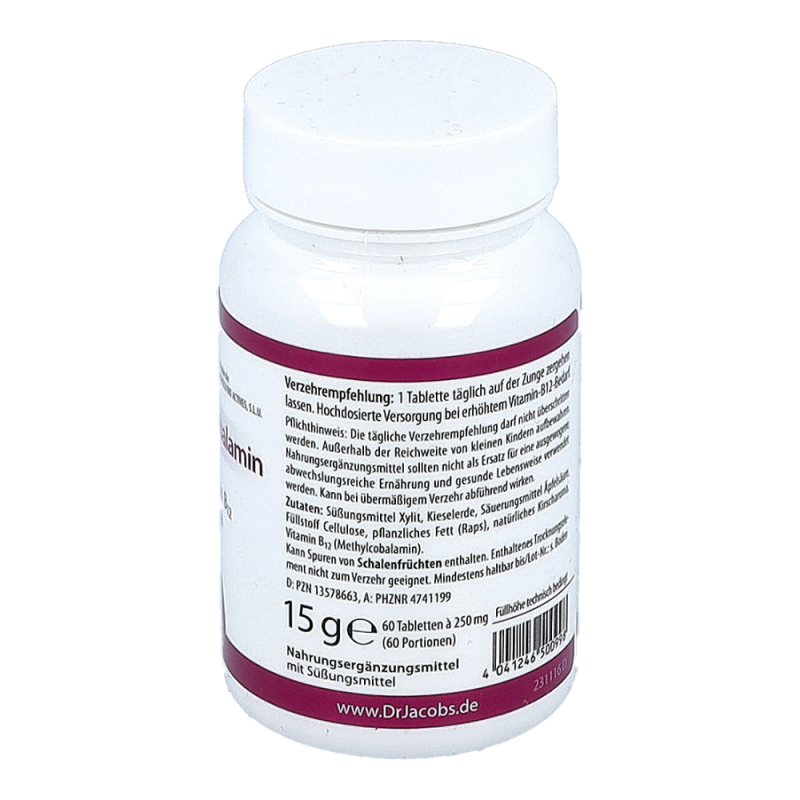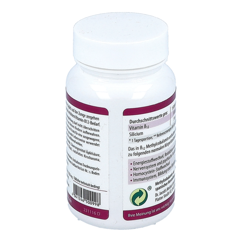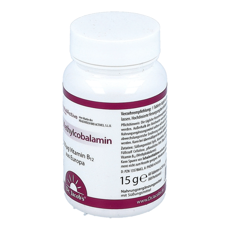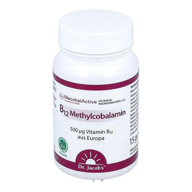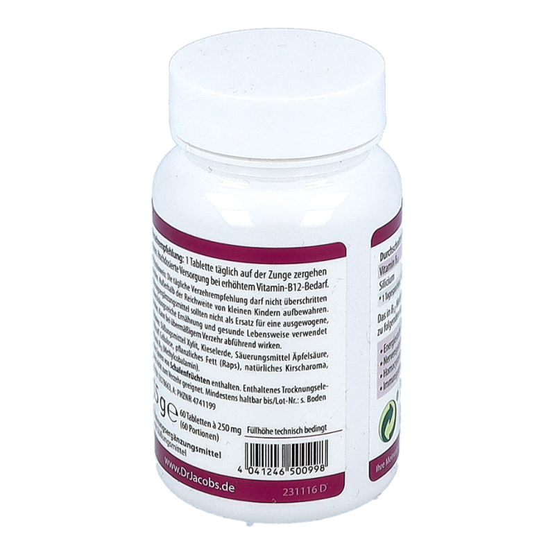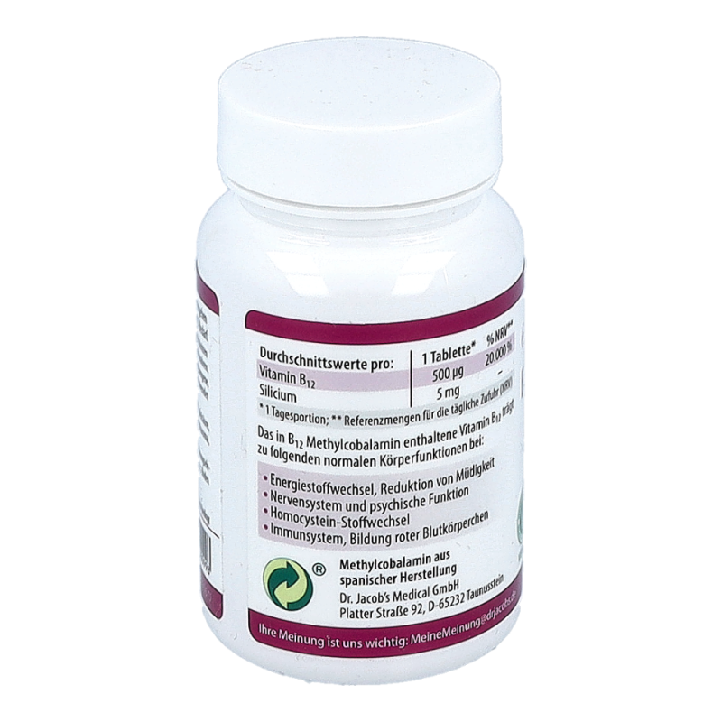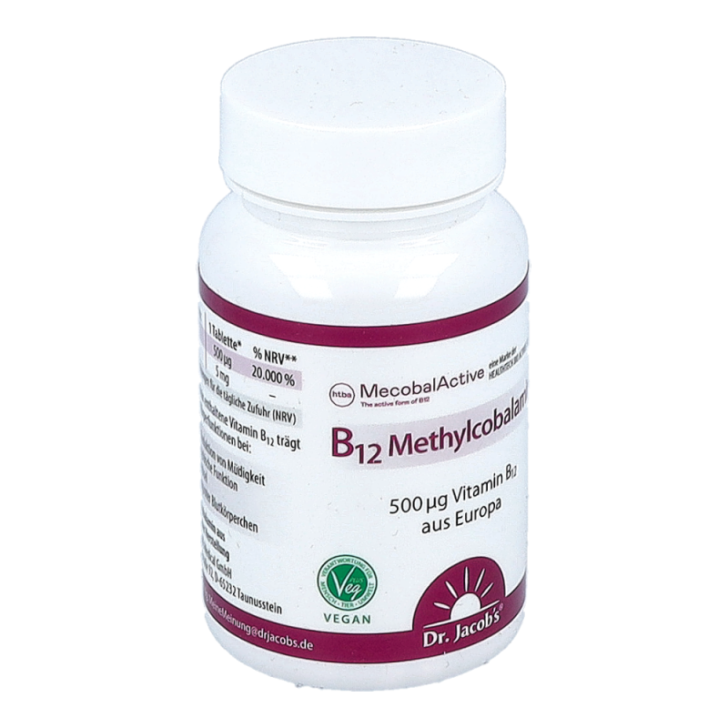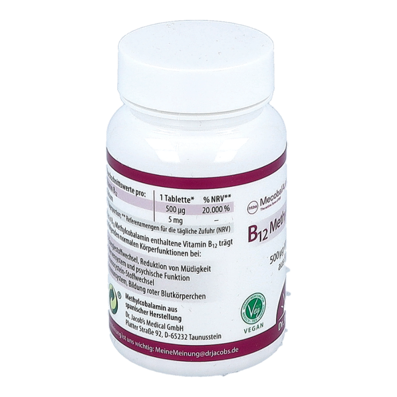 Dr. Jacob’s B12 MecobalActive Methylcobalamin Tabletten bieten das reinste Vitamin B12 hochdosiert und vegan. Vitamin B12 ist gut für Nerven, Energie, weniger Müdigkeit, sowie die Bildung roter Blutkörperchen. Die Ideale Ergänzung für eine Vegane Ernährung
