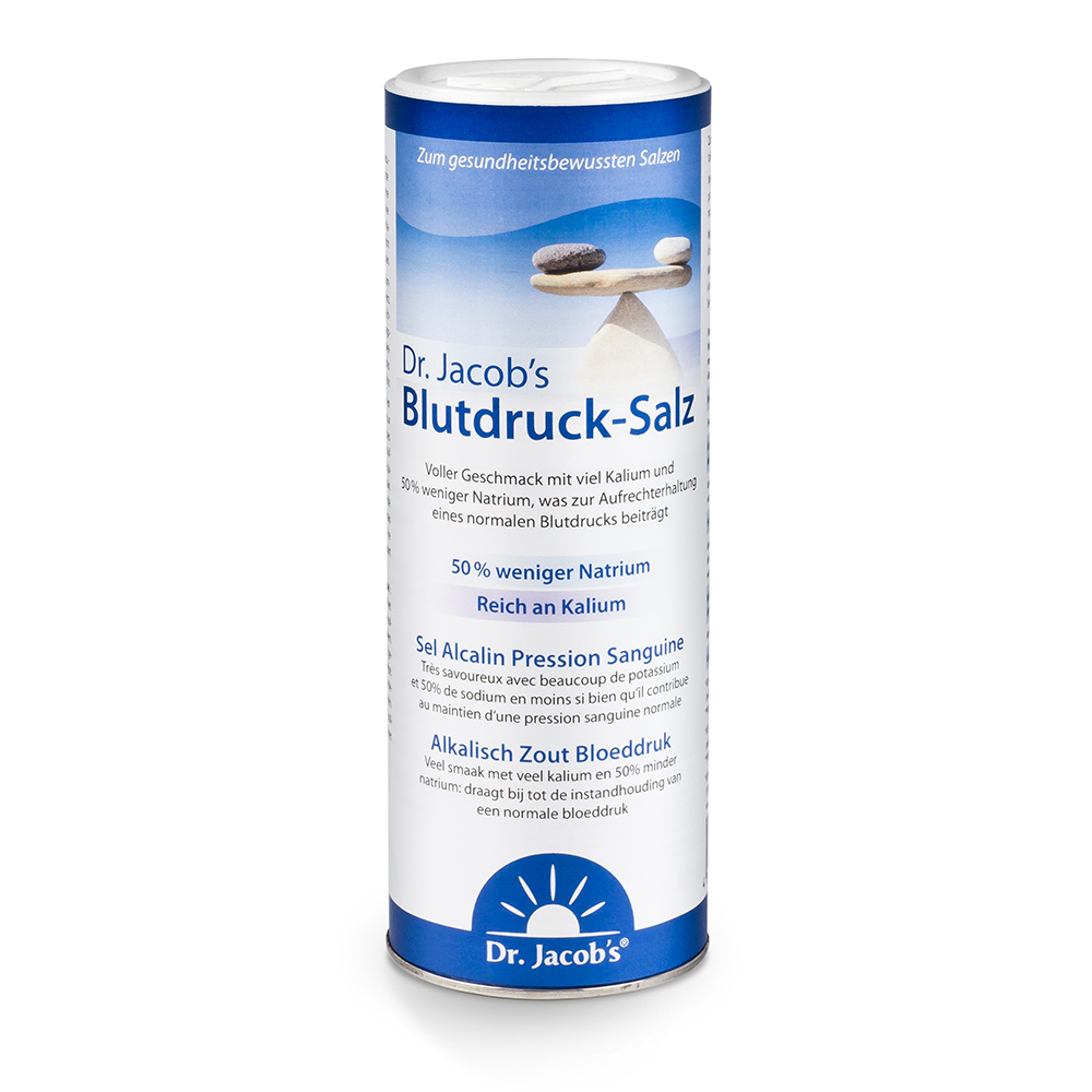 Dr. Jacob“s Blutdruck-Salz ist ein Mineralsalz, das natriumreduziert ist. Es enthält Natriumcitrat als Hauptbestandteil, Kaliumchlorid sowie Kristallsalz vom Rande des Himalaya-Gebietes. Es eignet sich für eine kochsalzreduzierte Ernährung.