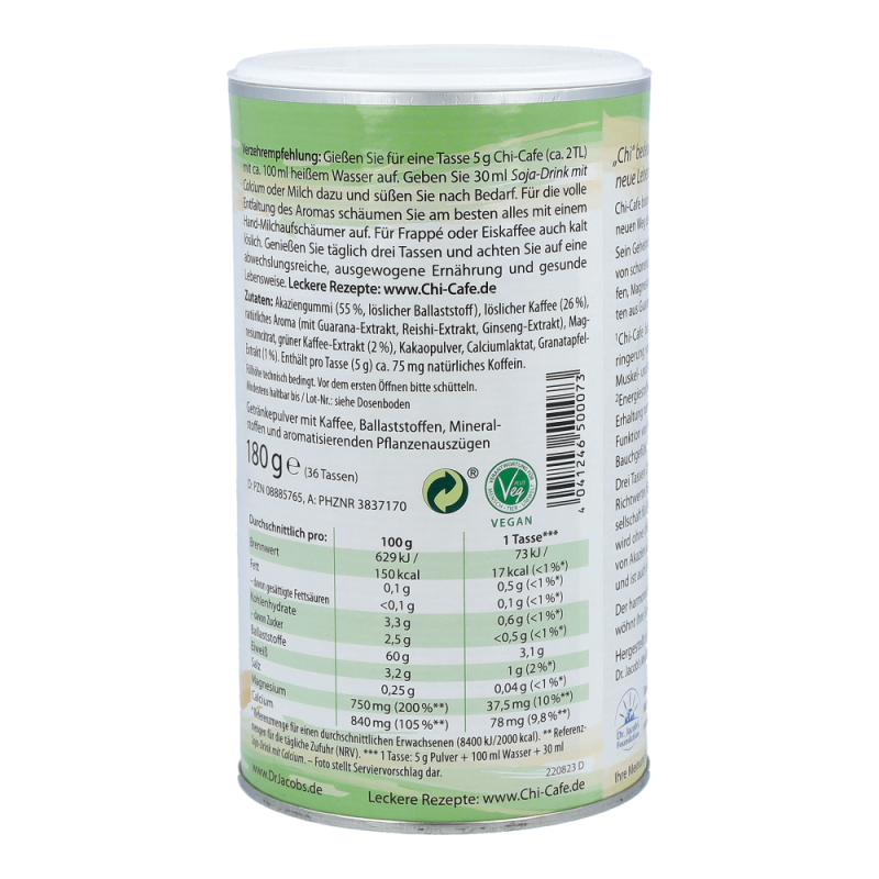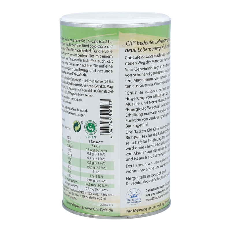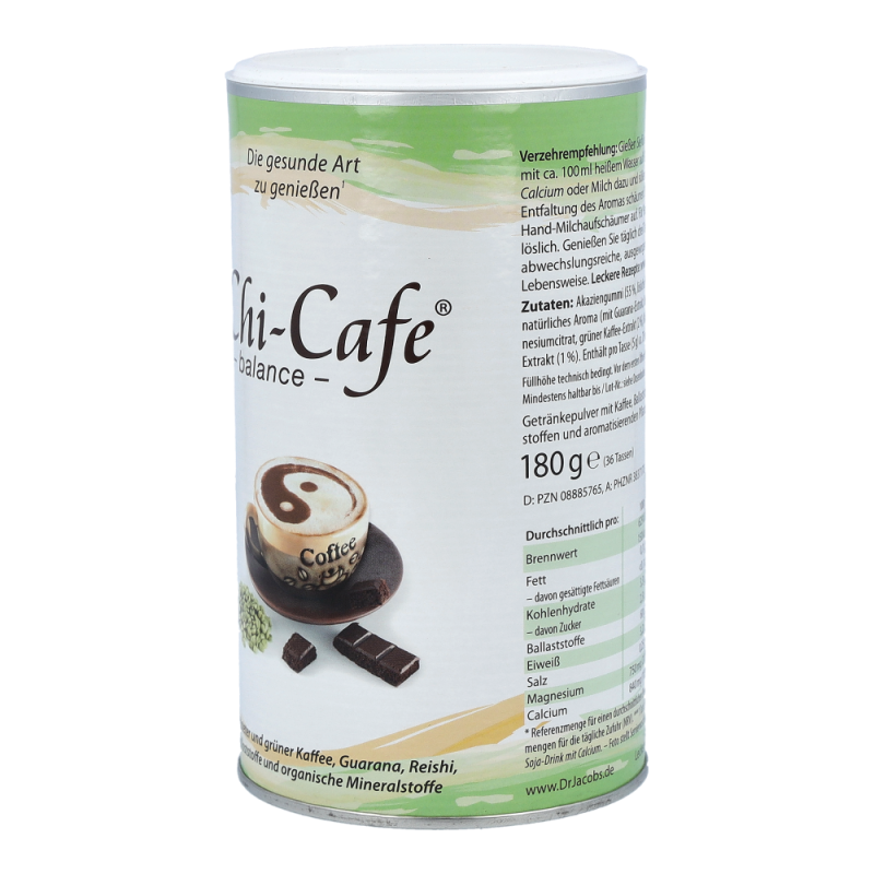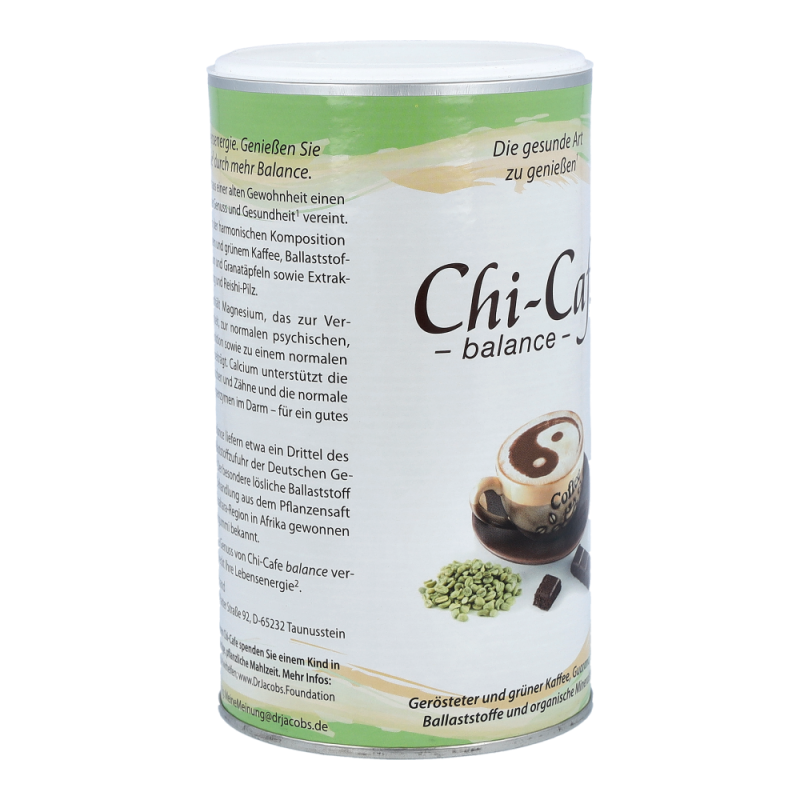 Chi-Cafe balance von Dr. Jacob’s Medical ist harmonisch mild, schmeckt besonders cremig und wird abgerundet durch eine dezente Kakao-Note. Lösliche Ballaststoffe aus der Akazienfaser, löslicher Kaffee, die basischen Mineralstoffe Calcium und Magnesium sowie Polyphenole aus Ginseng, Granatapfel, Guarana, Reishi-Pilz, grünem Kaffee und Kakao machen die besondere Zusammensetzung aus. 75 % der deutschen Frauen nehmen zu wenig Ballaststoffe auf (NVS2). Die Deutsche Gesellschaft für Ernährung empfiehlt pro Tag eine Aufnahme von 30 g. Drei Tassen Chi-Cafe balance liefern bereits ca. 10 g Ballaststoffe.