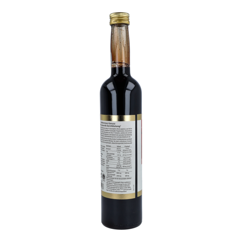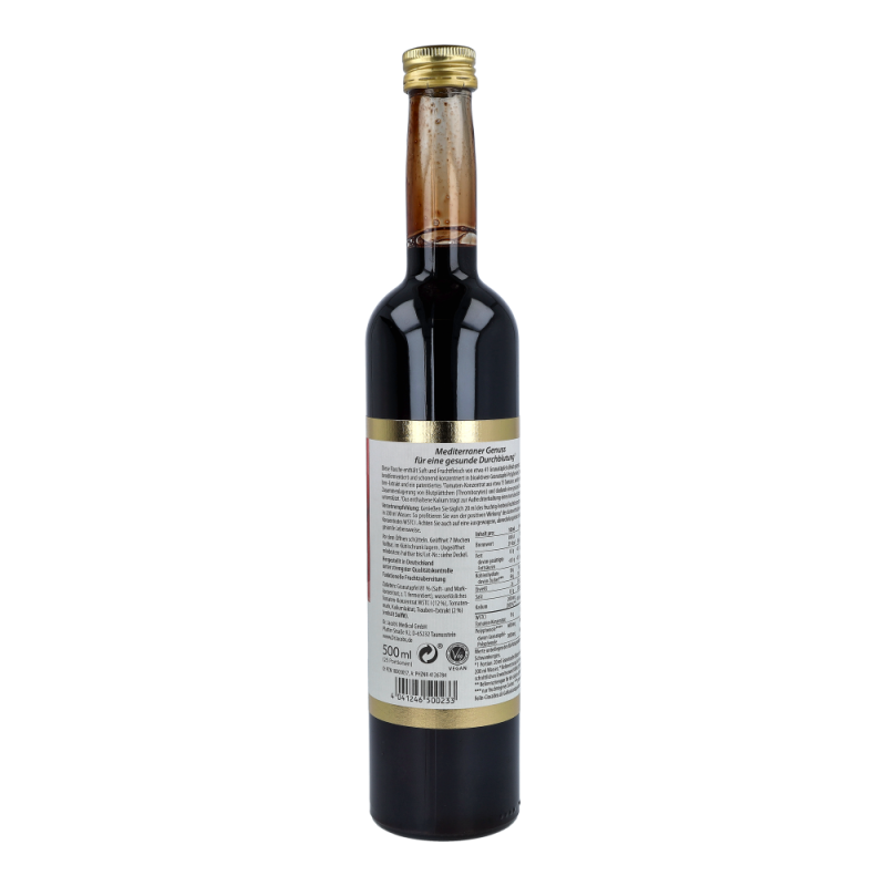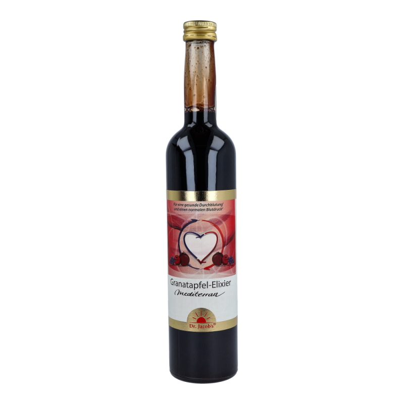 Dr. Jacobs Granatapfel Elixier mediterran wird in Deutschland unter strengster Qualitätskontrolle hergestellt. Es enthält in jeder Flasche den Saft und das Fruchtfleisch von 41 sonnengereiften Granatäpfeln – frisch gepresst, schonend verarbeitet und mit bioaktiven, lebend fermentierten Granatapfel-Polyphenolen. Das patentierte Tomaten-Extrakt unterstützt die gesunde Durchblutung.