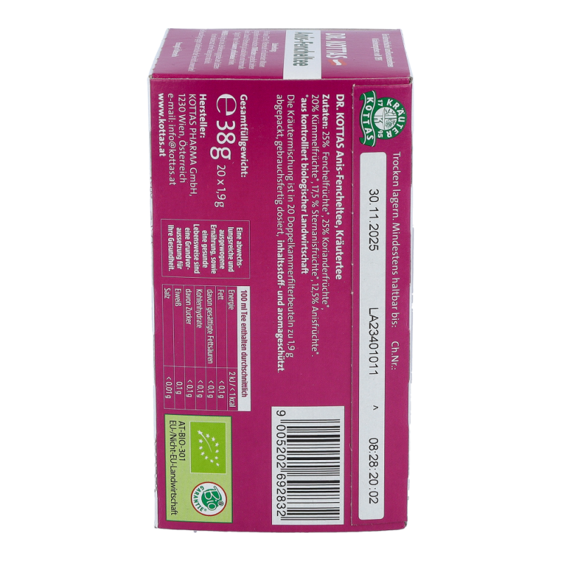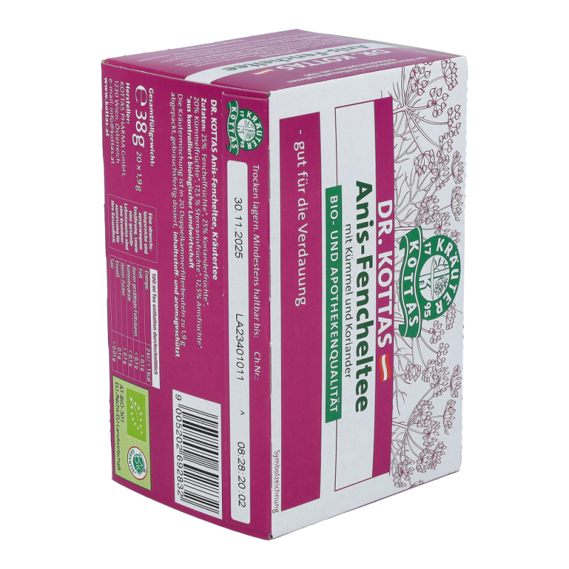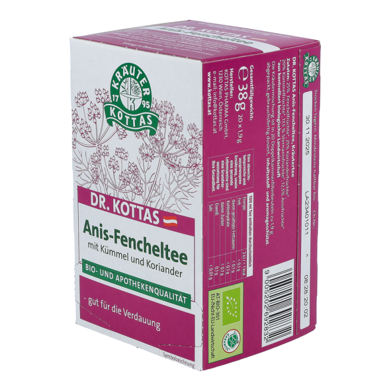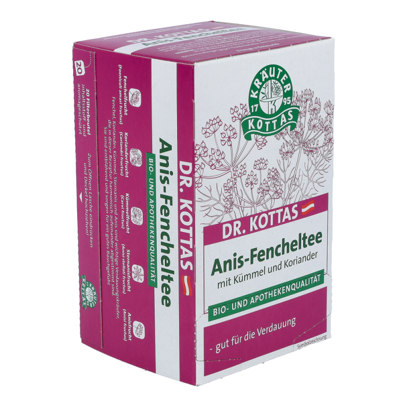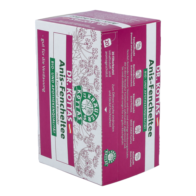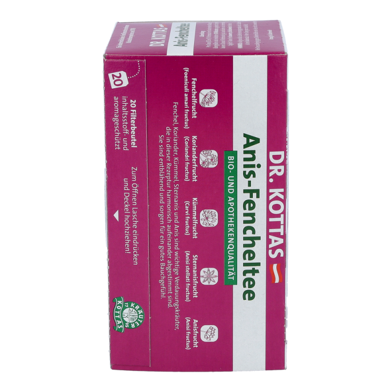 Dr. Kottas Anis-Fenchel-Tee hilft bei Blähungen und krampfartigen Magen- und Darmbeschwerden, sowie bei ernährungsbedingten Gasansammlungen im Magen-Darmbereich.