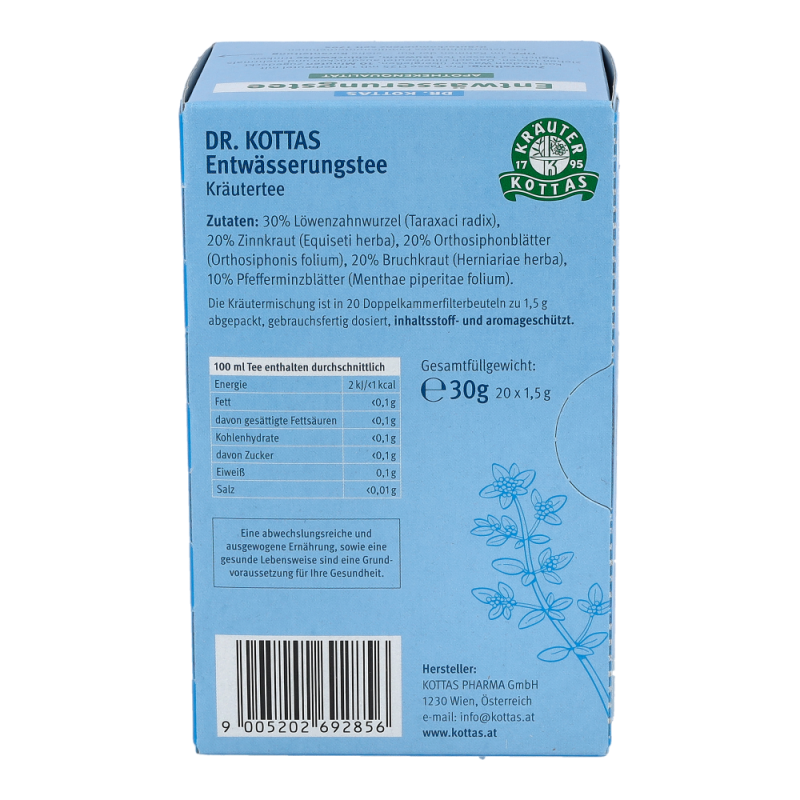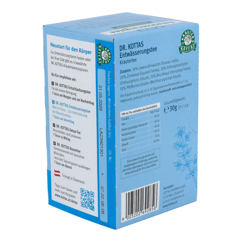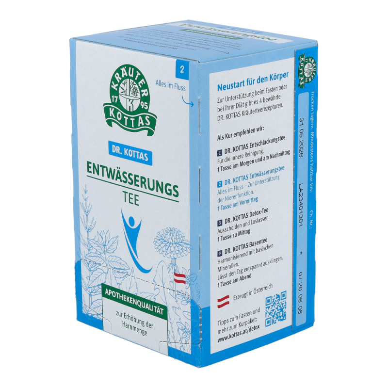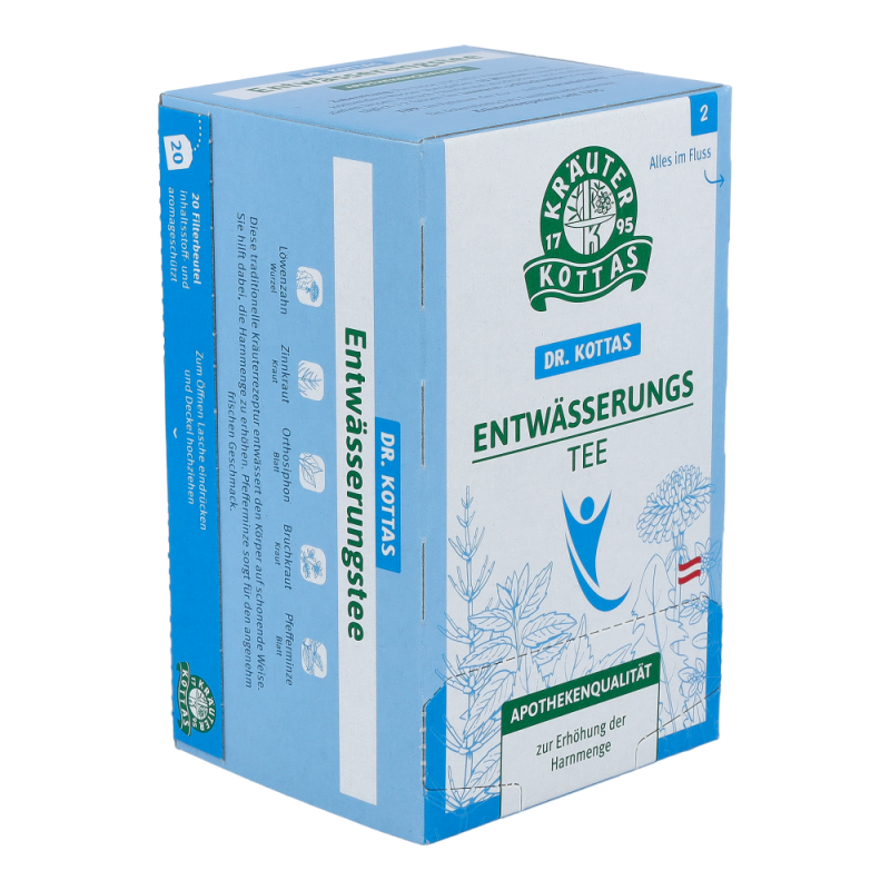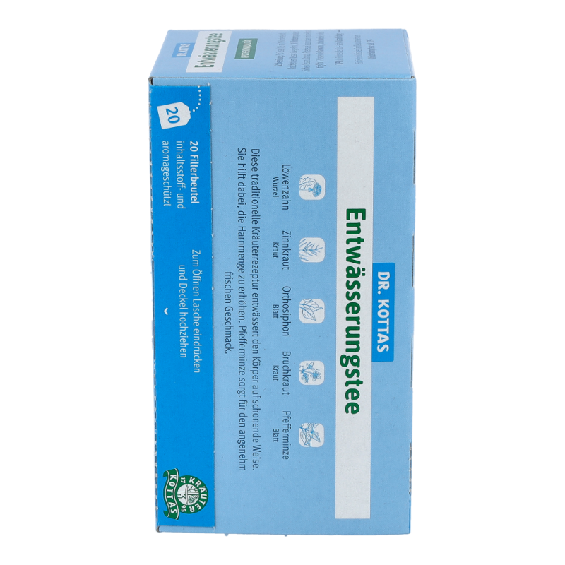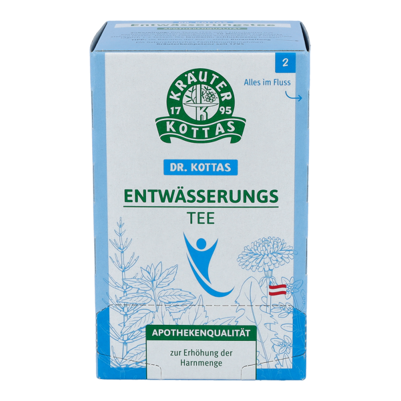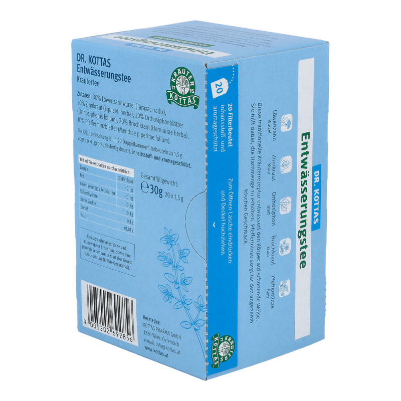 Dr. Kottas Entwässerungstee eignet sich sehr gut zum Durchspülen der ableitenden Harnwege. Er steigert die Harnausscheidung, wirkt verdauungsaktivierend und fördert die Ausscheidung von Abbauprodukten.