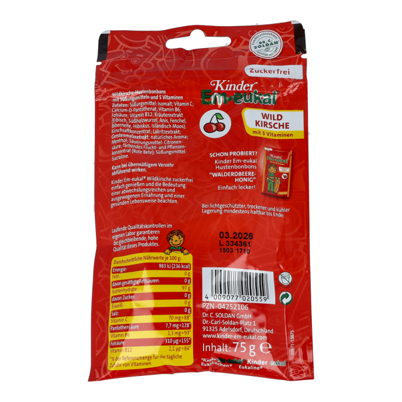 Dieses Markenzeichen garantiert höchste Qualität. Bis in die 1950er Jahre von Ärzten verschrieben und dank sorgfältigster Rohstoffauswahl bis heute unerreicht. Für Em-eukal(r) werden nur hochwertigste natürliche Zutaten wie Extrakte, Öle und Aromen verwendet.Wirksamer Schutz auf gesunde Weise: Diese besonderen Zuckerlspezialitäten bestechen nicht nur durch ihren unverwechselbaren Geschmack. Sie sind vor allem eine wertvolle Wohltat in höchster Dr. C. SOLDAN® Qualität. "Das erste Vitamin-Hustenbonbon für Kinder überhaupt."