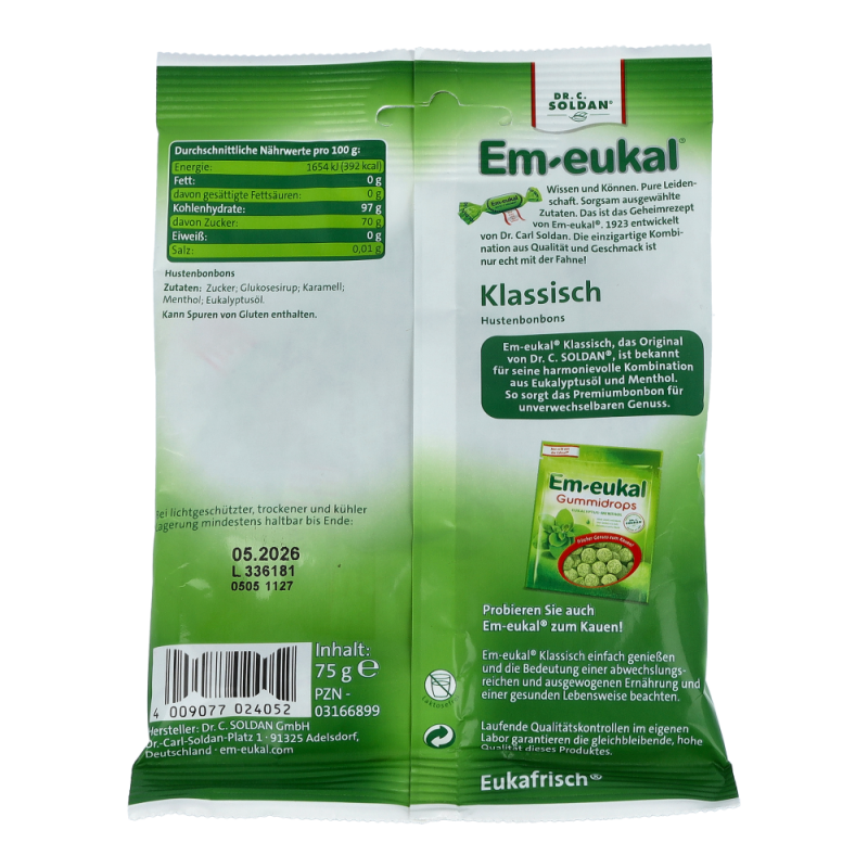 Dr. Soldan Euka-Menthol Hütchen sind umhüllt von einem zarten Zuckermantel und enthalten natürliches Eukalyptusöl und Menthol. Euka-Menthol Hütchen – Naschvergnügen für anspruchsvolle Genießer.