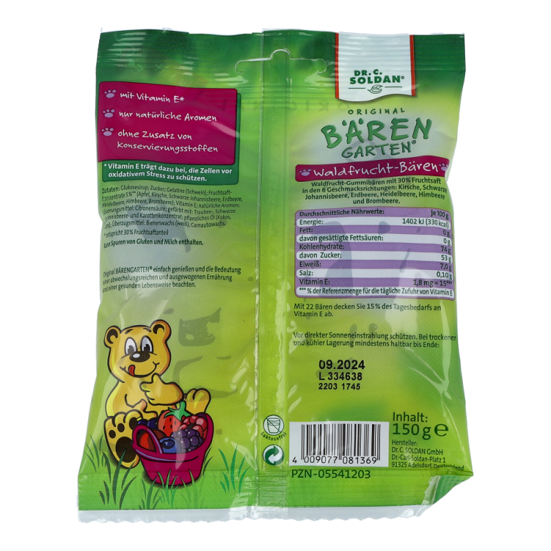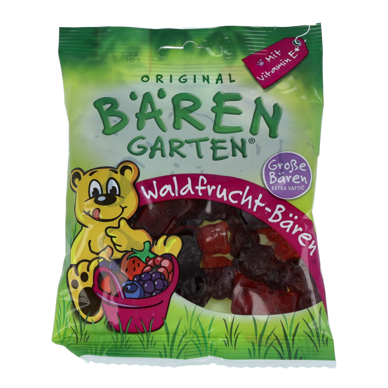 "Waldiger Fruchtgenuss. Bäriger Schutz. Diese Waldfrucht-Bären lassen sich nicht einfach nur vernaschen. Sie tun auch noch gut. Angereichert mit Antioxidantien aus wertvollem Vitamin E hilft jeder dieser kleinen Bären, die Zellen zu stärken. Sorgfältig hergestellt mit einem 30 Prozent hohen Fruchtsaftanteil gibt es den bärig-saftigen Schutz in Himbeere, Erdbeere, Heidelbeere, Schwarze Johannisbeere, Wildkirsche und Brombeere. Zutaten: Glukosesirup, Zucker, Gelatine, Fruchtsaftkonzentrate (Apfel, Heidelbeere, Schwarze Johannisbeere, Brombeere, Himbeere, Wildkirsche, Erdbeere) 4,7g/100g*), Vitamin E, Acerola-Fruchtpulver, gefärbt mit: Traubensaft-, Schwarze Johannisbeer- und Karottenkonzentrat, natürliche Aromen, Säuerungsmittel: Zitronensäure, Trennmittel: Öl (pflanzlich), Überzugsmittel: Bienen- und Carnaubawachs. *) entspricht 30% Fruchtsaftanteil"