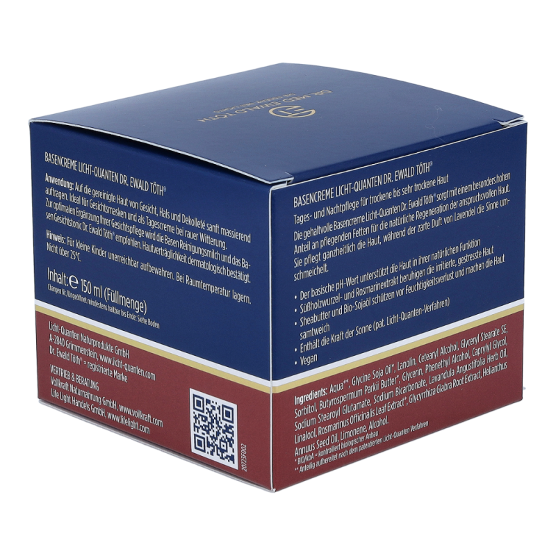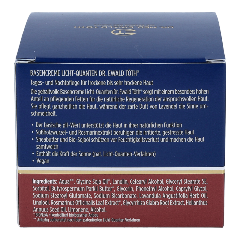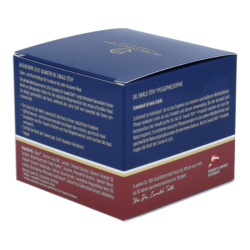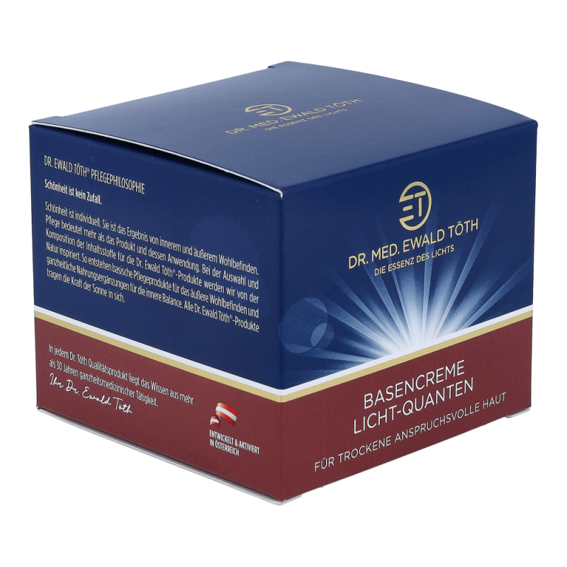 Dr. Ewald Töth Basen Licht-Quanten Creme ist ideal für trockene bis sehr trockene Haut geeignet. Gehaltvolle Gesichtscremen zählen zu den wichtigsten Nährstoff-Lieferanten für die Haut. Die Creme ist eine gehaltvolle Pflegecreme mit einem besonders hohen Anteil an pflegenden Fetten für die natürliche Regeneration der anspruchsvollen Haut. Die hautnatürliche Basenbalance bleibt dank basischem pH-Wert bewahrt. Wir bieten Ihnen die komplette Auswahl einer österreichischen Standortapotheke